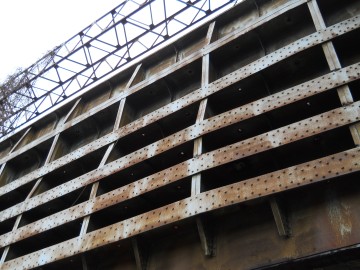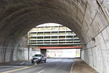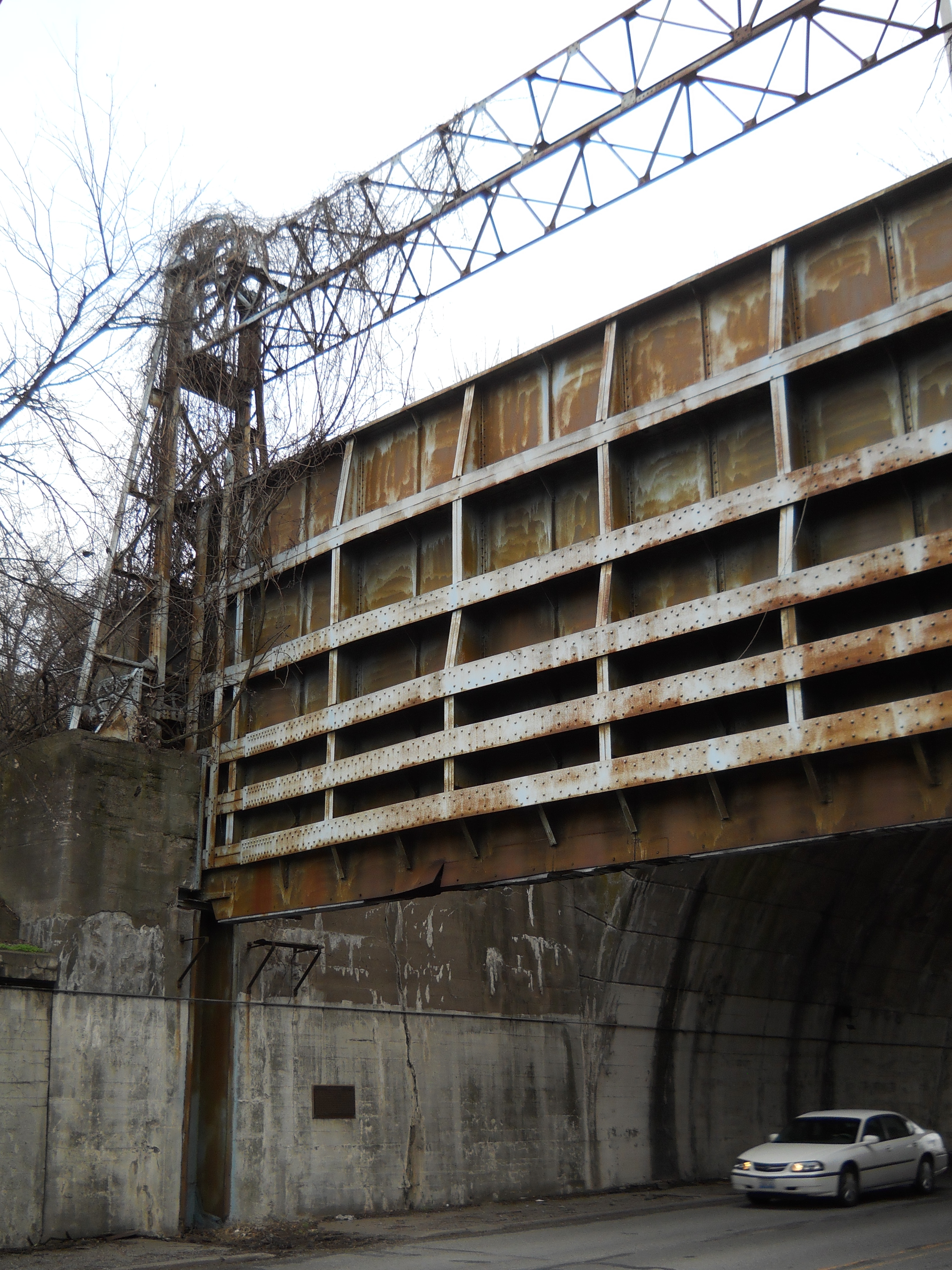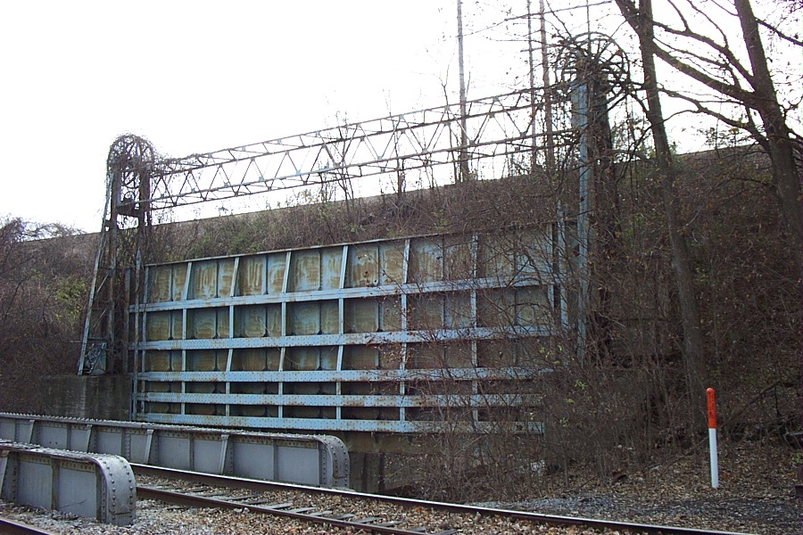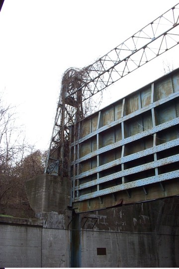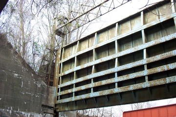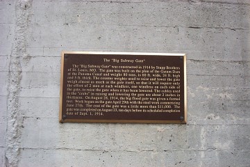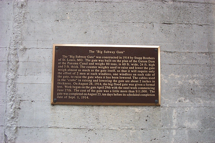 The "Big Subway Gate" was constructed in 1914 by Stupp Brothers of St. Louis, MO. The gate was built on the plan of the Gatum Dam at the Panama Canal and weighs 80 tons, is 60 feet wide, 24 feet high and five feet thick. The counterweights used to raise and lower the gate weigh almost as much as the gate itself, so that it will only require the effort of 2 men at each windless, one windless on each side of the gate, to raise the gate when it has been lowered. The cables used in the "crabs" in raising and lowering the gate are about 2 inches in thickness. Work began on the gate April 29th with the steel work commencing June 27th. The gate was completed on August 23, ten days before its scheduled completion date of September 1, 1914. On August 28, 1914, the big flood gate was given a formal test. The cost of the gate was a little more than $11,000.