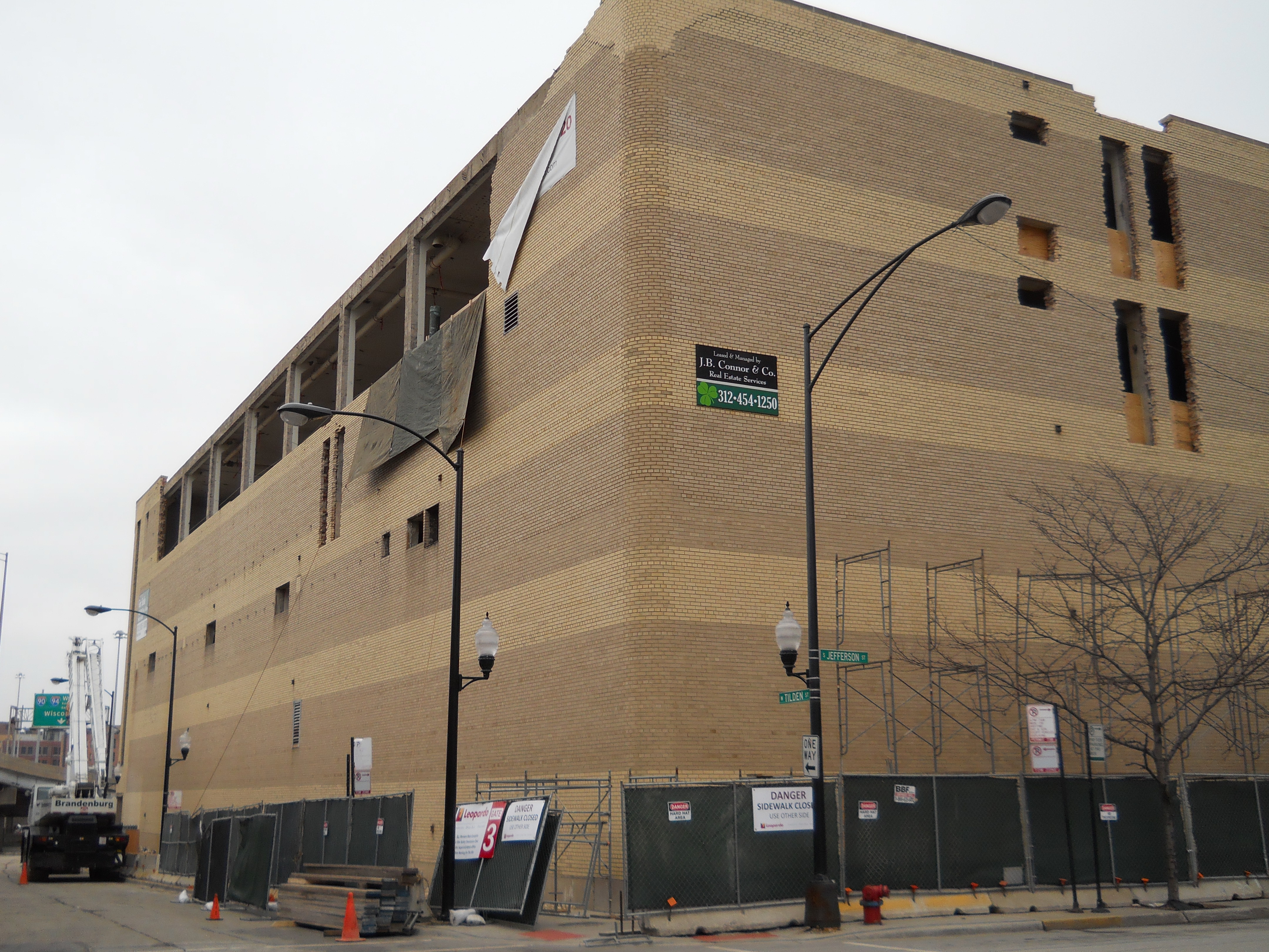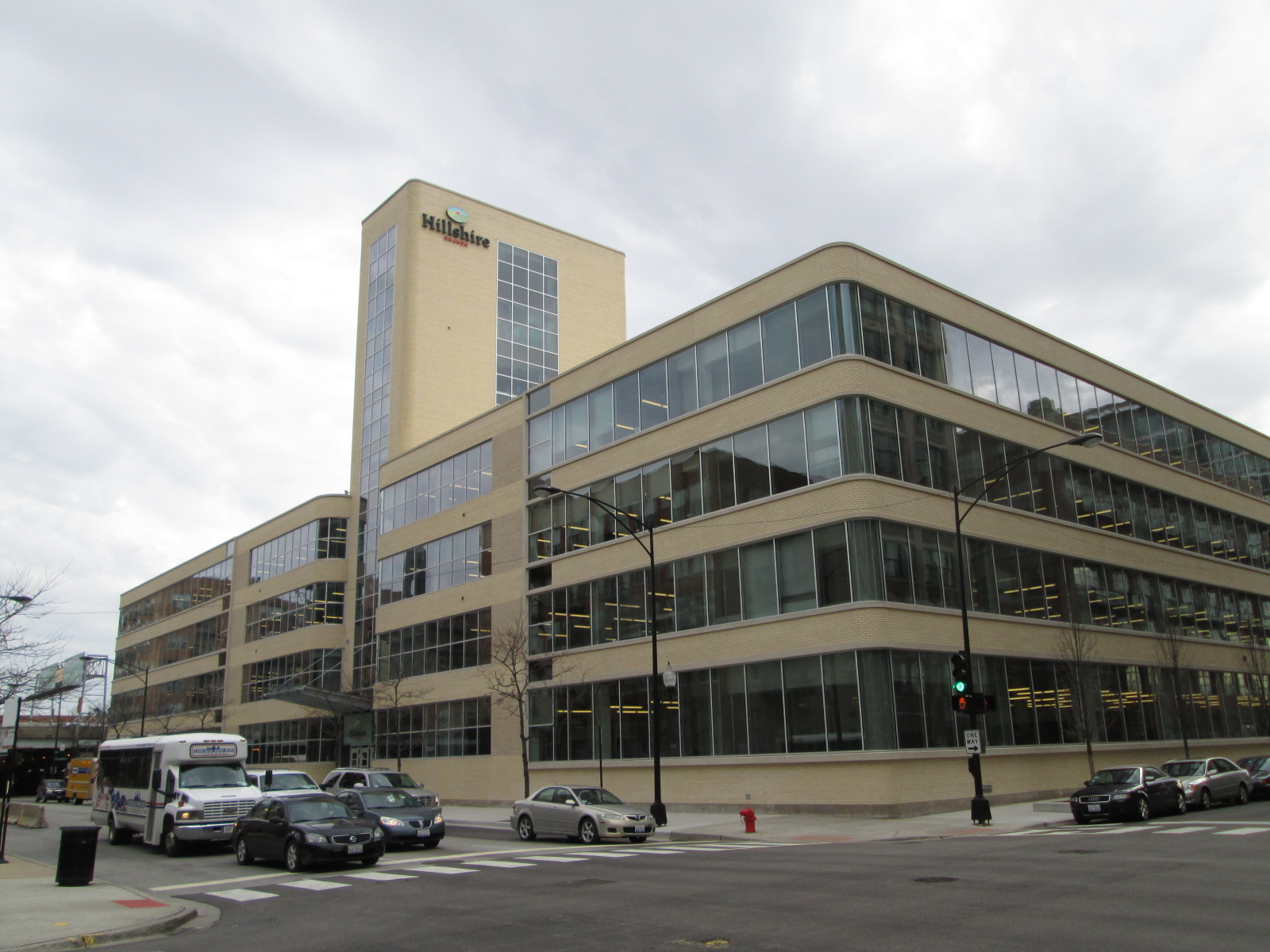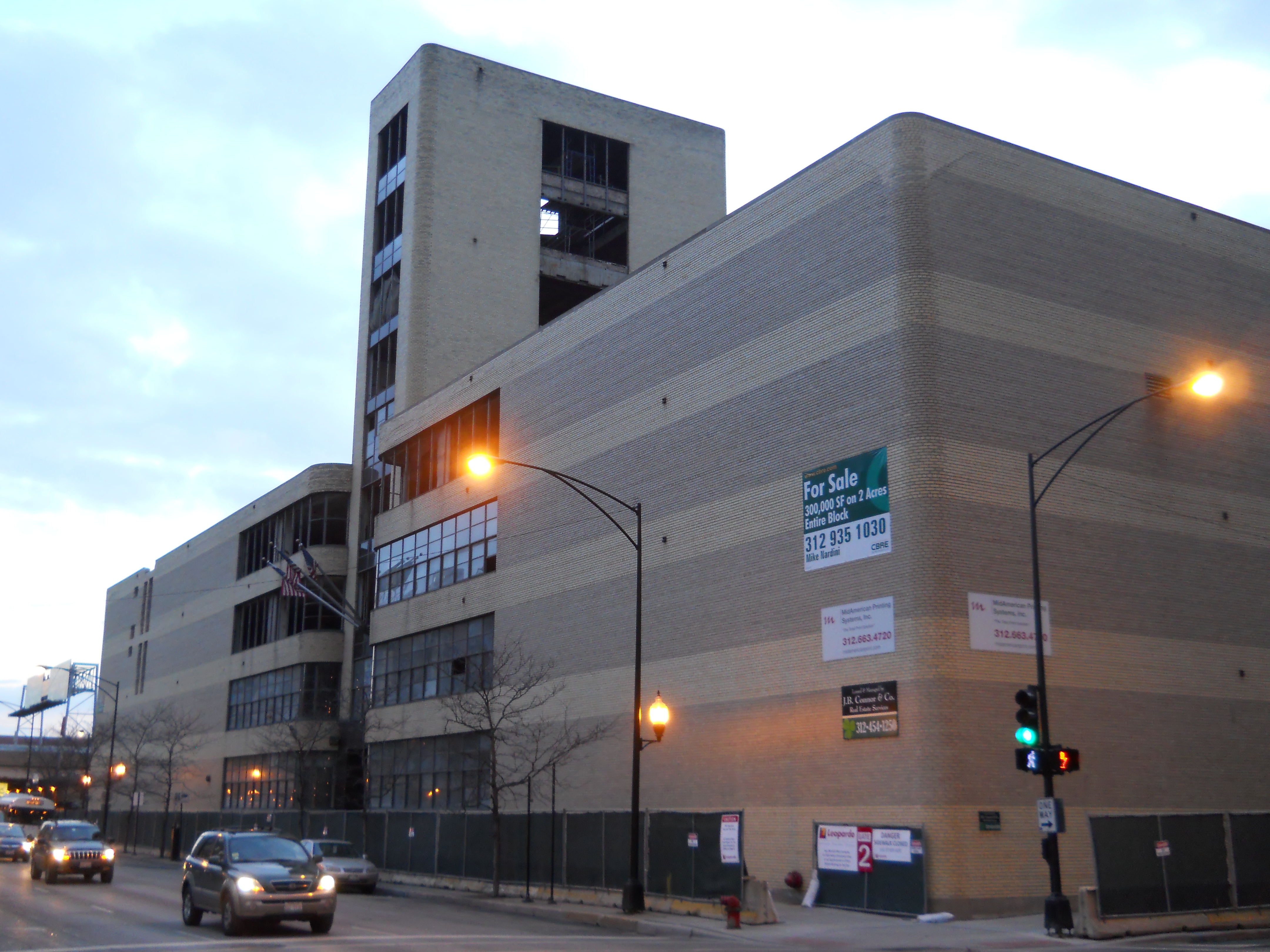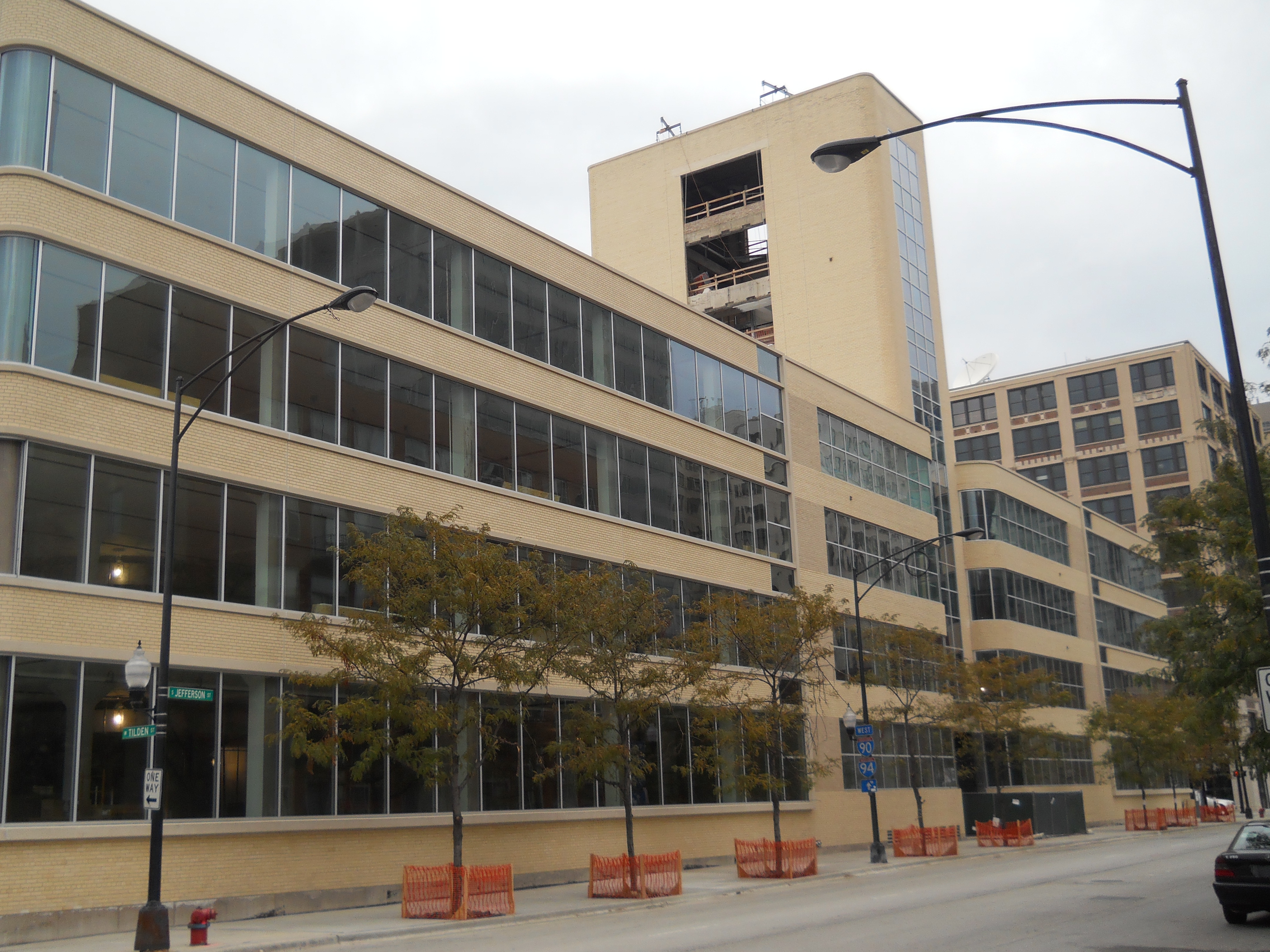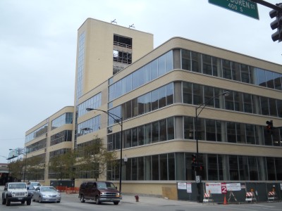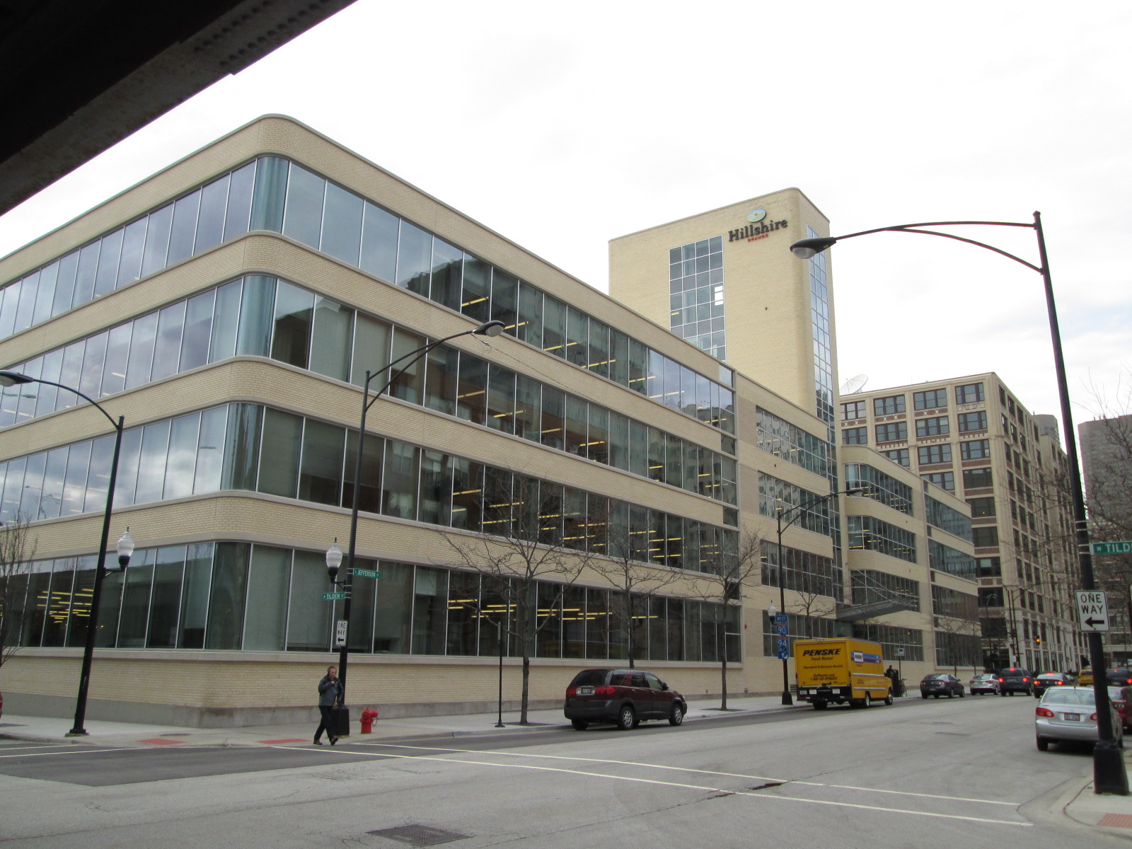 This sturdy, 270,000 square-foot building in the West Loop Canal-Congress TIF District was built in 1946 for the Newman-Rudolph Lithographing Company. The Moderne skin was stripped in a gut renovation for the Sara Lee as the headquarters for their new North American Foodservice (meat) division. ( ref, ref)