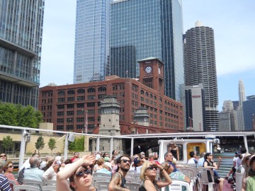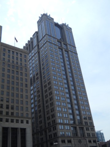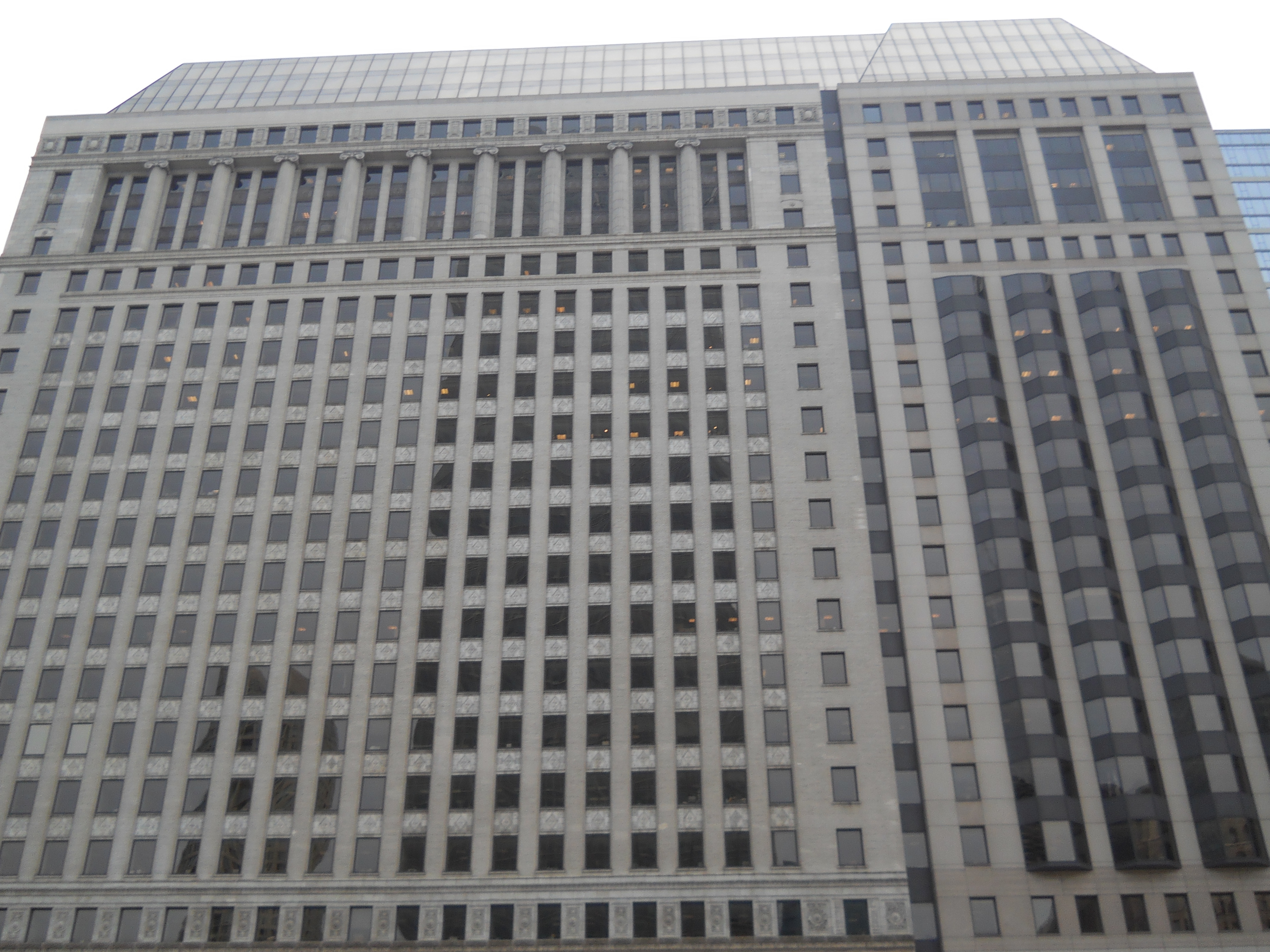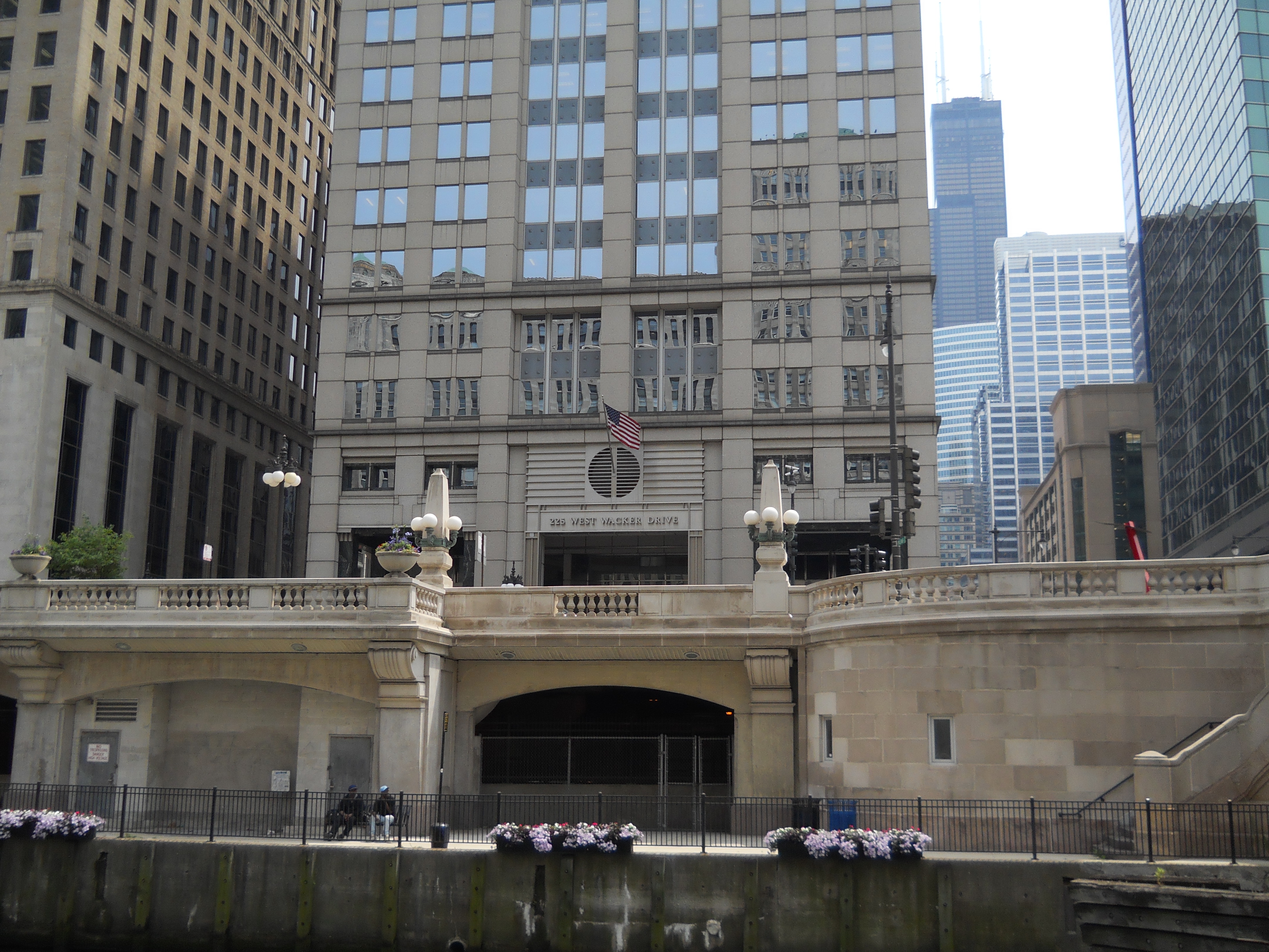 225 West Wacker Drive, just to the East, was designed by the same team of architects and opened in 1989. Postmodern features include the metal window boxes that echo the Merchandise Mart across the river, four rivets on each spandrel that echoes the riveted bridges below, and the optical illusion of flying buttresses from the Tribune Tower.