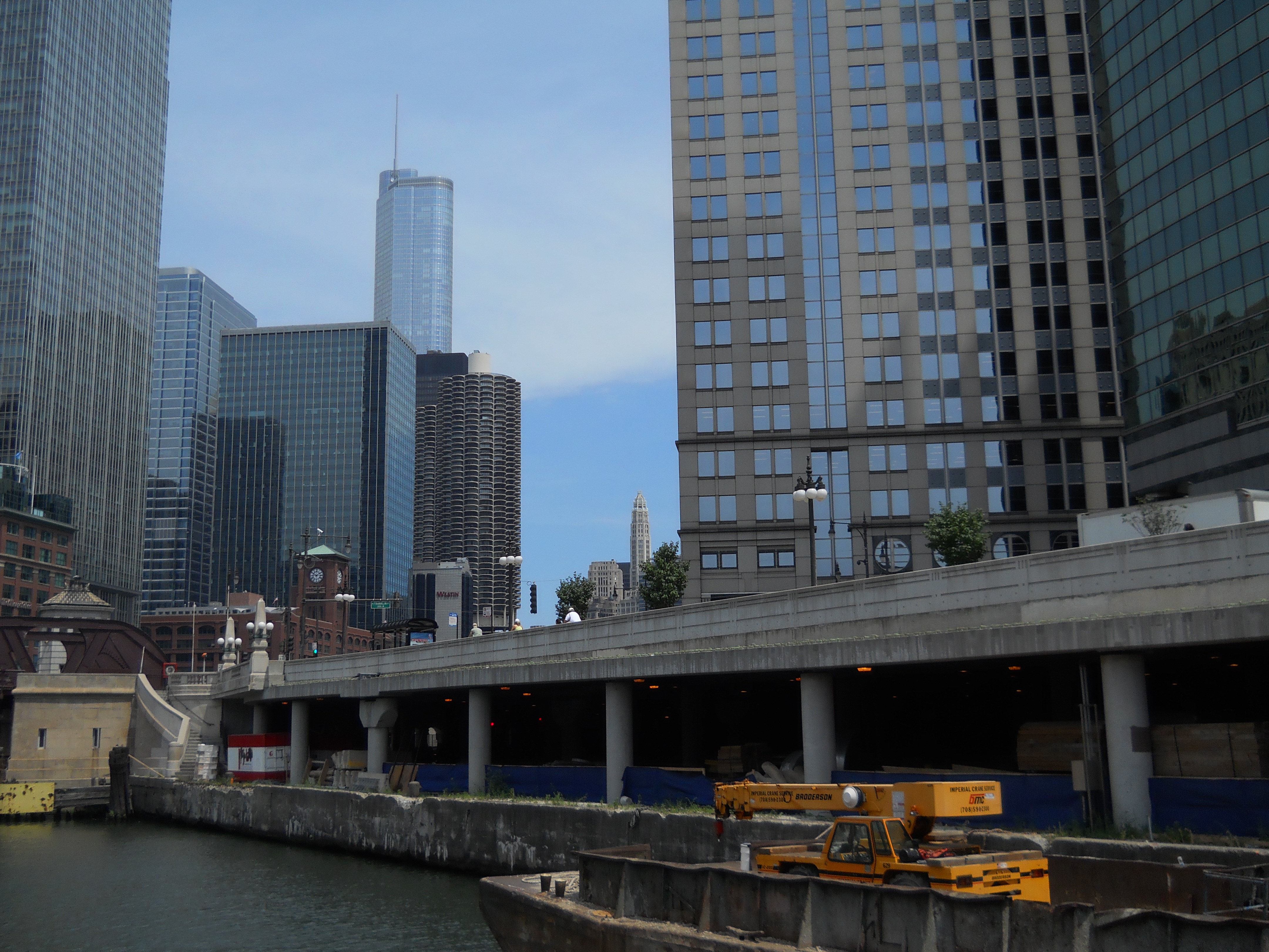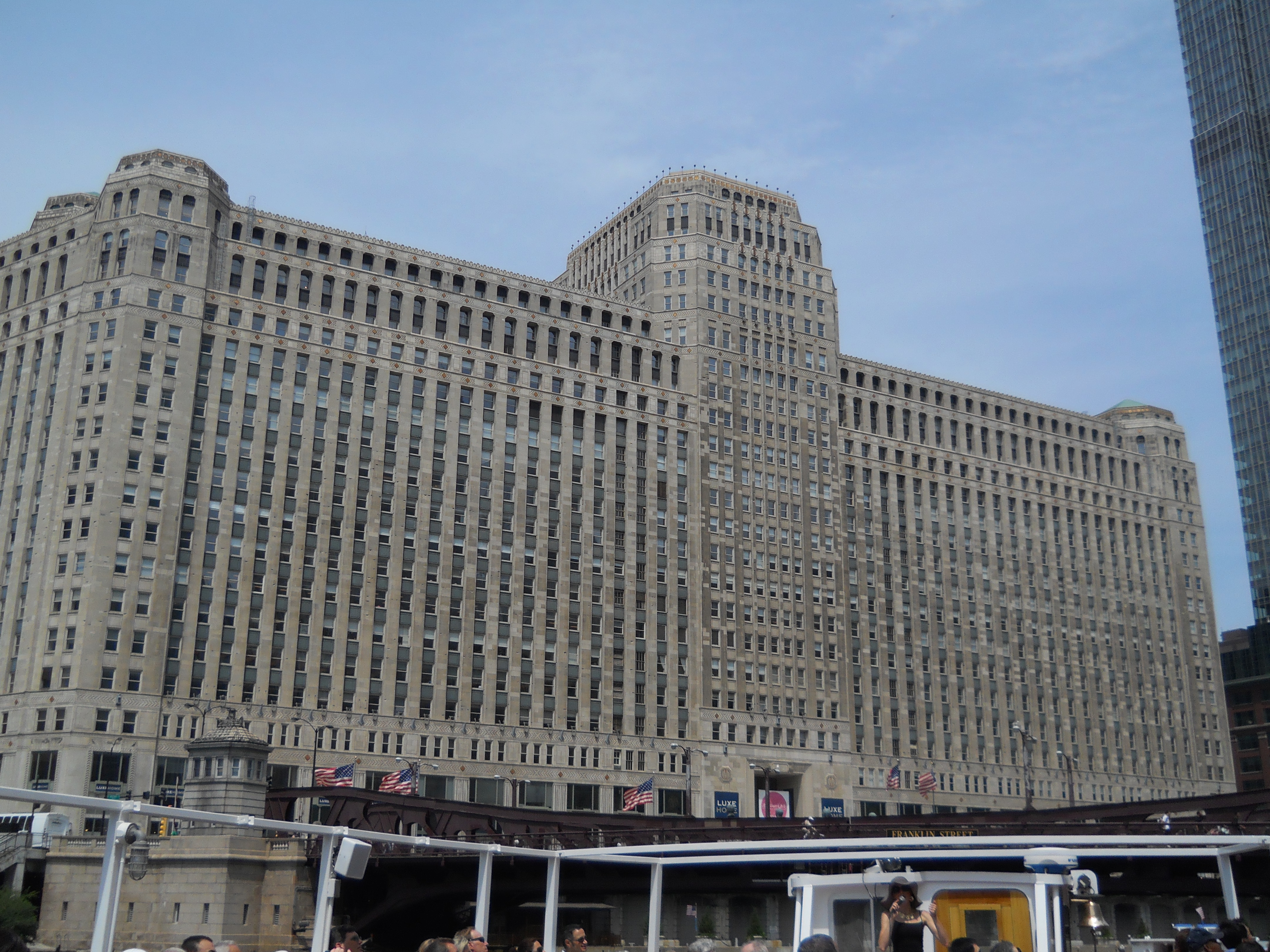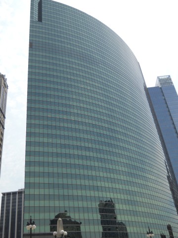 333 West Wacker Drive was designed by Cohen, Paterson and Fox and opened in 1983. Postmodern, site-specific features include a curved shape that echoes the curve of the river at the confluence of the branches, alternating bands of colored glass (green for water, blue for sky), and a Chicago-Style three-layered structure (base, shaft and capital).