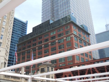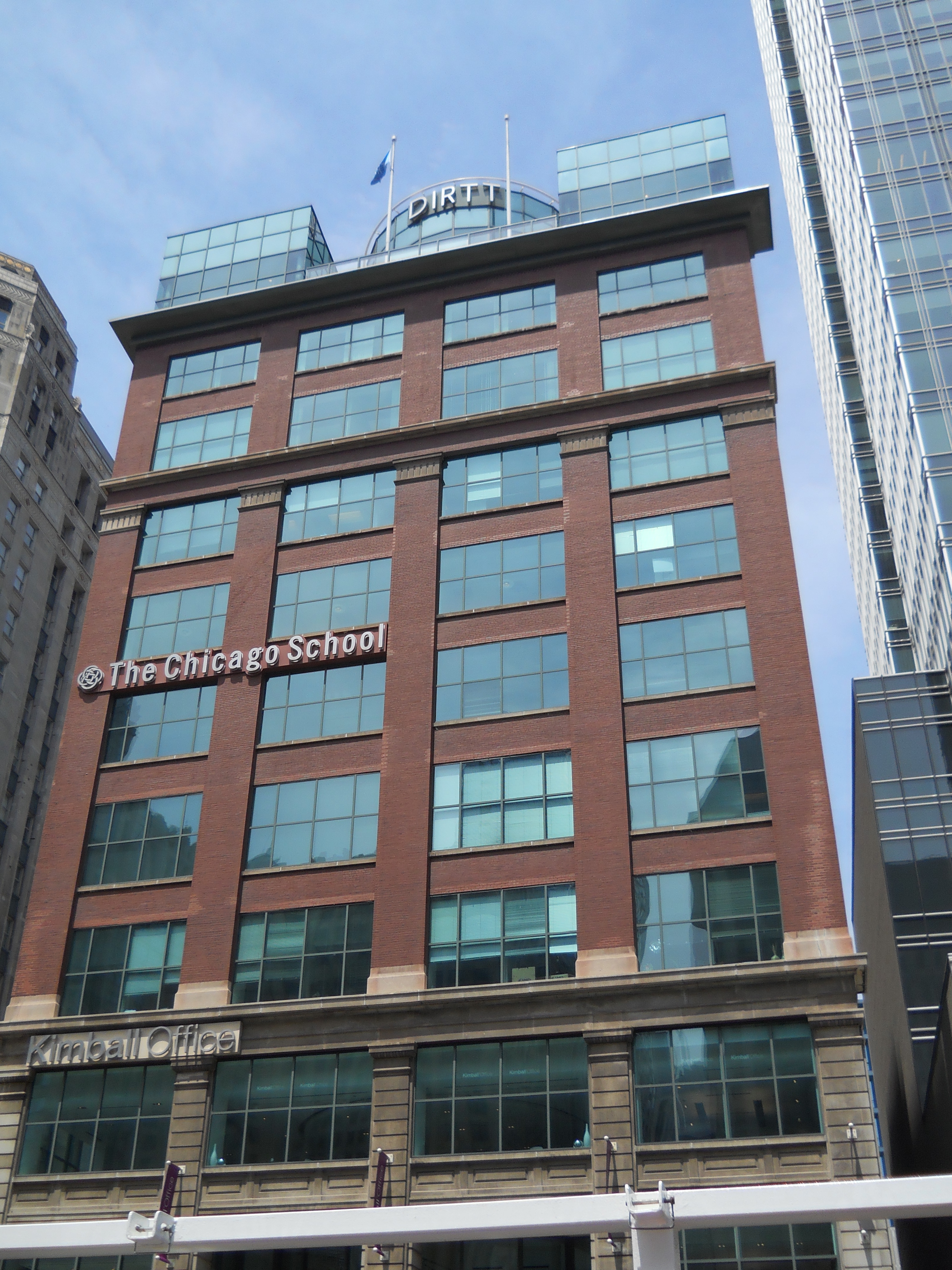 The Chase and Sanborn coffee warehouse (325 North Wells) was designed by L. Gustav Hallberg and opened in 1912. The three-layered structure (base, shaft and capital) distinguish it as an example of the Chicago School style pioneered by Louis Sullivan. The Chicago School sign is for The Chicago School of Professional Psychology.