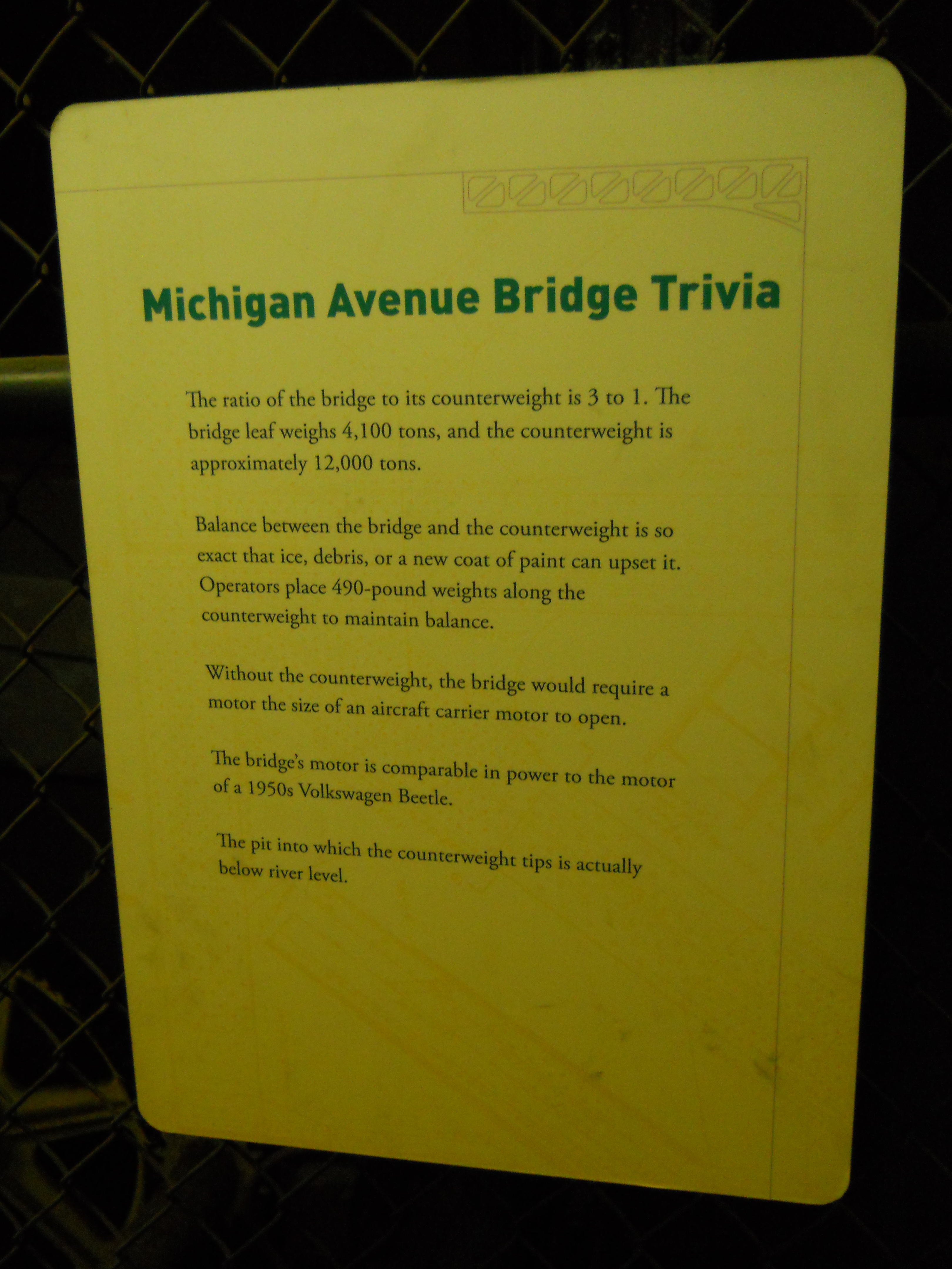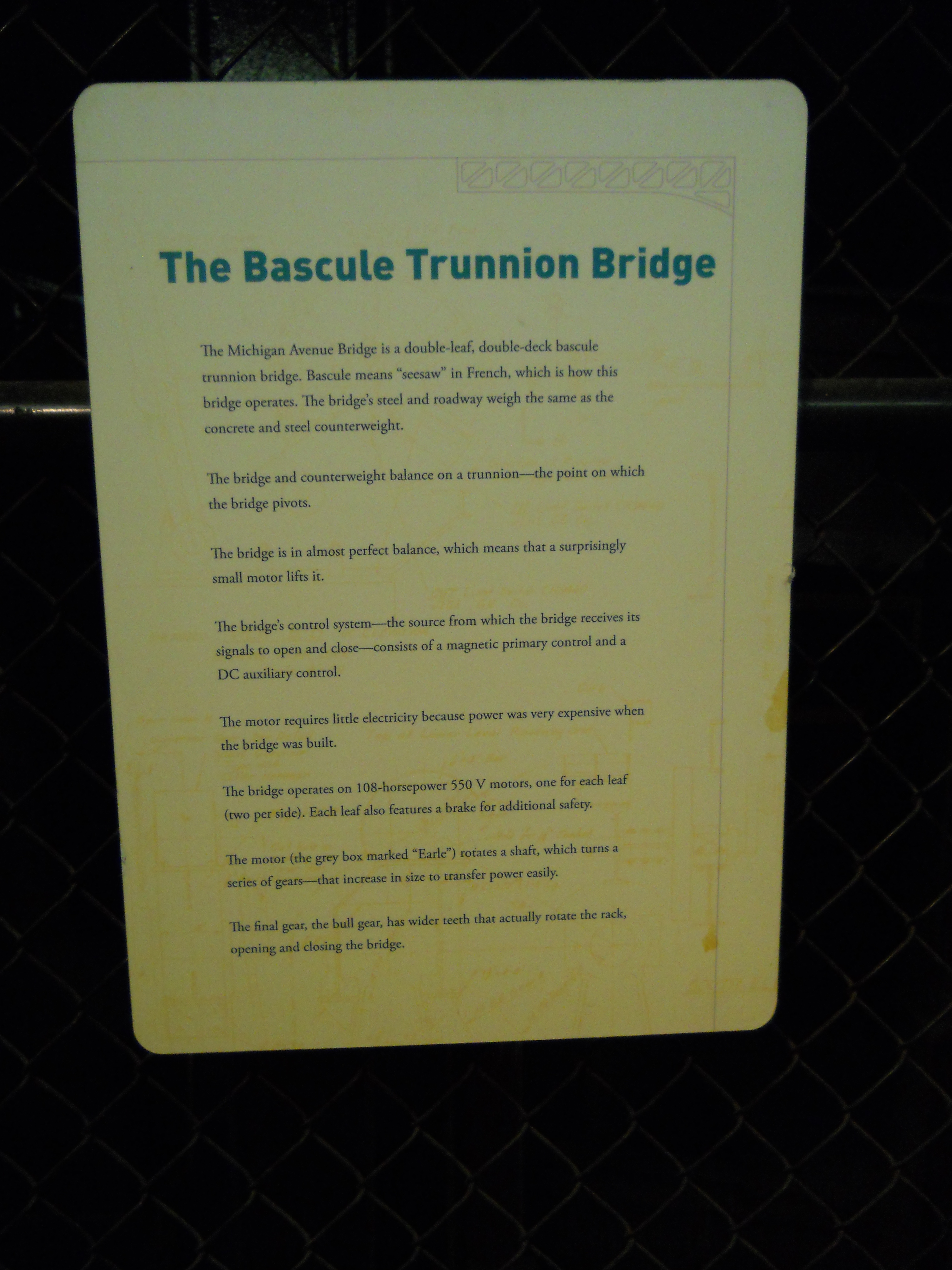 The McCormick Bridgehouse & Chicago River Museum is a small cultural attraction that opened in 2006 in the South bridgehouse of the Michigan Avenue Bridge. The museum features exhibits and artifacts on the role of Chicago River in the development of Chicago, as well as the opportunity to see the bridge lift mechanism up close and personal.