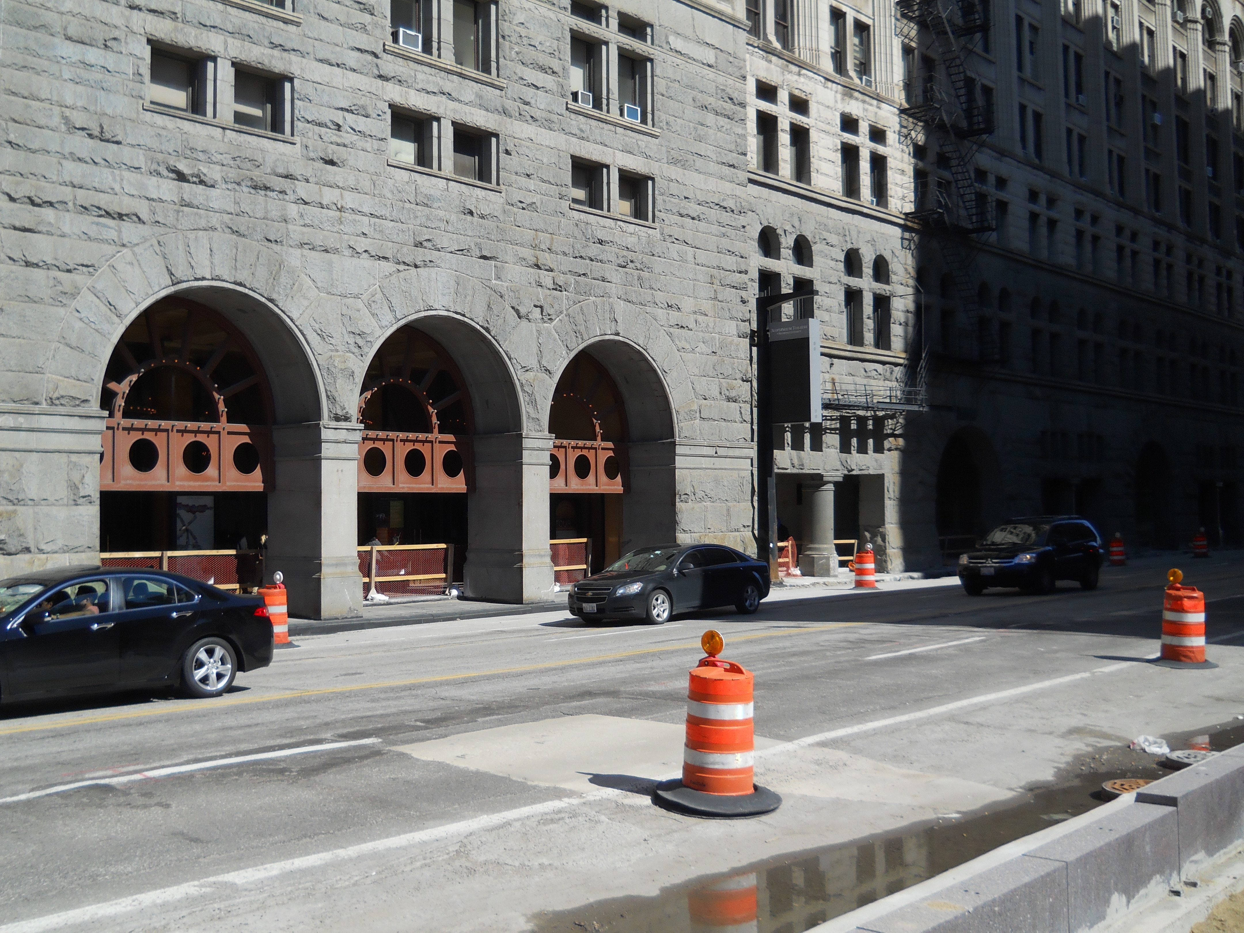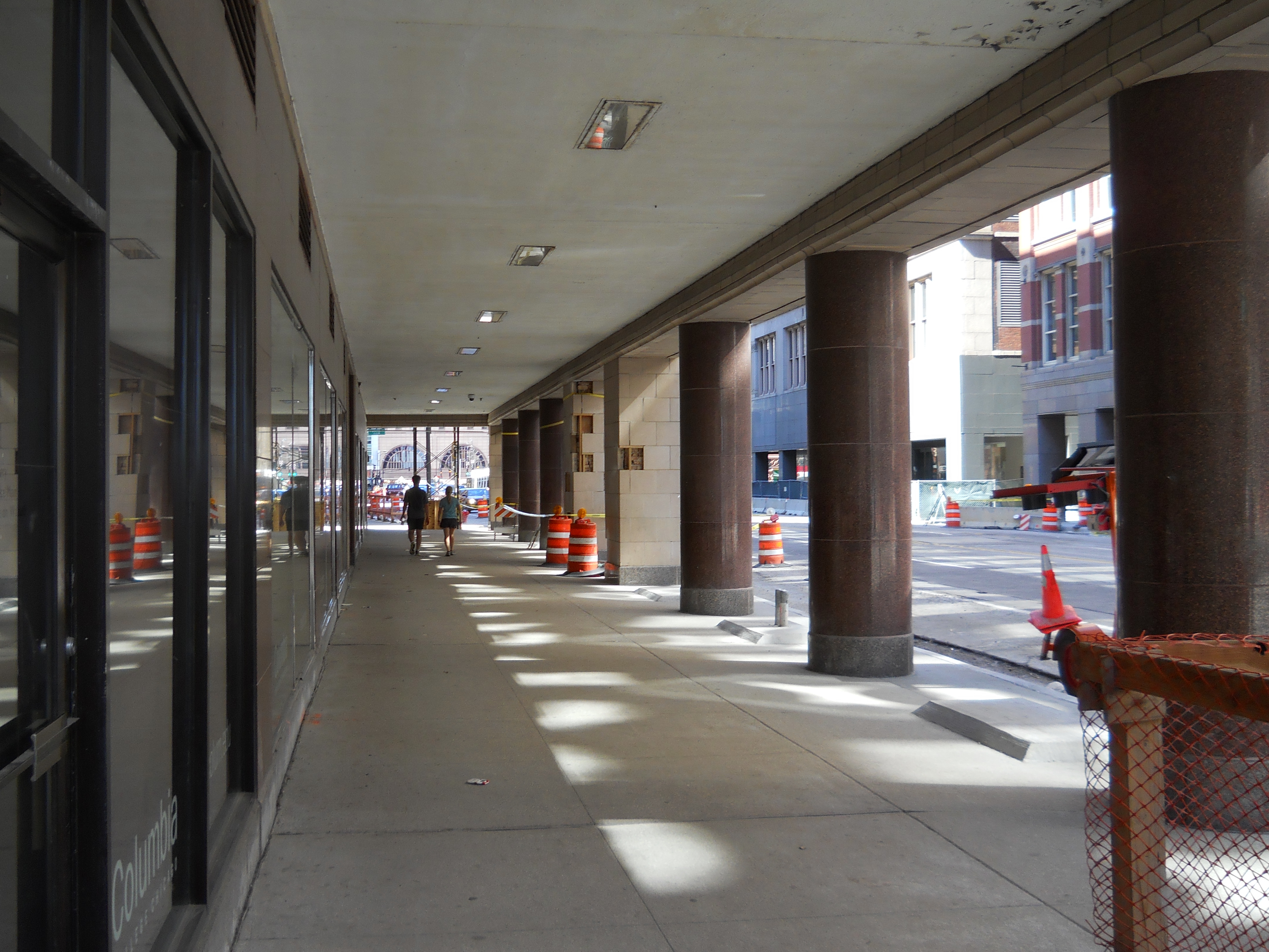 Congress Parkway was widened in the 1940s into a major vehicular artery through downtown. However, since there were buildings on either side, the first floors were arcaded to permit pedestrian traffic to continue.