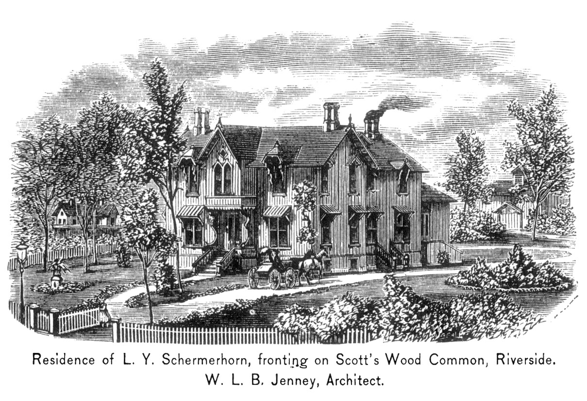 The L.Y. Schermerhorn Residence is a Victorian-style structure designed by William LeBaron Jenny. Schermerhorn was a partner in the engineering firm hired by the Riverside Improvement Company to implement Olmsted and Vaux's plan for Riverside.