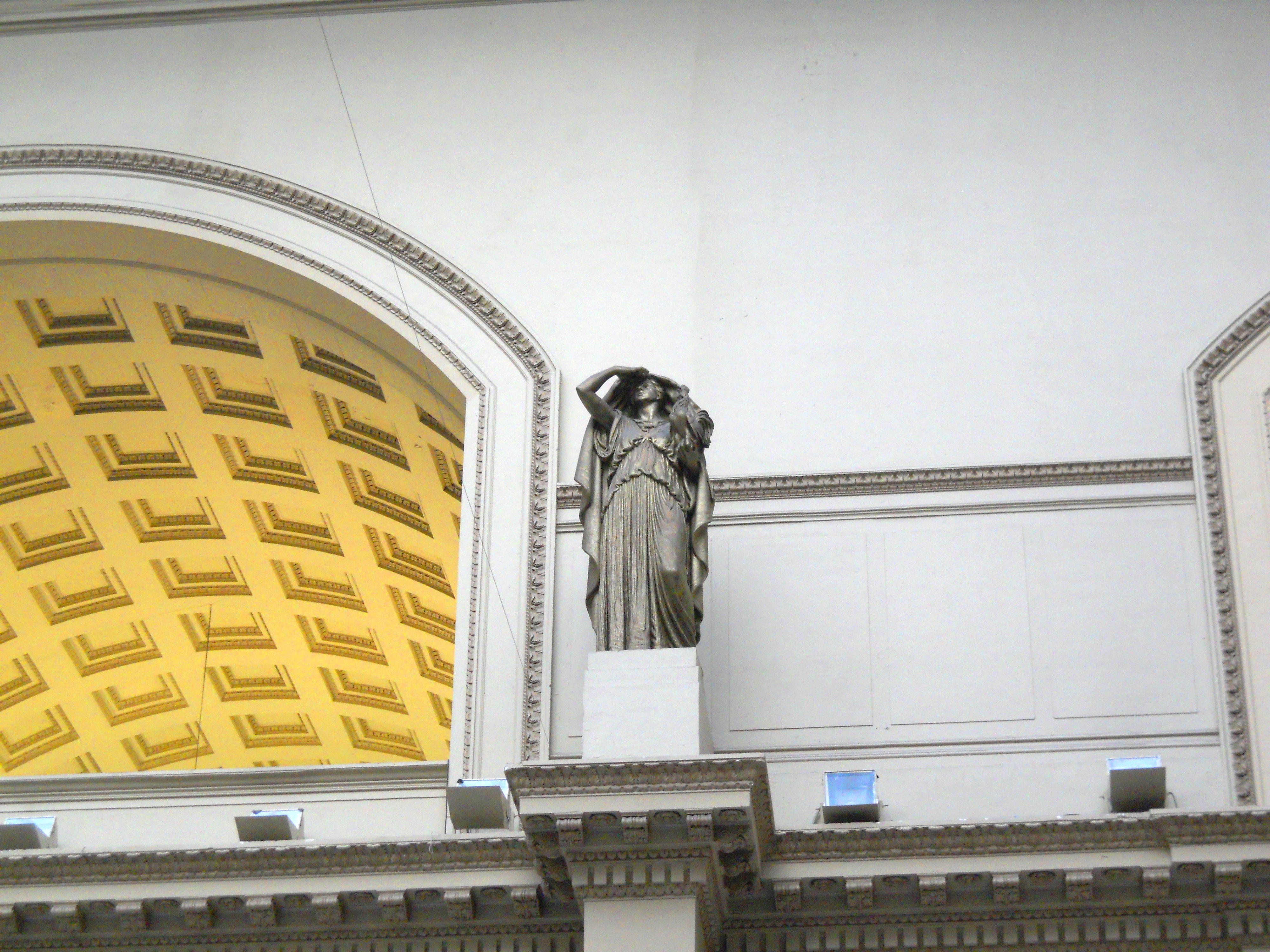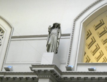 The two statues high on the east wall of the Great Hall symbolize the 24-hour nature of passenger railroads. One holds a rooster (Day) and the other an owl (Night).