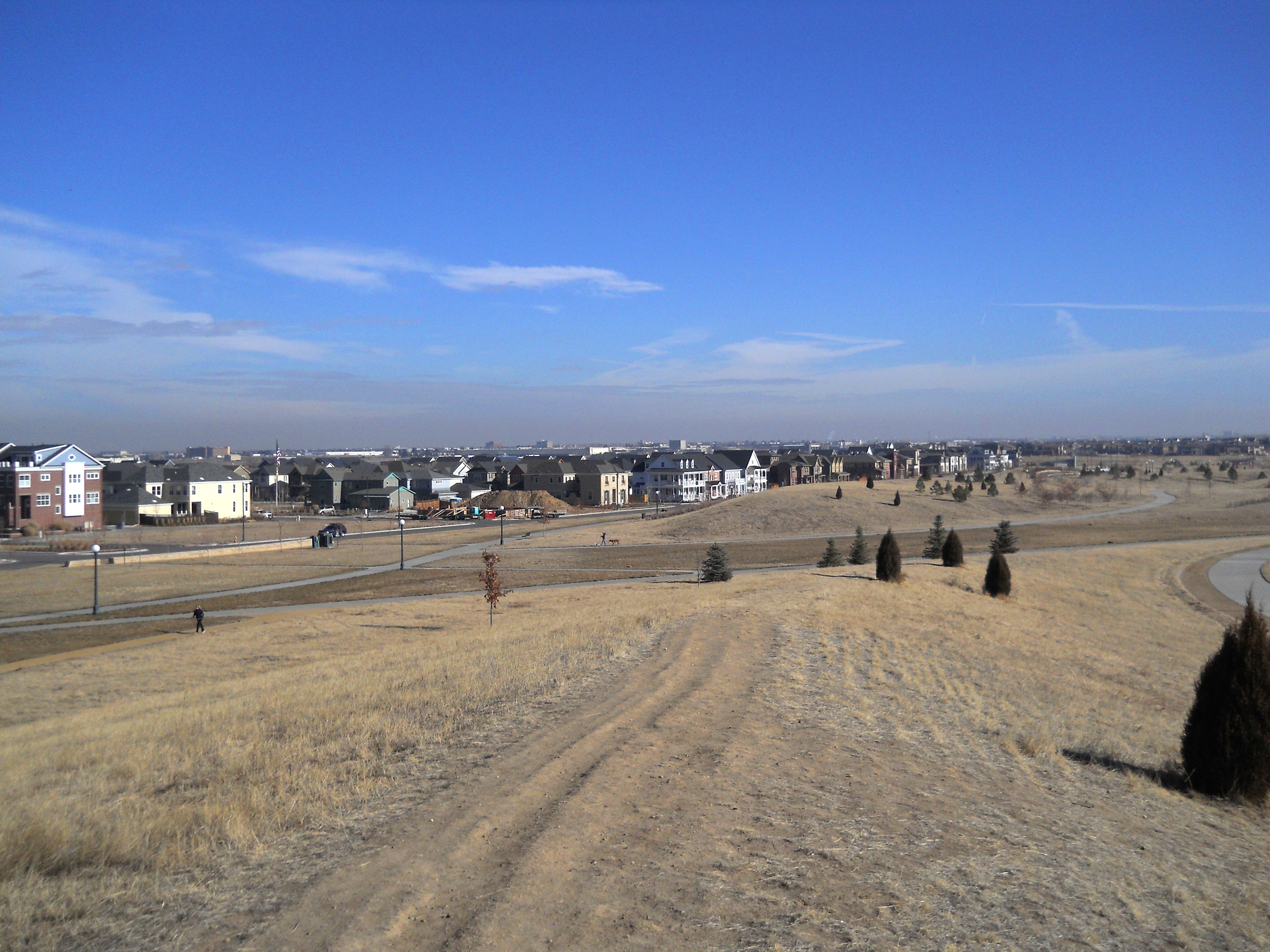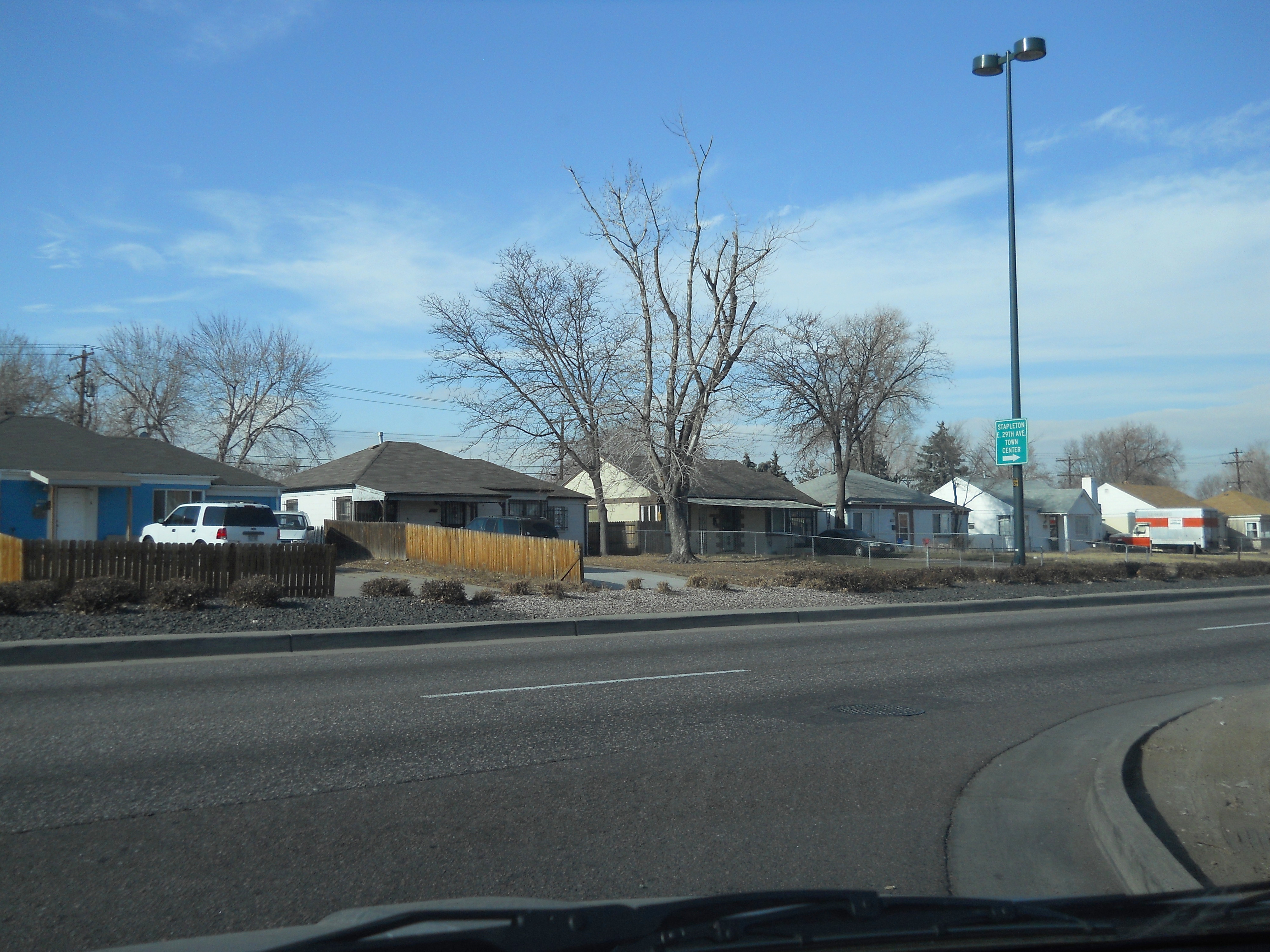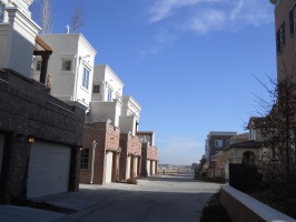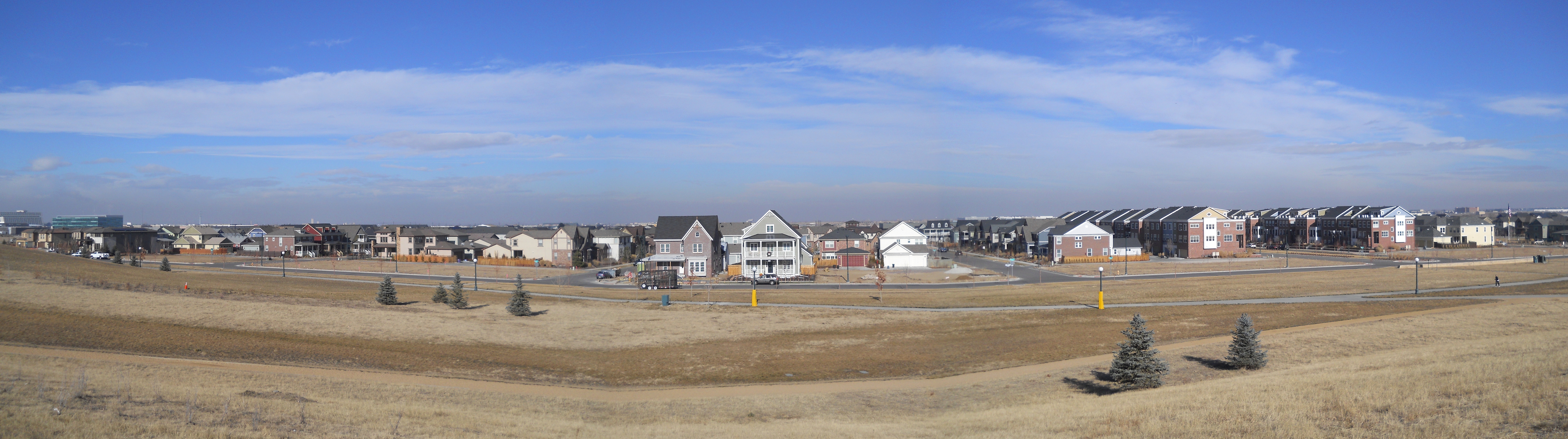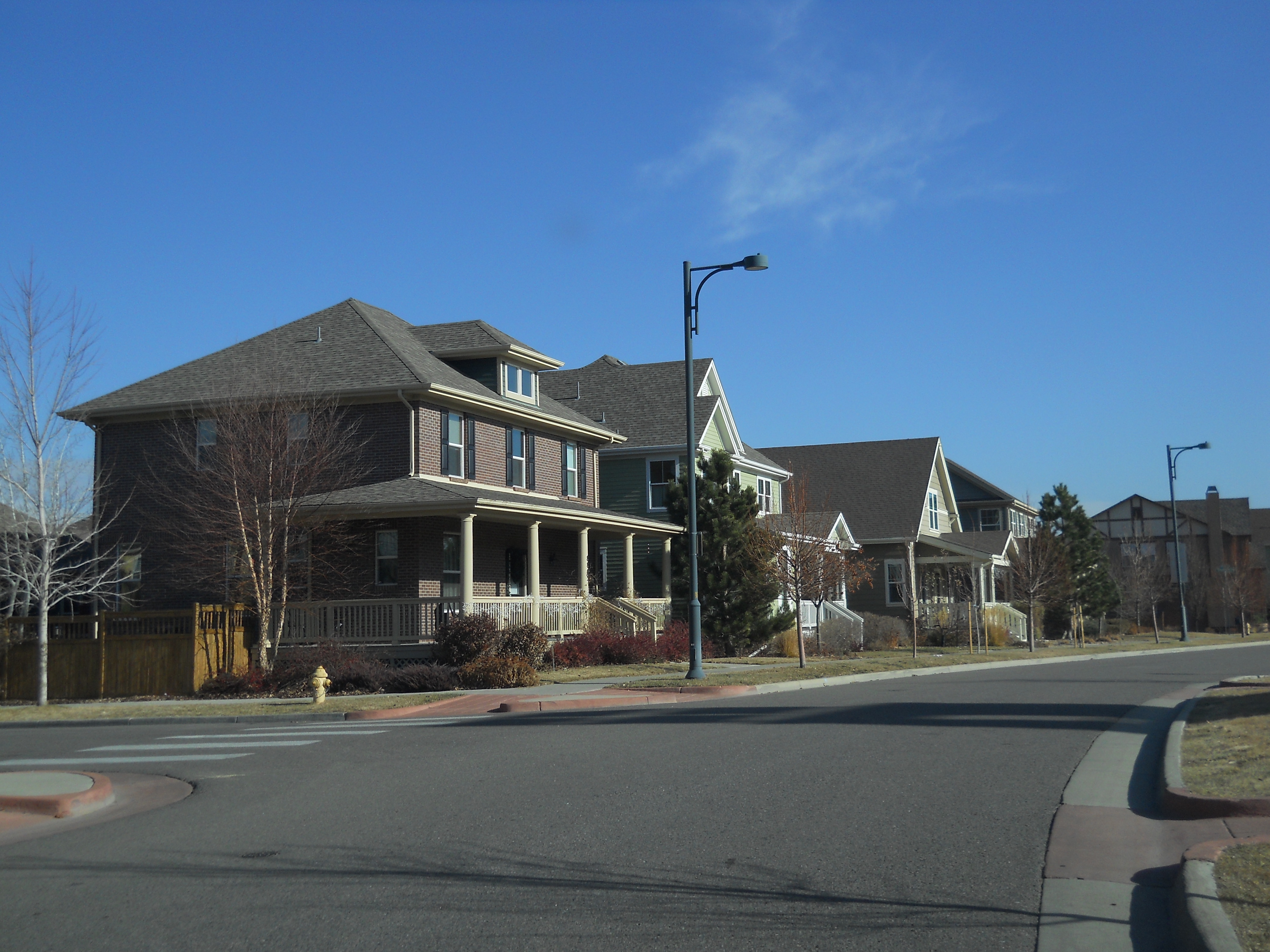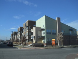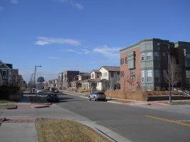 The former airfield was redeveloped by Forest City Enterprises (the company behind Brooklyn's infamous Atlantic Yards) as Stapleton. The development markets itself as being based on New Urbanist principles and does incorporate density and ample park land. However the design appears to adhere to traditional suburban segregation of uses, with long residential streets and remote shopping areas that can only be practically reached by automobile - especially in the cold Denver winters. The architecture is a curious (albeit probably quite pricey) collection of pastiche styles from the late 19th and early 20th century. Being built with contemporary materials and techniques, the houses will likely not have as long a life cycle as their stylistic ancestors. And the almost complete lack of any original ideas, combined with an ironically predictable diversity gives it an air of artifice and sterility that is almost as suffocating as any Levittown.