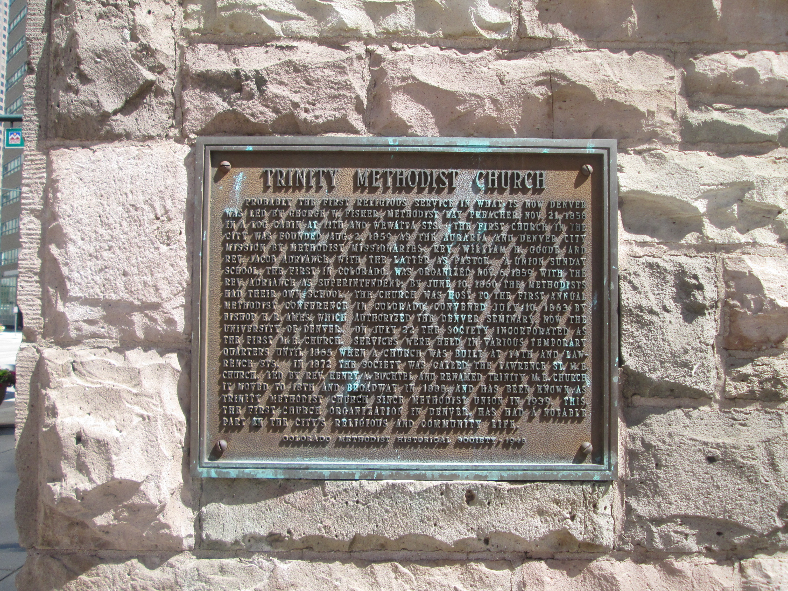 Probably the first religious service in what is now Denver was led by George W. Fisher, Methodist lay preacher, November 21 1858 in a log cabin at 11th and Wewatta Sts. The first church in the city was founded Aug. 2, 1859 as the Auraria and Denver City Mission by Methodist missionaries, Rev. Wiliam H. Goode and Rev. Jacob Adriance, with the latter as pastor. A union sunday school, the first in Colorado, was organized Nov. 6, 1859 with the Rev. Adriance as superintendent. By June 10, 1860 the Methodists had their own school. The church was host to the first annual Methodist conference in Colorado. Convened July 10, 1863 by Bishop E.R. Ames, which authorized the Denver Seminary, now the University of Denver.