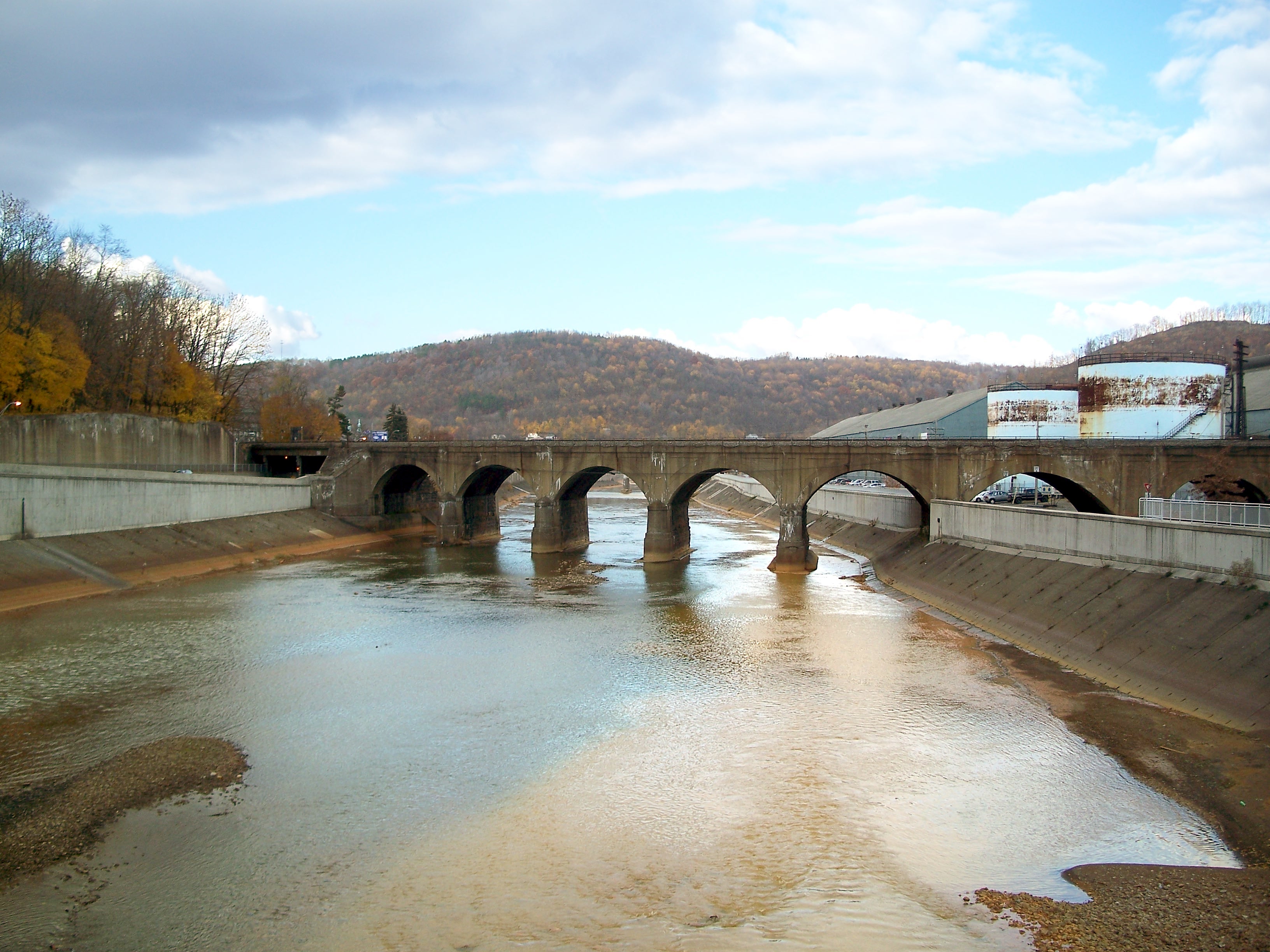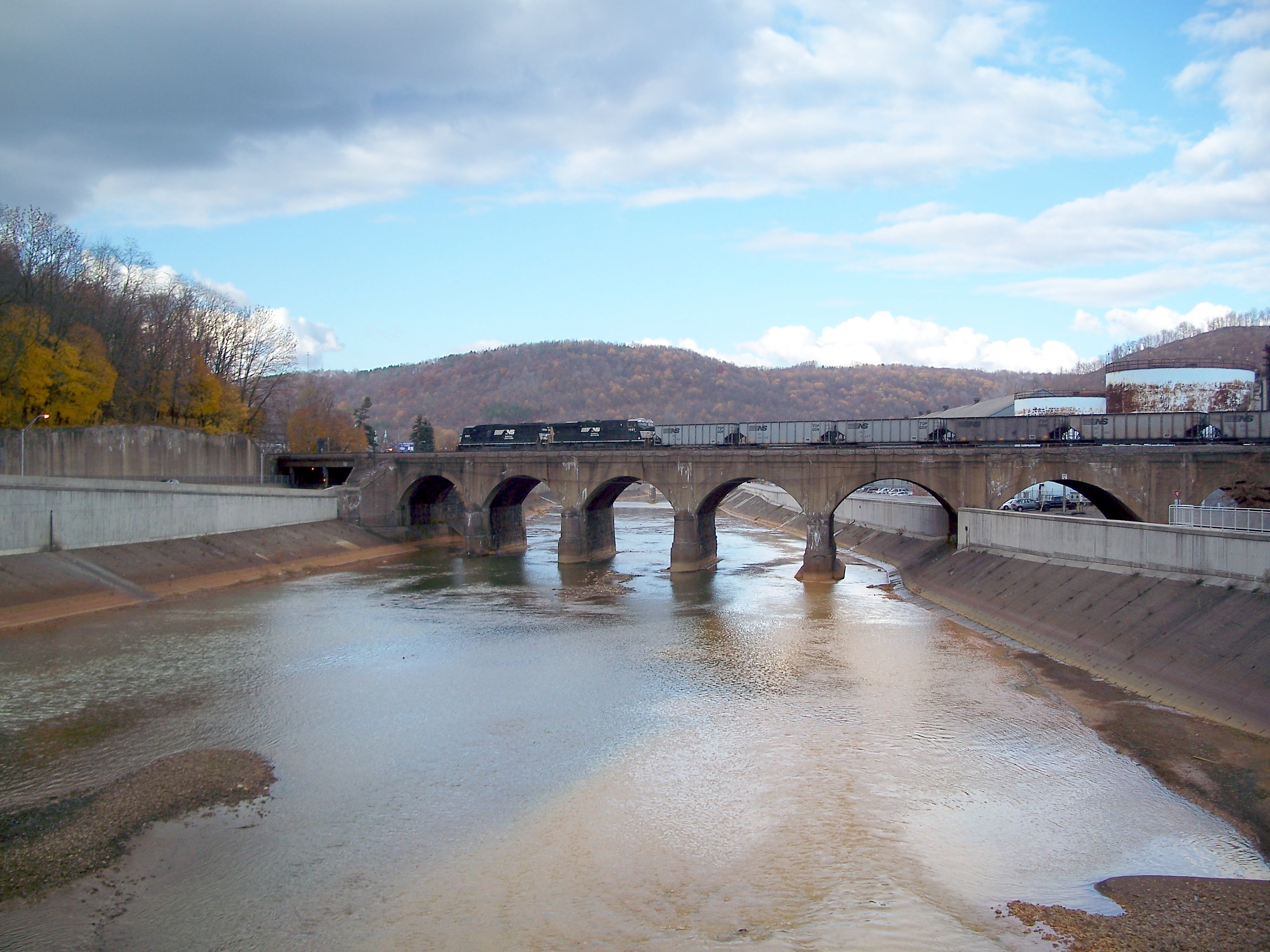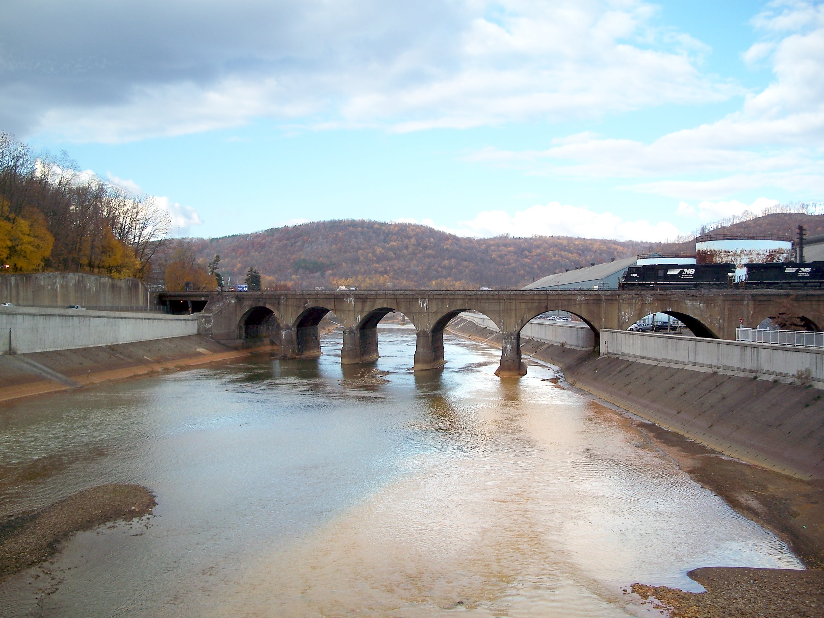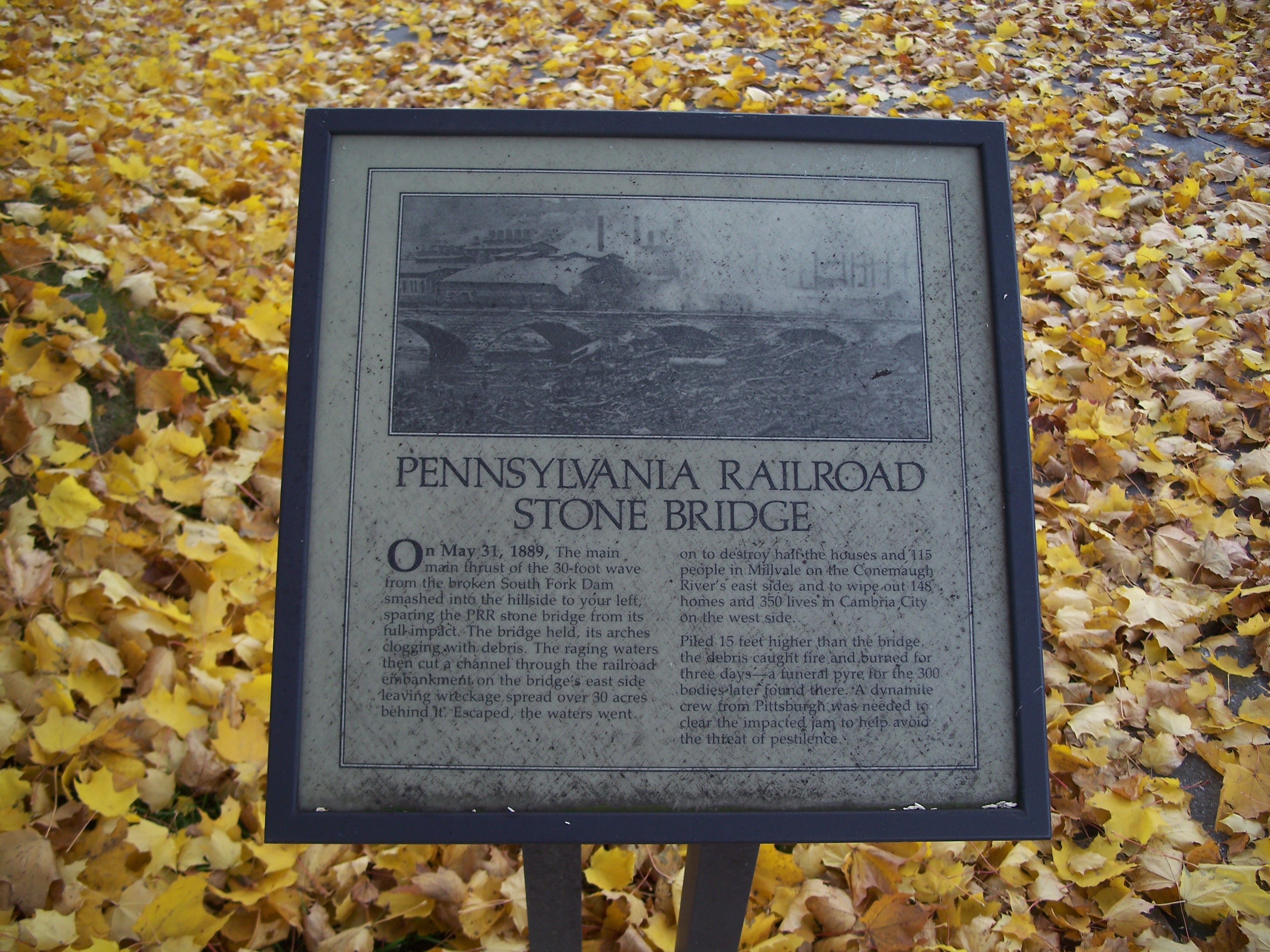 This seven-arch stone railroad bridge was built in Johnstown, PA by the Pennsylvania Railroad in 1887. It is notable for surviving the 1889 flood, but subsequently forming the base of a dam of debris that accumulated behind it and caught fire on the evening of the flood, incinerating a number of flood survivors trapped in the wreckage.
