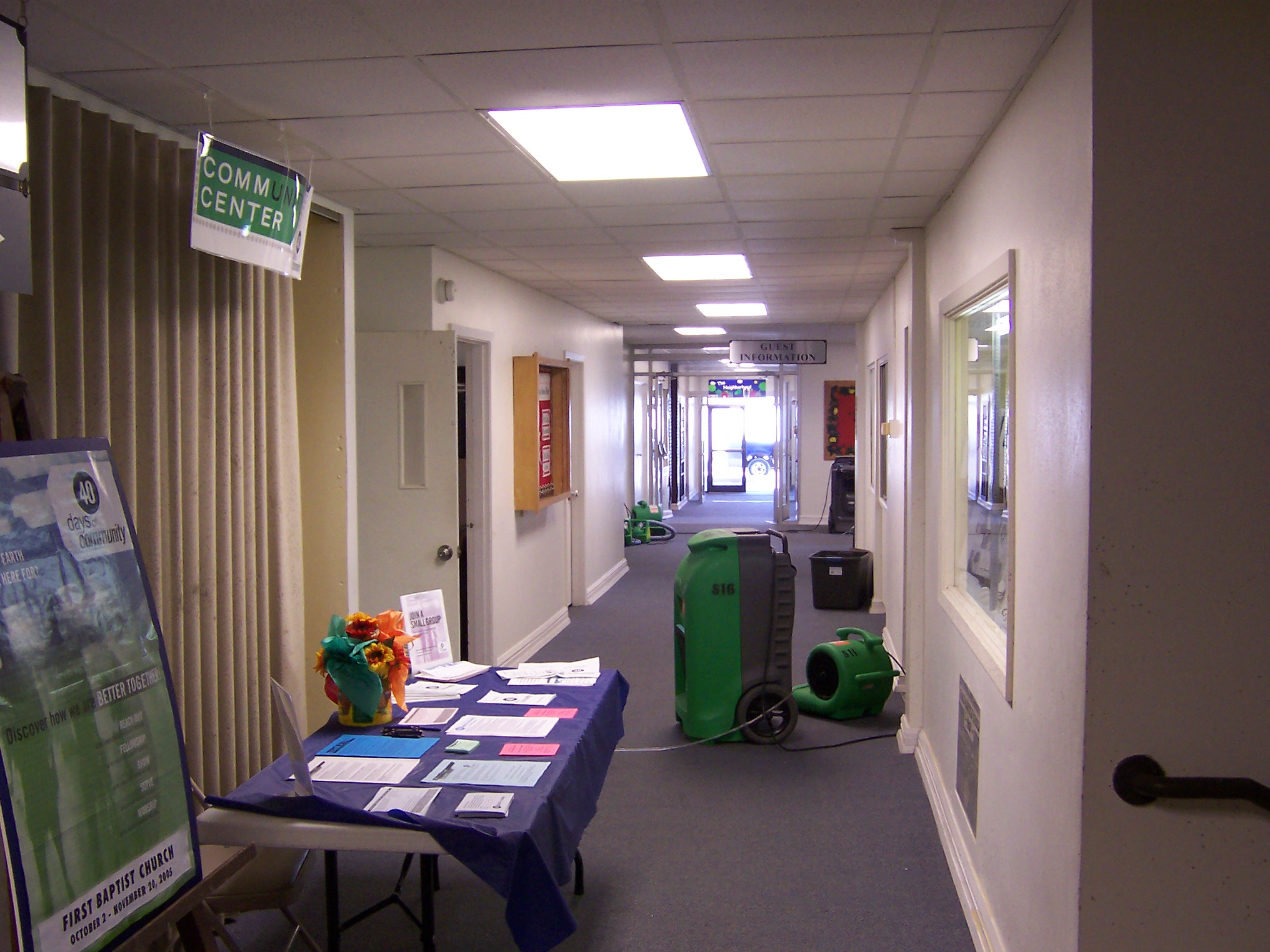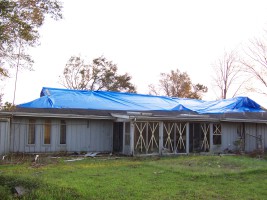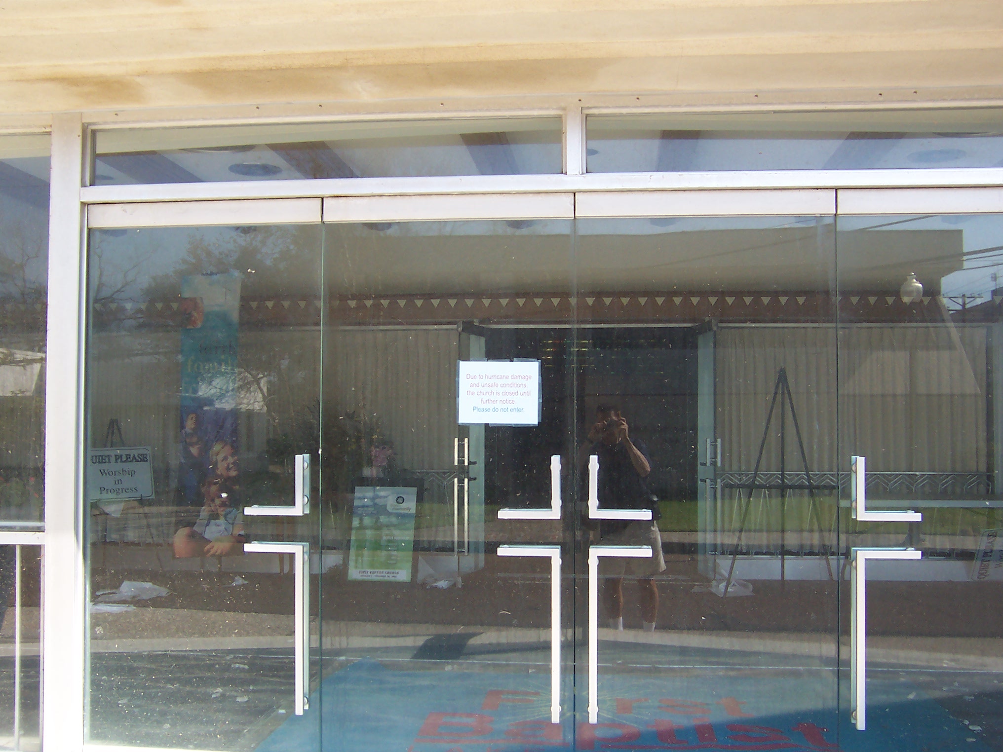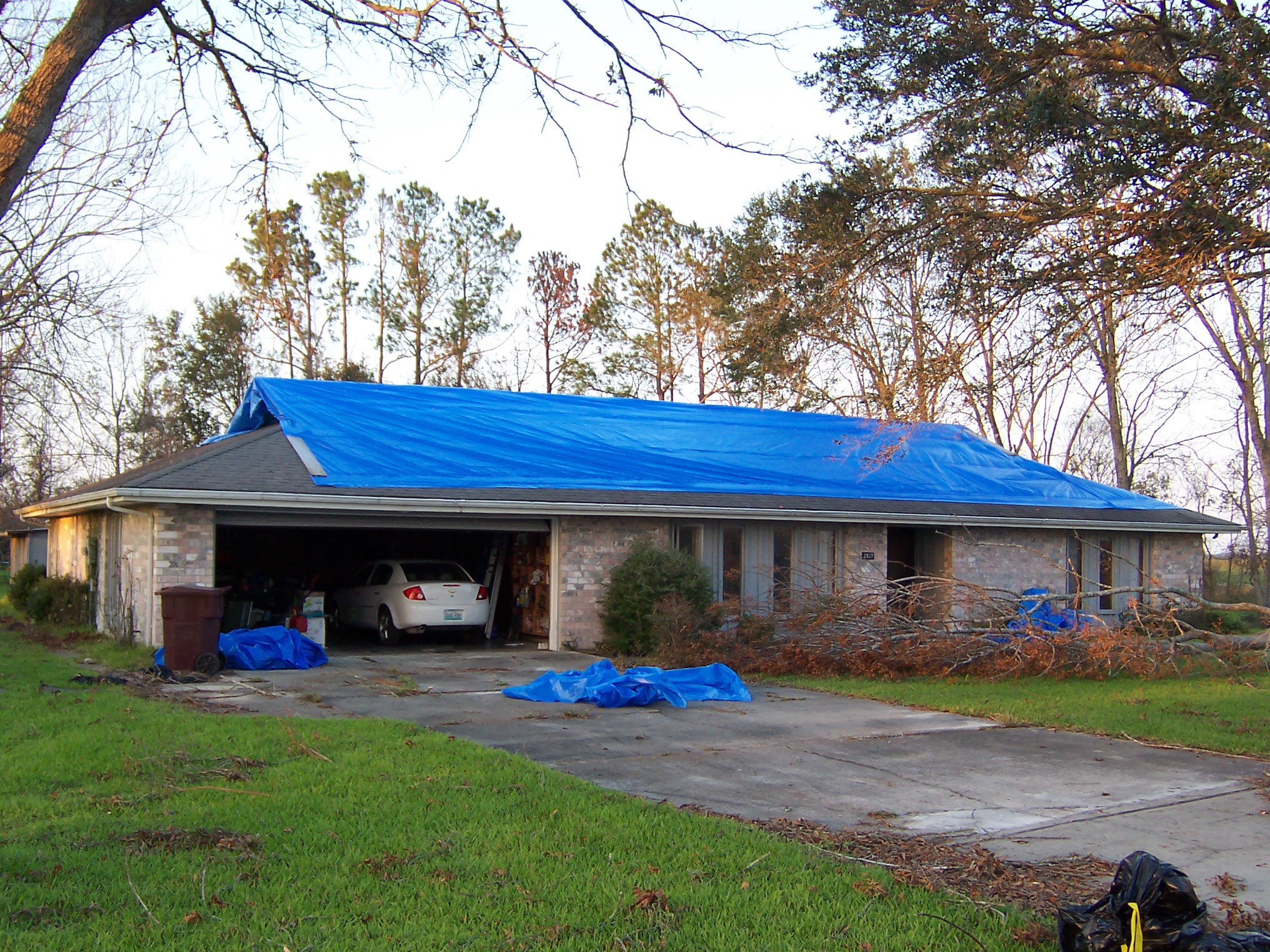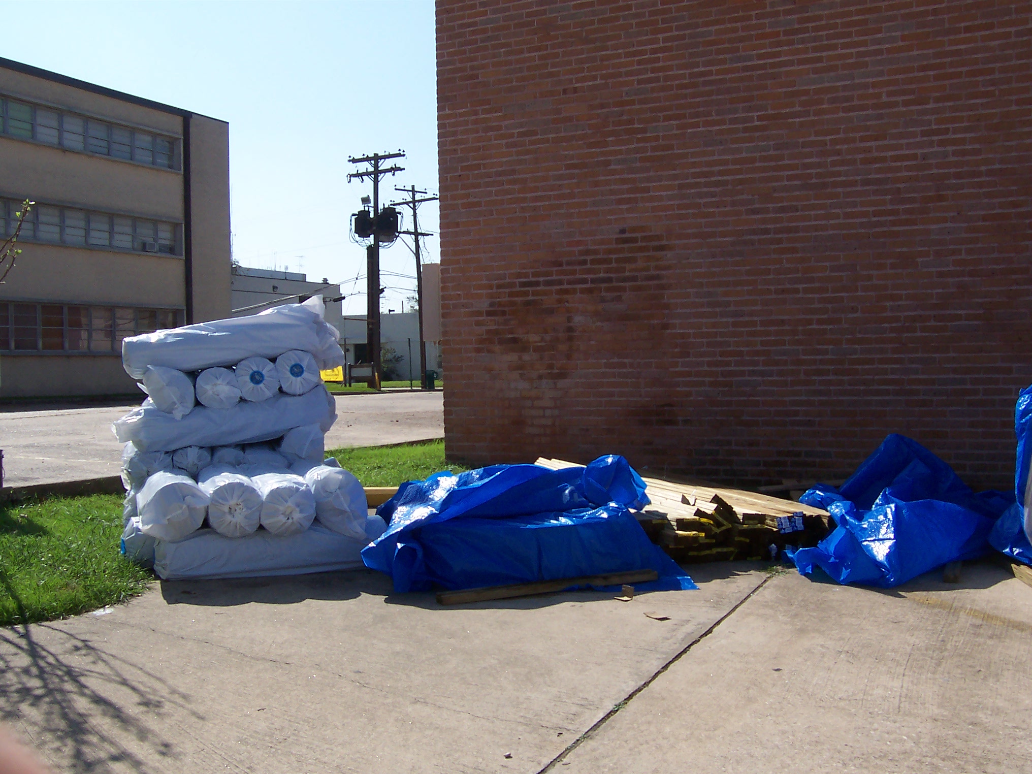 FEMA and a number of other organizations were supplying reinforced blue plastic tarpaulins along with wooden slats and roofing nails for providing temporary roof repairs. These "Blue Roofs" began springing up all over town as people began slowly returning to the area to assess damage. I took a drive downtown to survey the damage to my parents' church (First Baptist Church) and was surprised to find the building was largely undamaged and serving as a distribution point for blue tarps which were the same type as the FEMA tarps but branded with the name of a Christian organization. My rental car was not large enough for the wooden slats, but I was able to get a couple of rolls of tarp and some roofing tacks and head for home. (For FBC, the initial relief turned to sadness as they ended up being diagnosed with a mold problem a few weeks later).