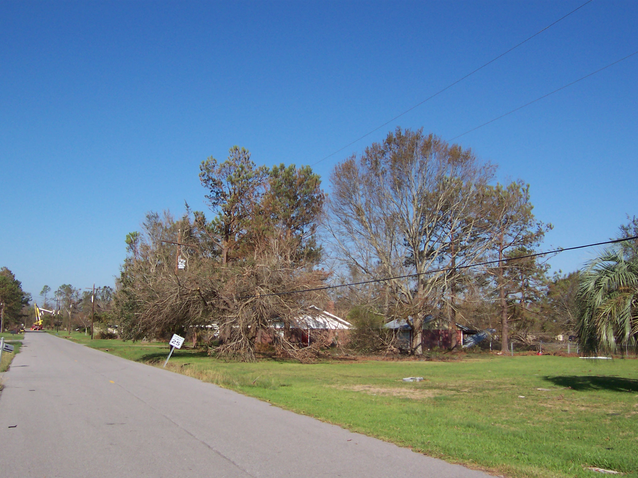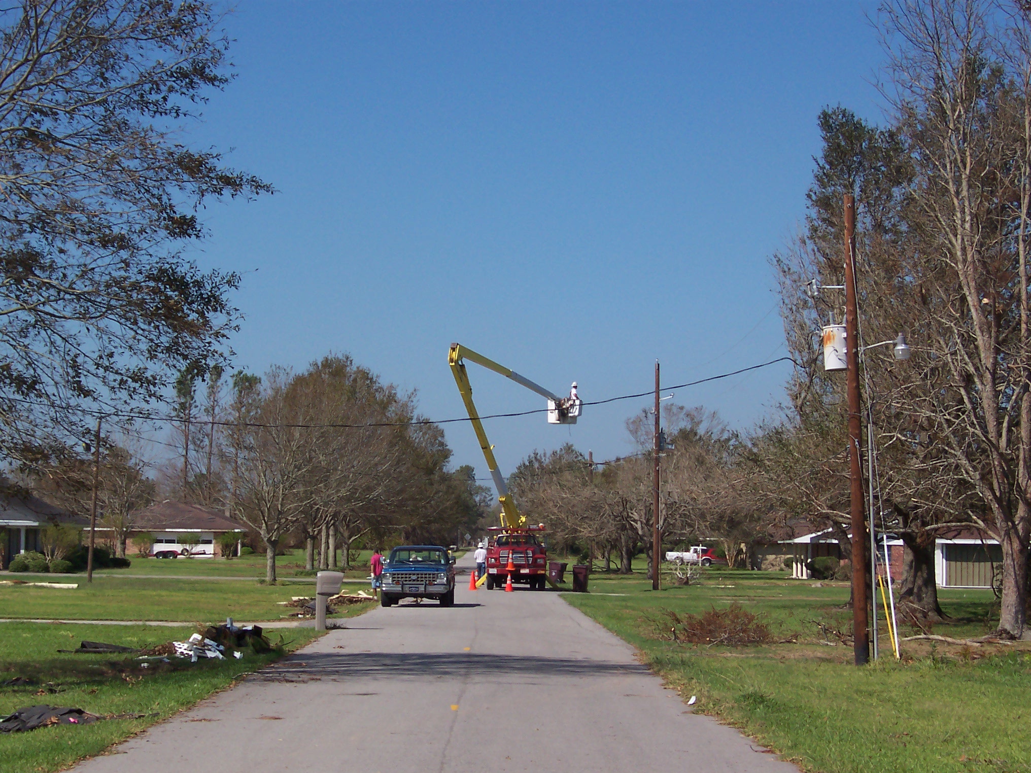 Having done all I could reasonably do, I left for the return trip to Missouri around 1PM. As I was leaving, the electrical service trucks began repairing downed lines in the neighborhood. Interestingly, a satellite was simultaneously snapping a photograph of our neighborhood. If I'd been a day later, I would have had power.