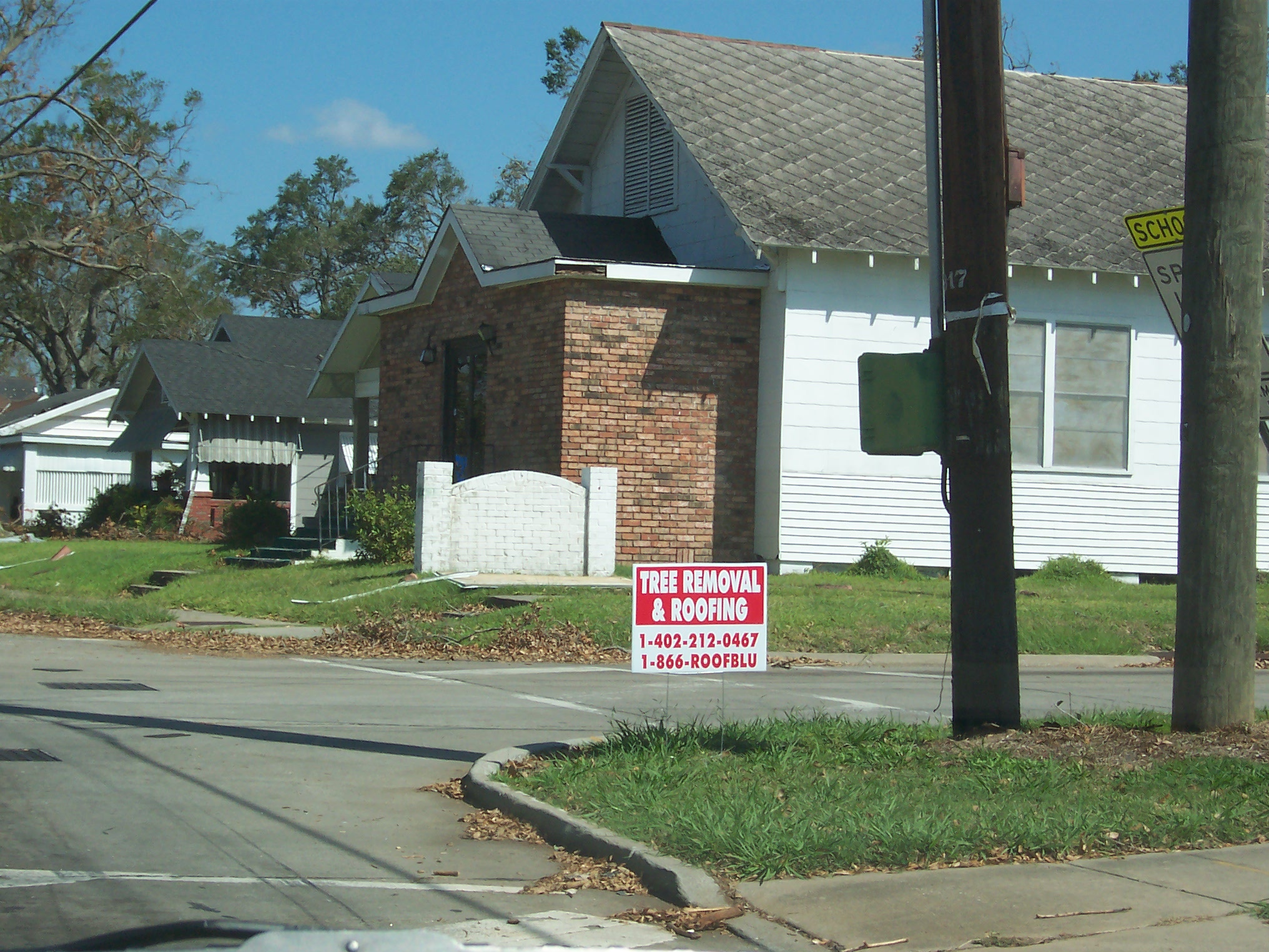 Note sign for a roofing company using a number deceptively close to the FEMA Blu-Roof program number