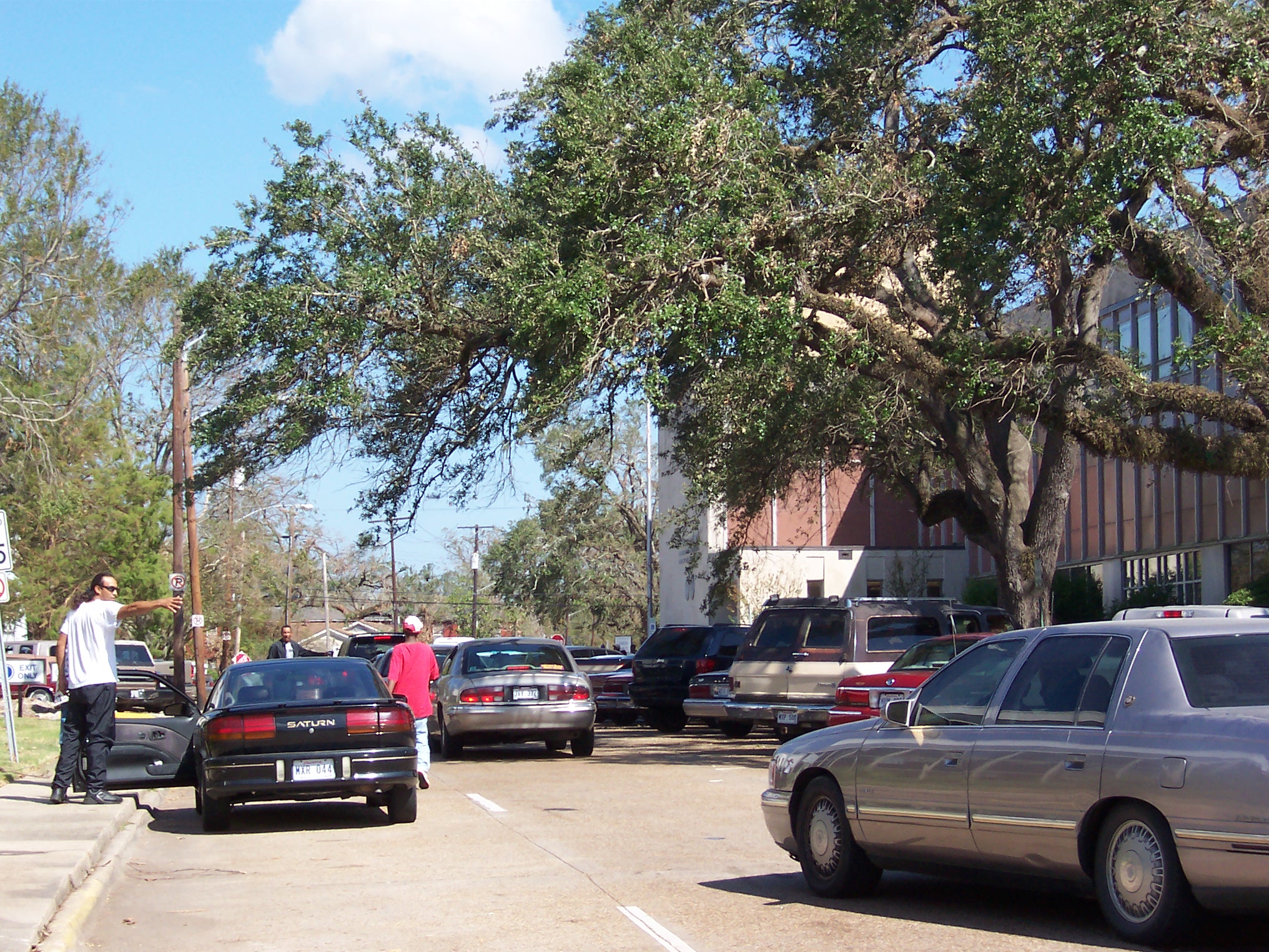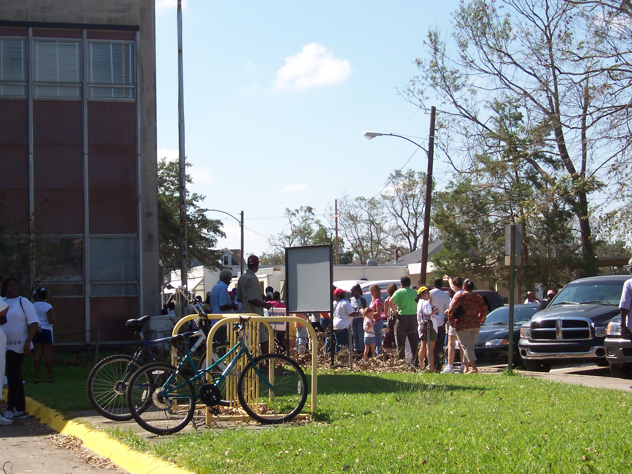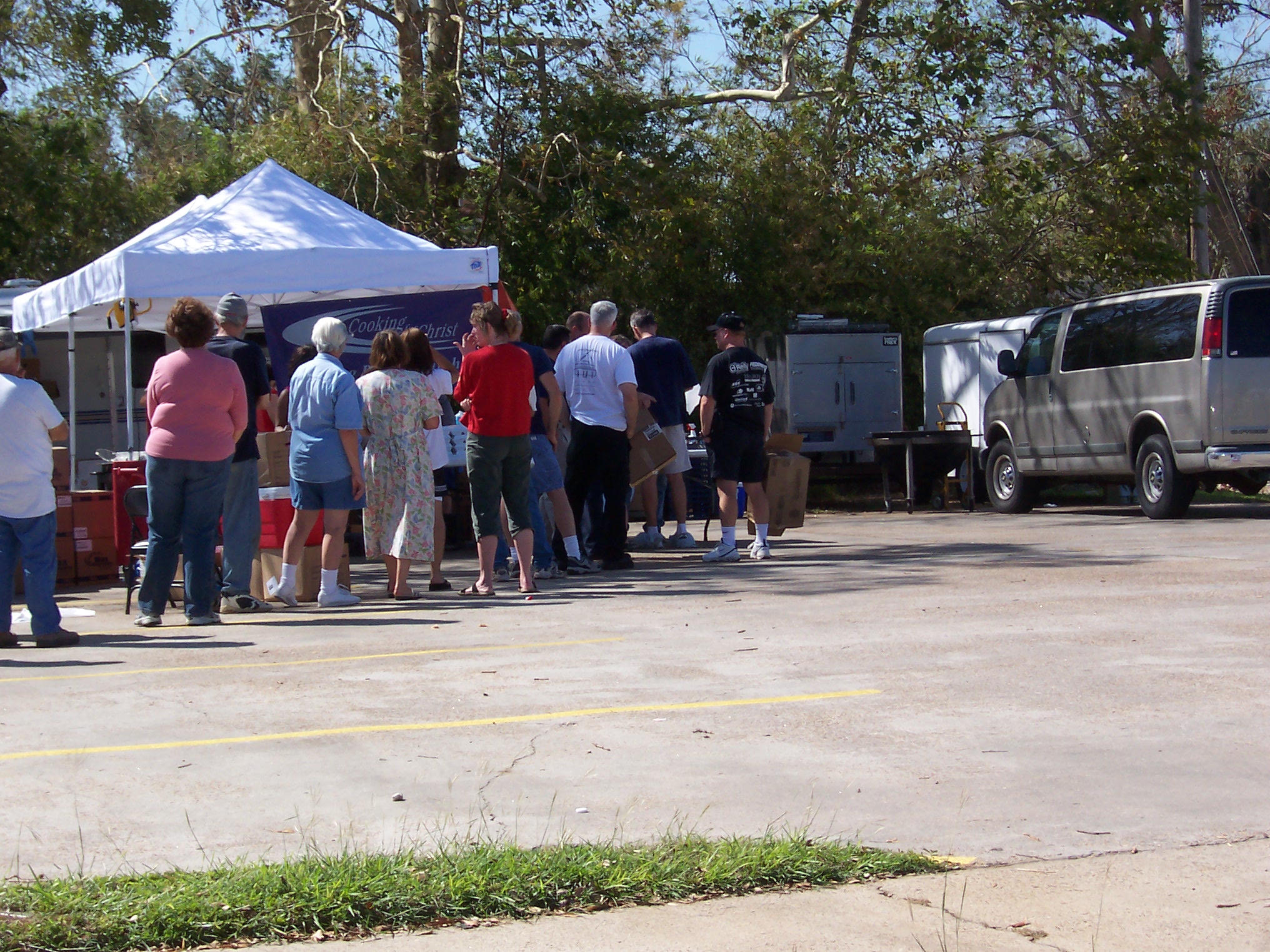 Folks lined up for free food from a church. It's hard to eat at home with no power or refrigeration.