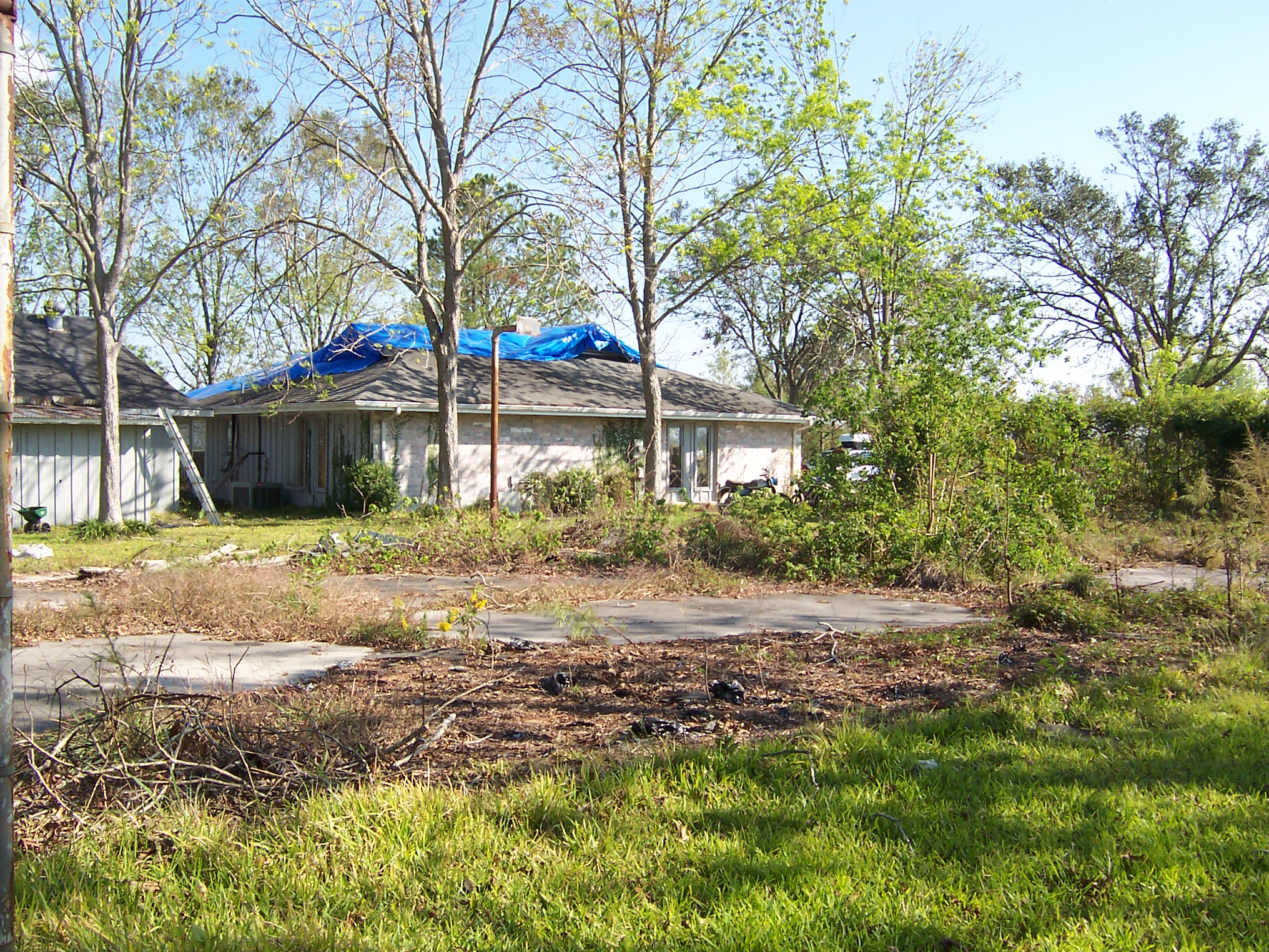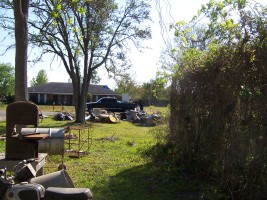 The retreat from the tennis court did give me time to start cleaning out the cabinets in the garage that had been used for storing paint, automotive fluids and other toxins. As with the rest of the house, there was stuff in there that had been forgotten since the '60s...including my father's diplomas!? Although I could have taken the low road and bagged the stuff up for FEMA to haul off, I started a collection on the driveway in hopes of finding some more ecologically sensitive destination in the future. I never found such a place and our contractor ultimately had to volunteer to deal with it at some point in the reconstruction.