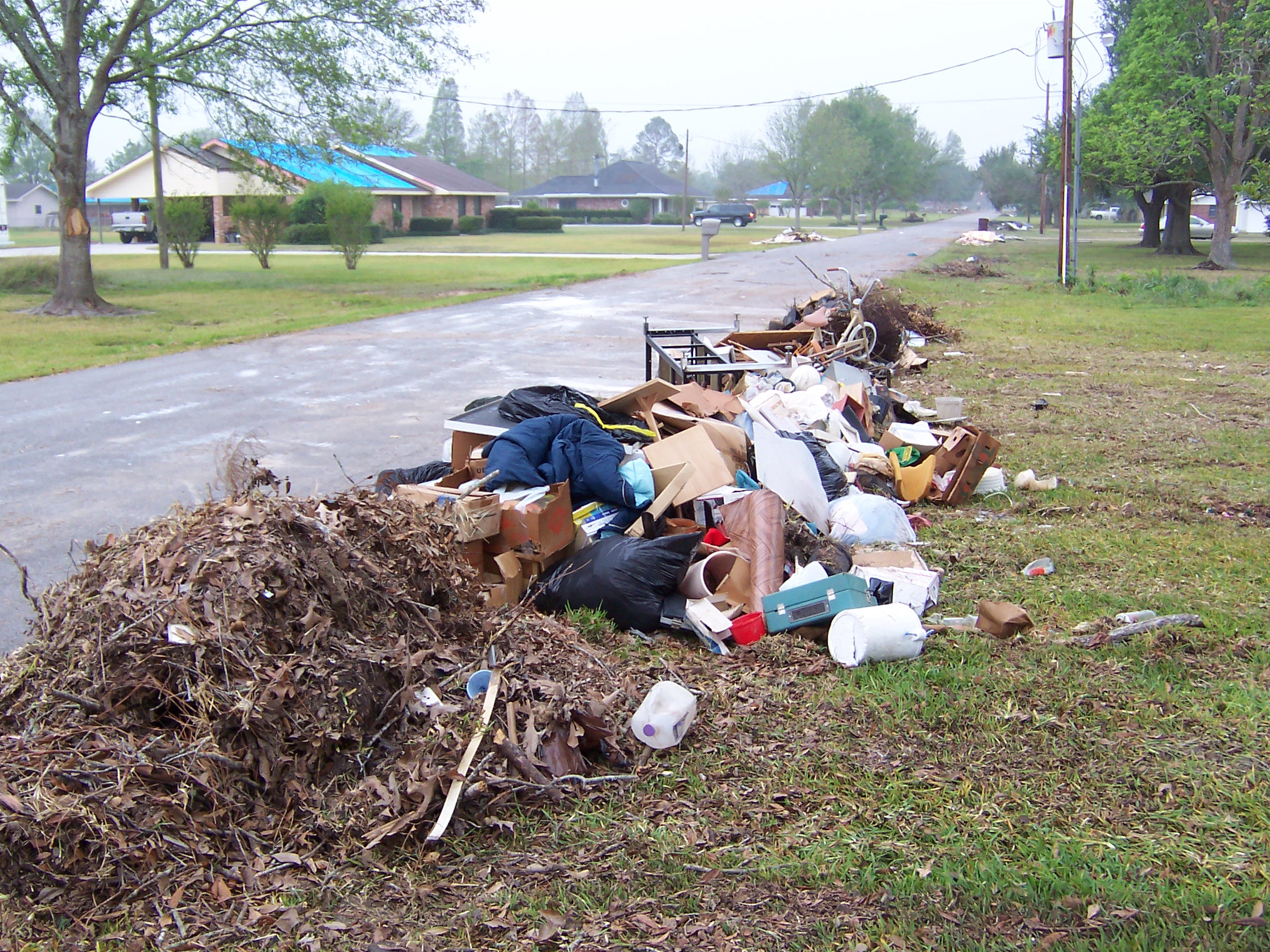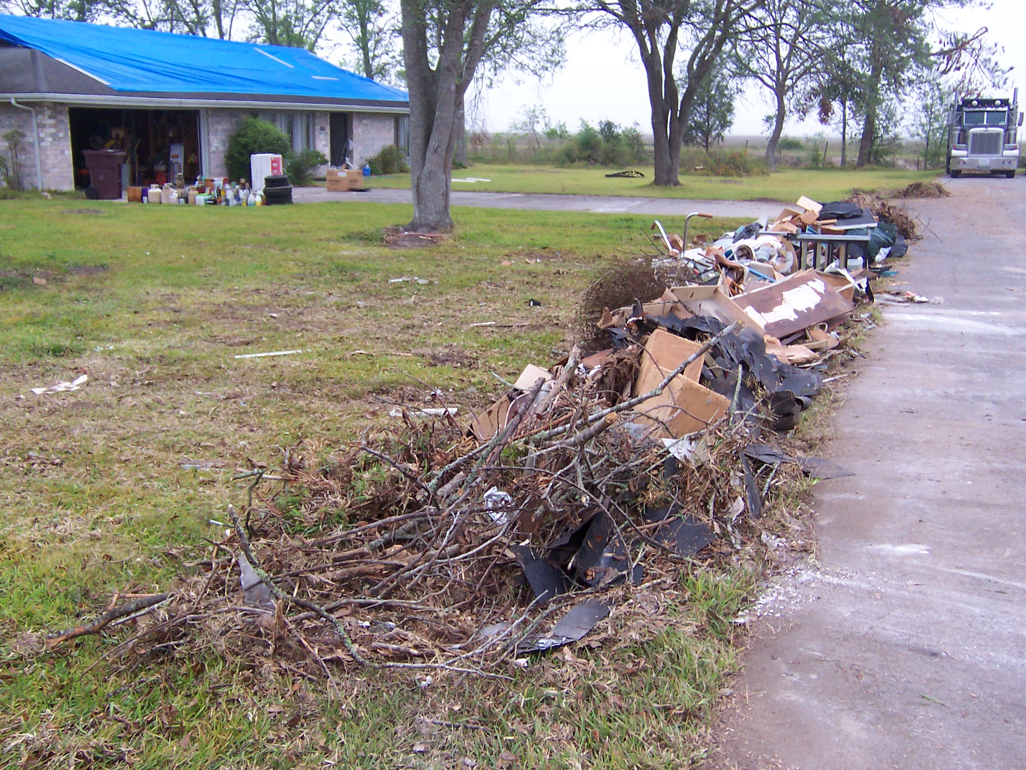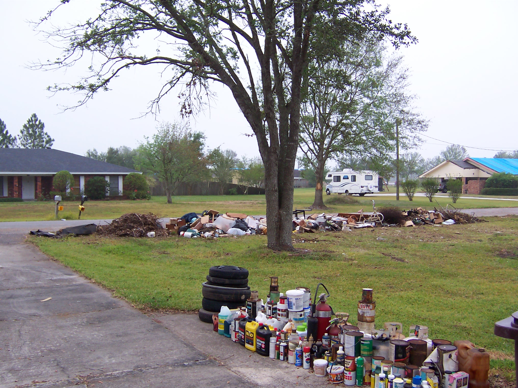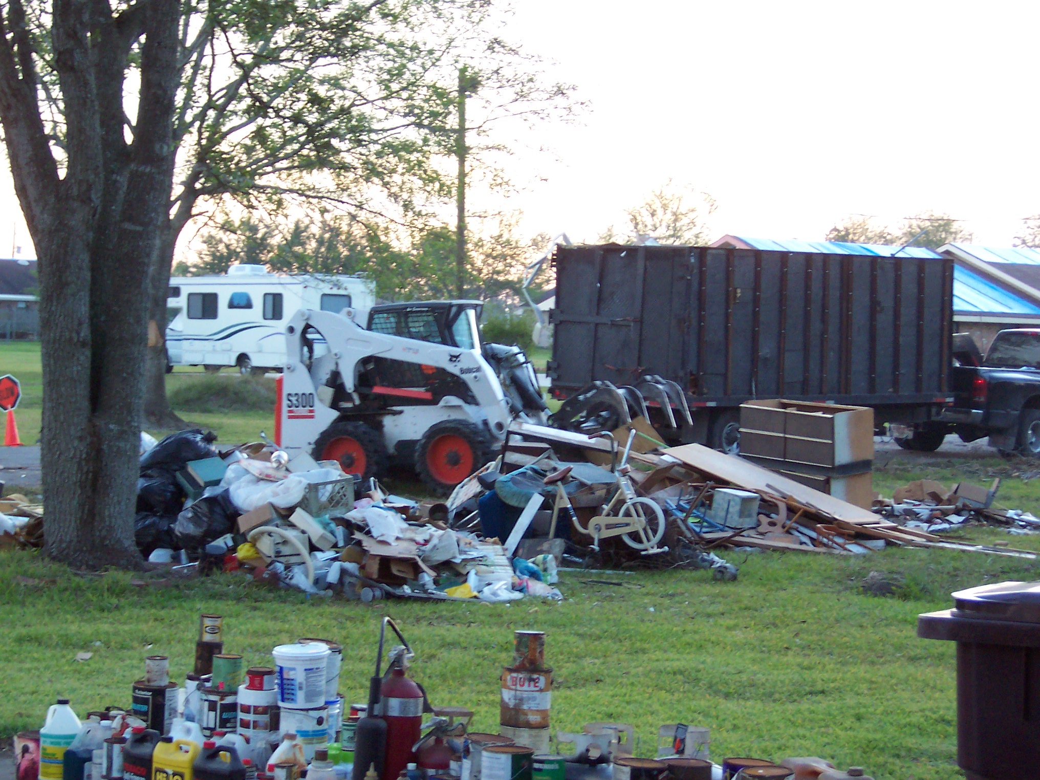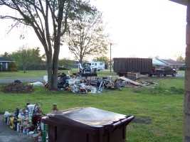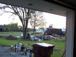 Much to my delight, contractors for the long-rumored FEMA pickup arrived and began hauling off the huge pile of garbage that had accumulated on the curb. Also to my surprise, most of it compressed very nicely and fit in a single trailer. The only things they refused to haul off were old tires and toxic chemicals.