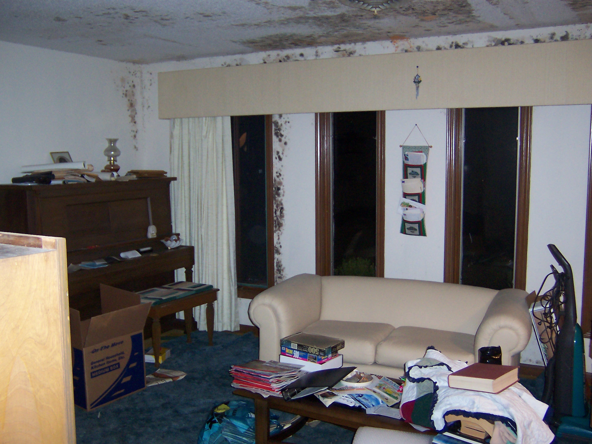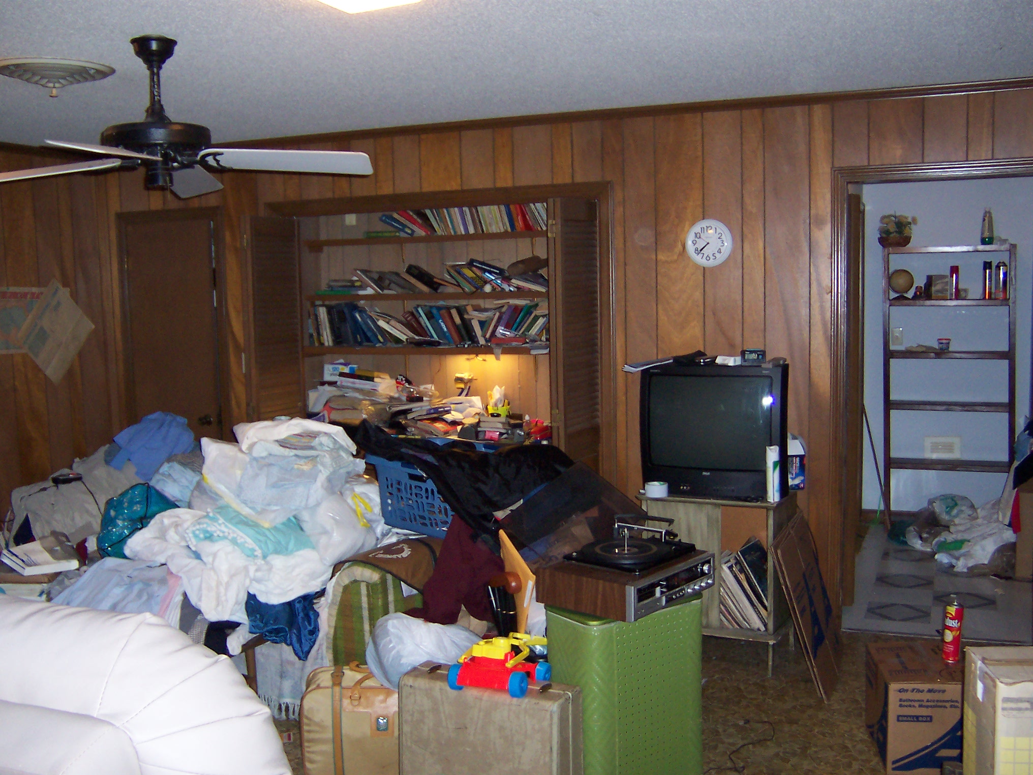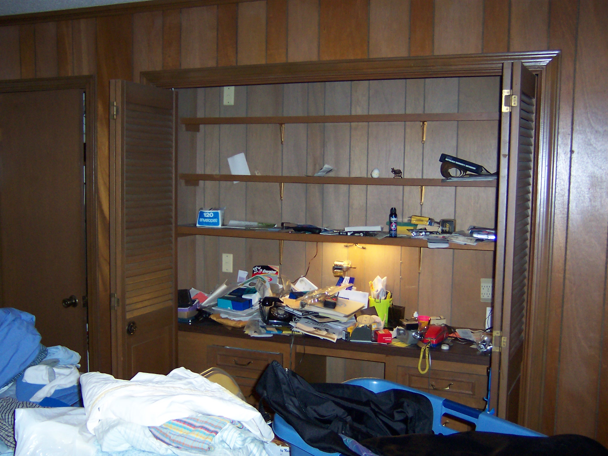 The desk in the Den was built-in under a set of bookshelves and hidden behind a pair of louvered doors. Certainly a product of its time, it wasn't a very good desk and defied attempts to use it to house home entertainment equipment. As the condition of the house declined, household goods continued to pile up under stacks of ancient books that were never opened and were largely invisible behind the louvered doors.