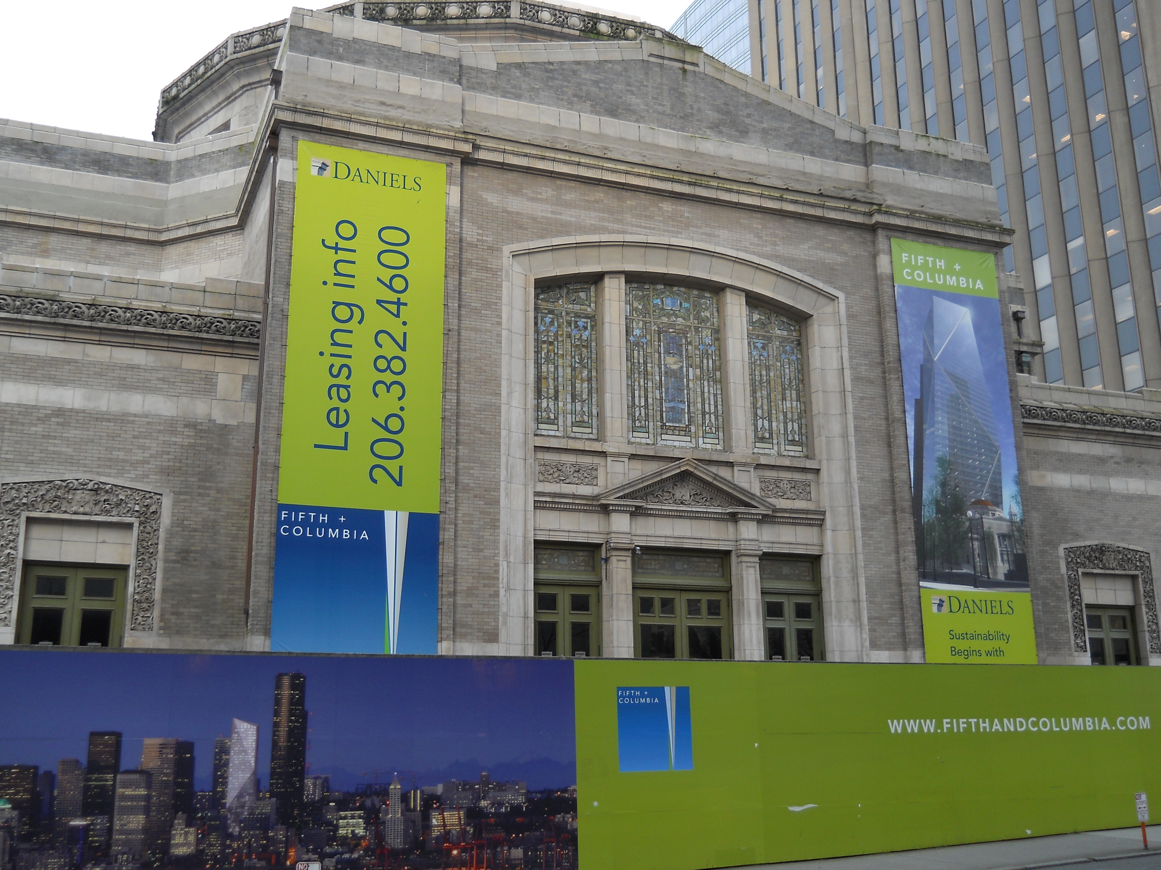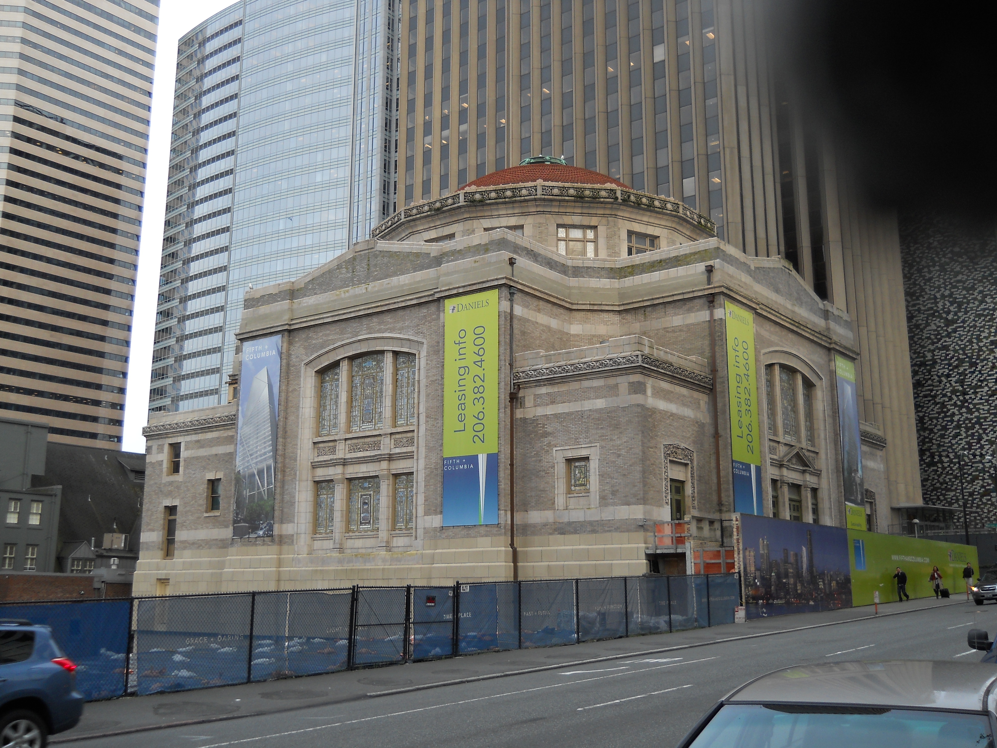 This Beaux Arts building was built as the second home for the First Methodist Episcopal Church. The congregation added an education wing in 1950 on the eastern corner of the block. After a pitched 23-year battle between preservationists, developers, and the church itself, the congregation sold the building in 2007 to Daniels Development and moved to a suburban location at Second Avenue North and Denny Way that was dedicated on 31 January 2010. The 1908 building was listed on the National Register of Historic Places in 2011. The education wing was demolished for a $450 MM, 660-foot mixed-use tower originally called 5th and Columbia, then The Mark, then F5 Tower after a tech company that leased all of the office space. The preserved sanctuary served as Daniels Recital Hall before reopening in 2018 as an event space called The Sanctuary.