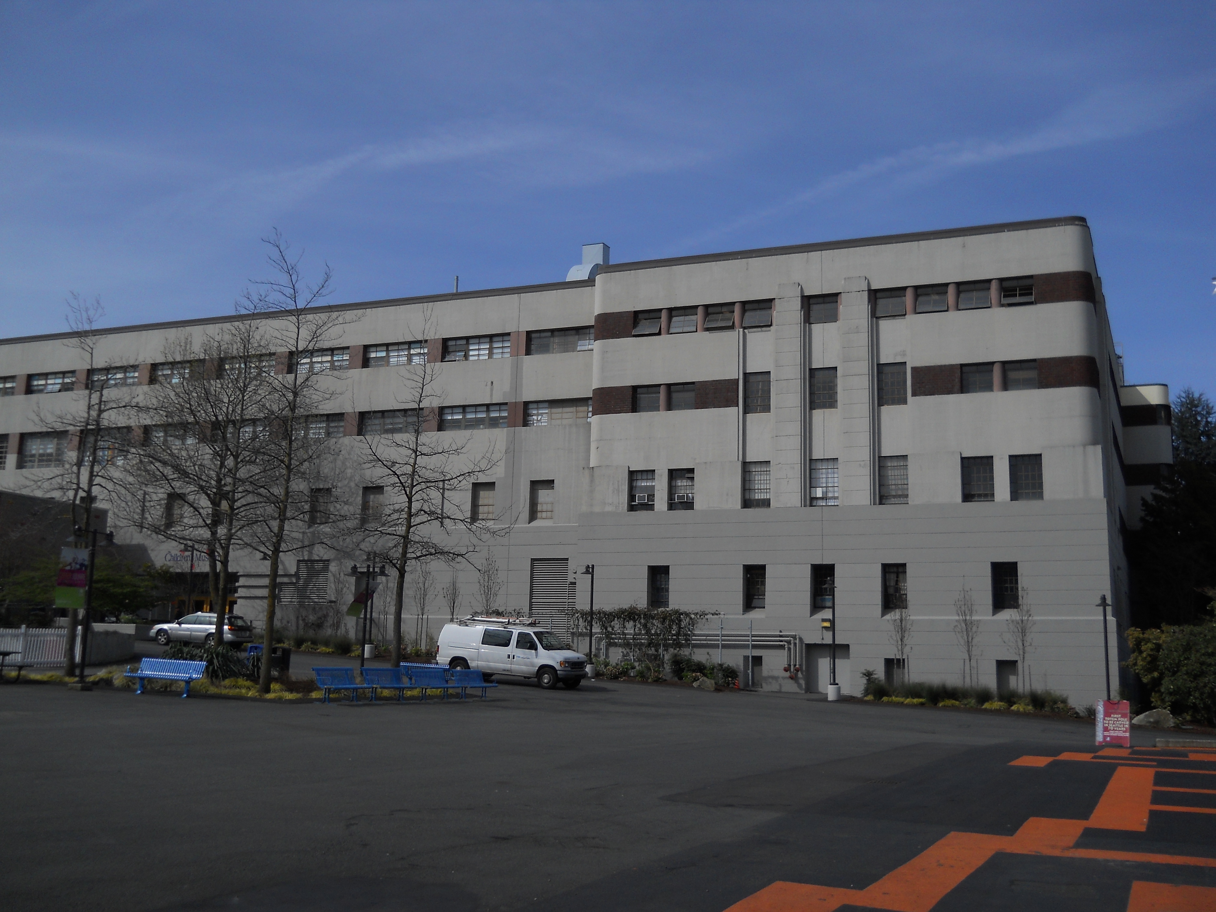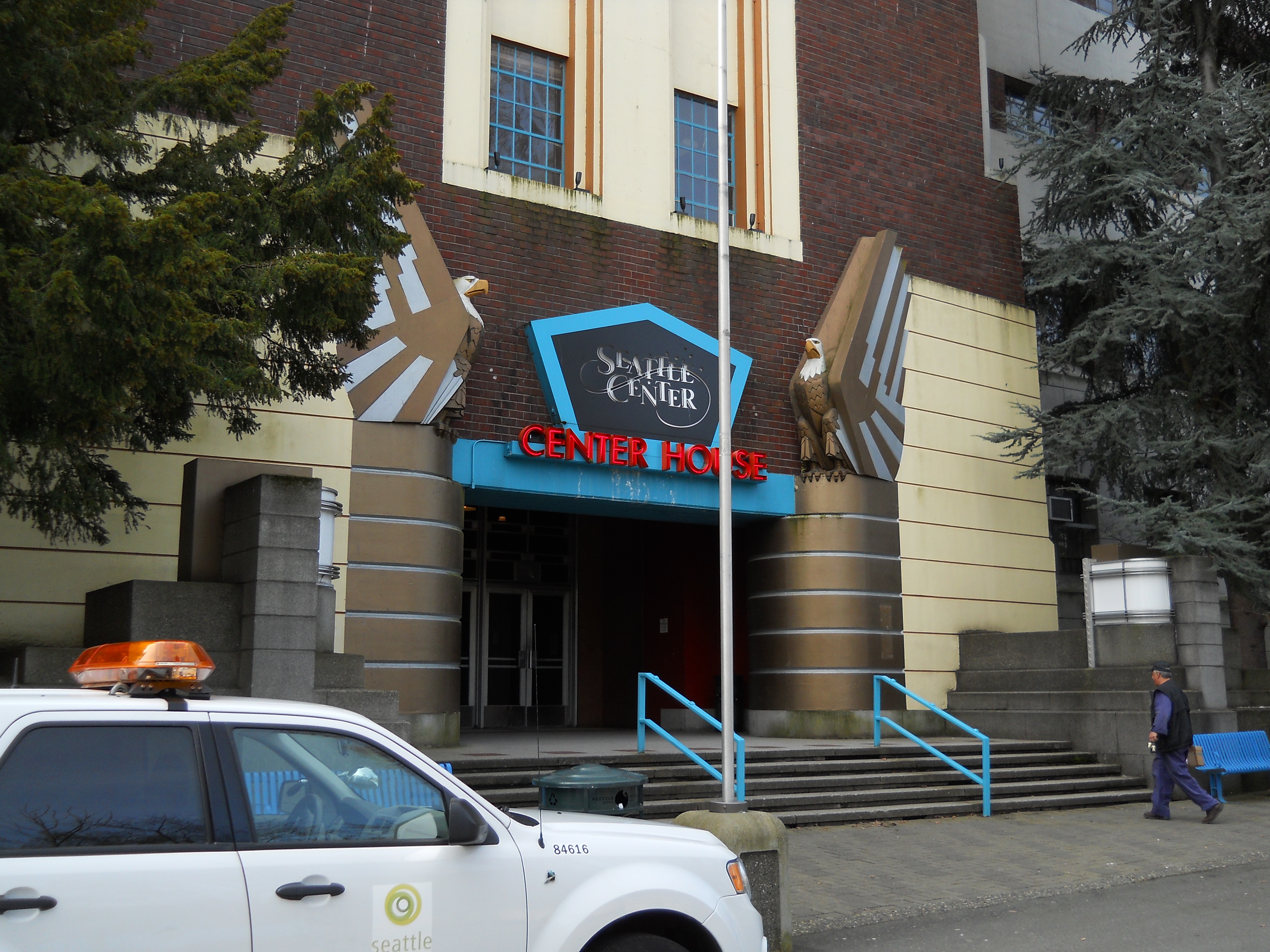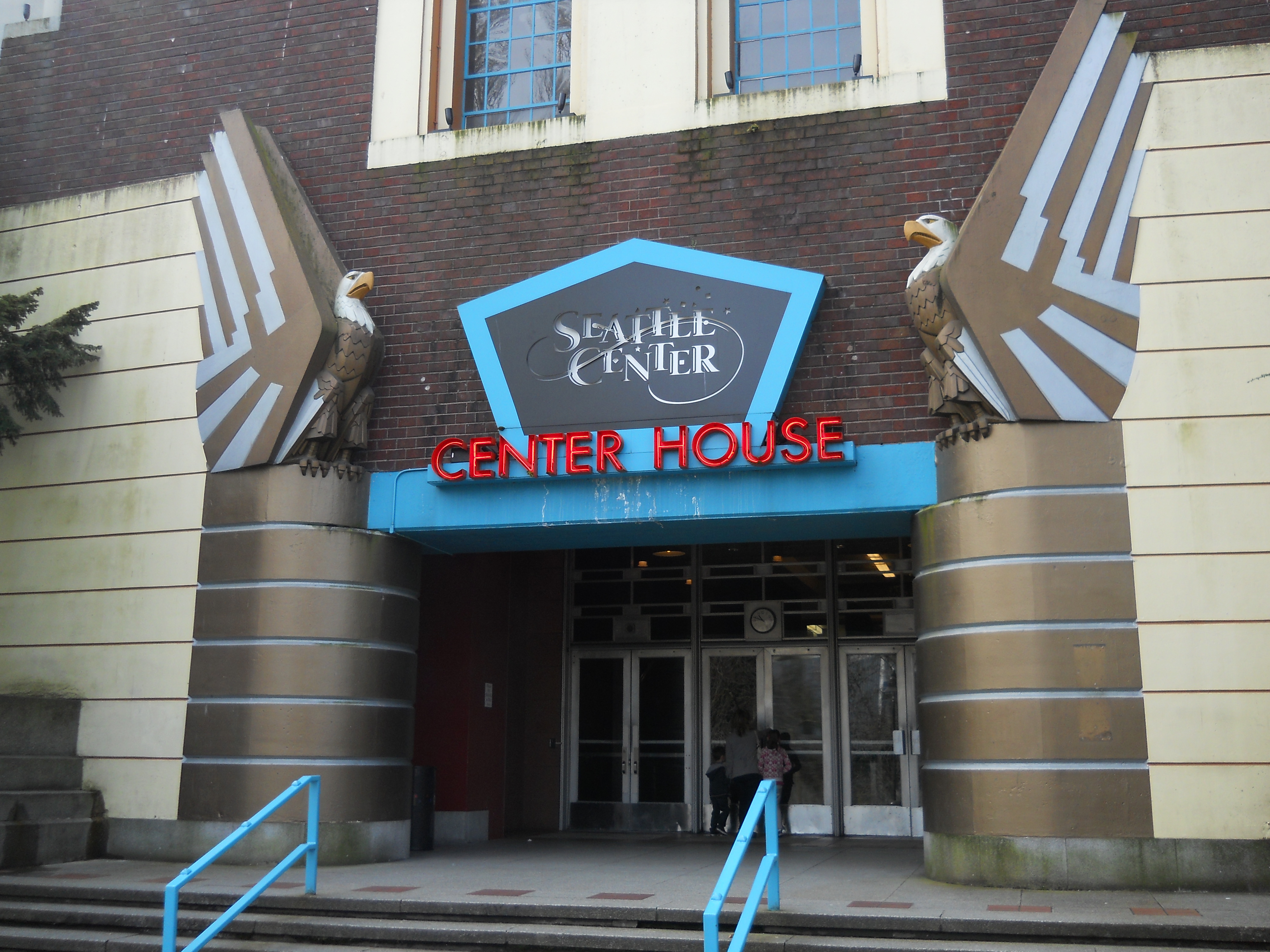 This Art Moderne structure was built by the New-Deal-era Public Works Administration as a home for the 146th Field Artillery. The building was remodeled during WW II for housing and training. During the 1962 World's Fair, the building was used as the Food Circus, and further renovated in the early 1970s as Center House.
