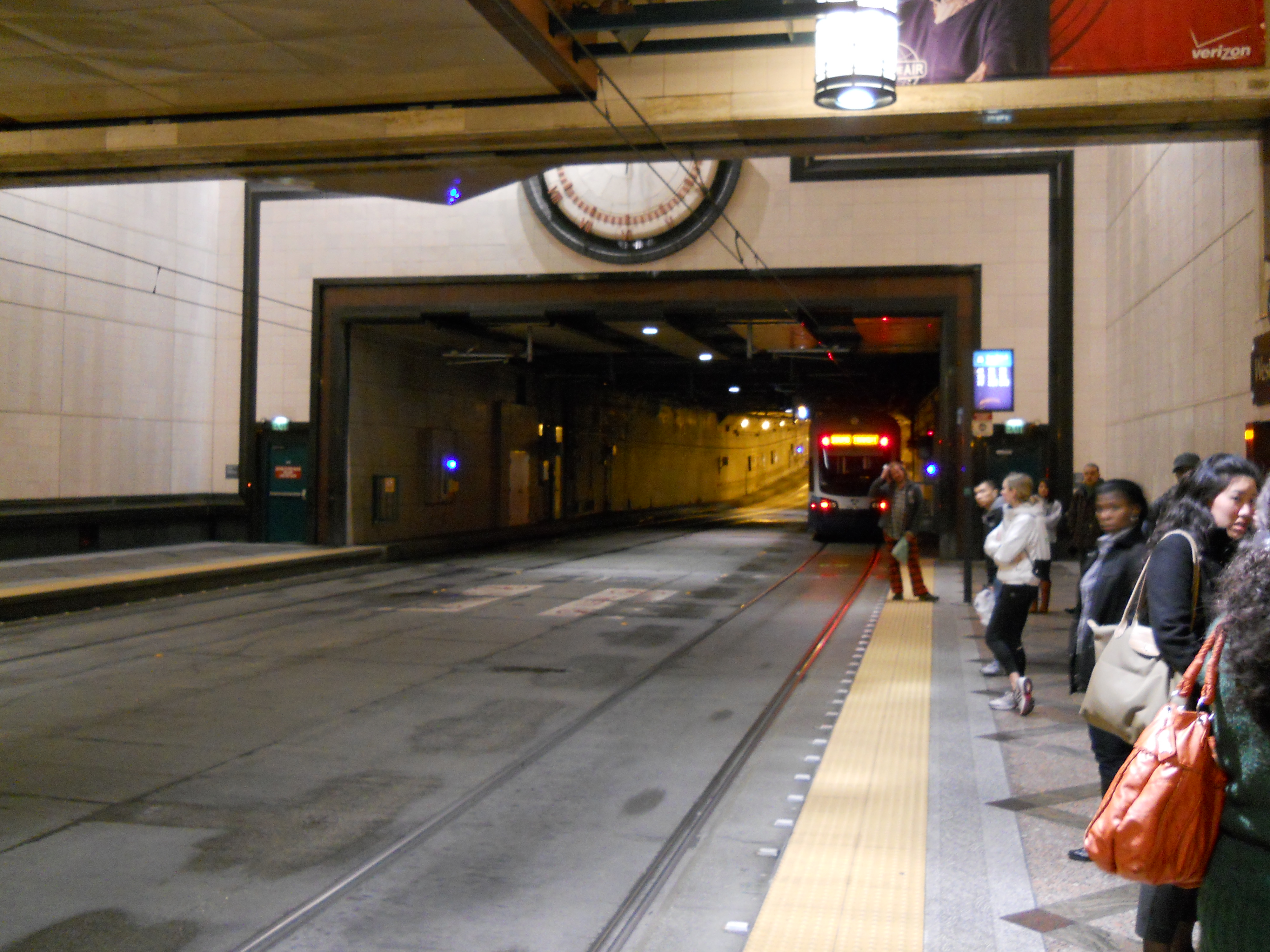 Light rail arriving at the International District Station (video)