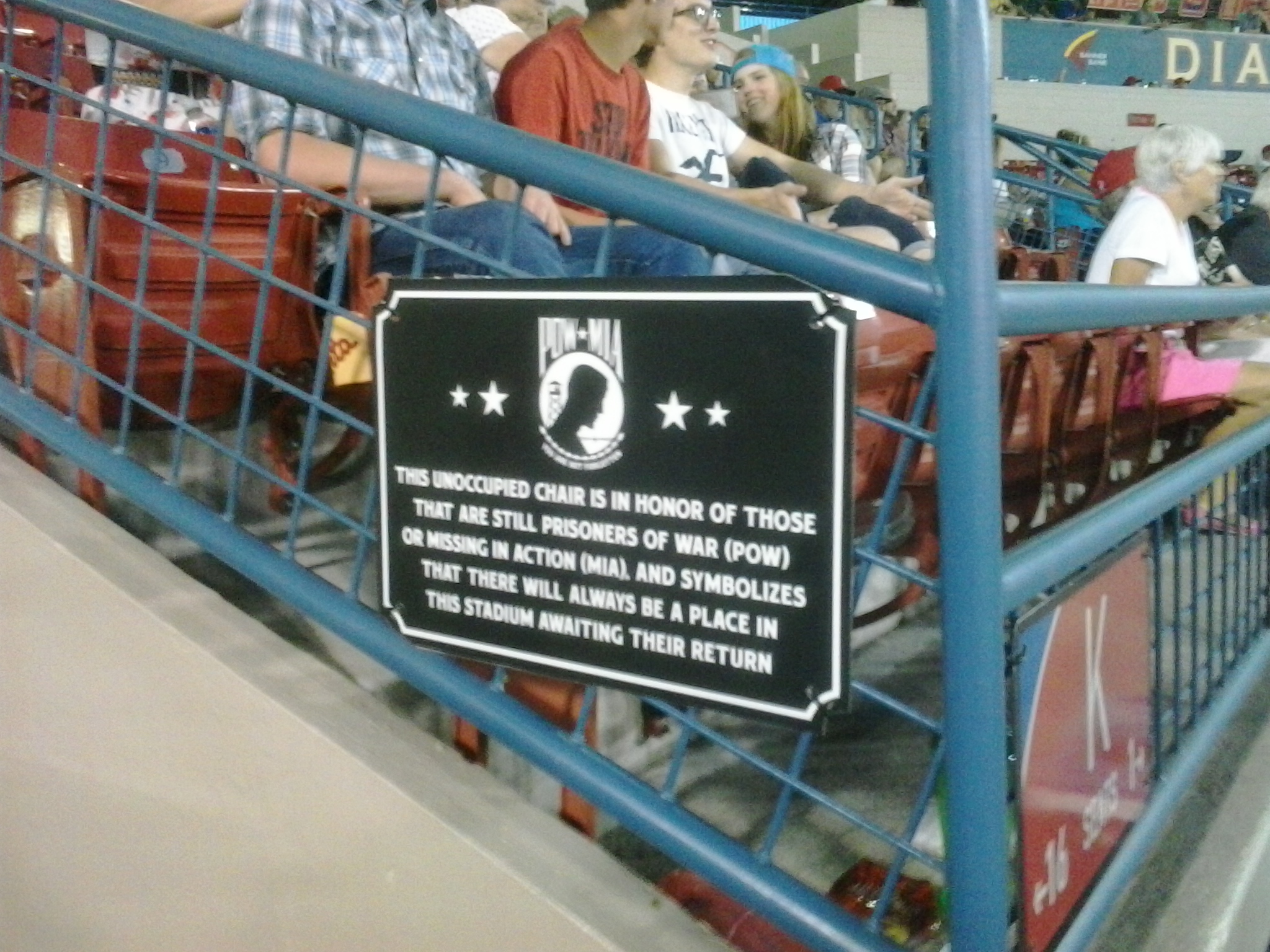 This unoccupied chair is in honor of those that are still prisoners of war (POW) or missing in action (MIA), and symbolizes that there will always be a place in this stadium awaiting their return