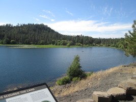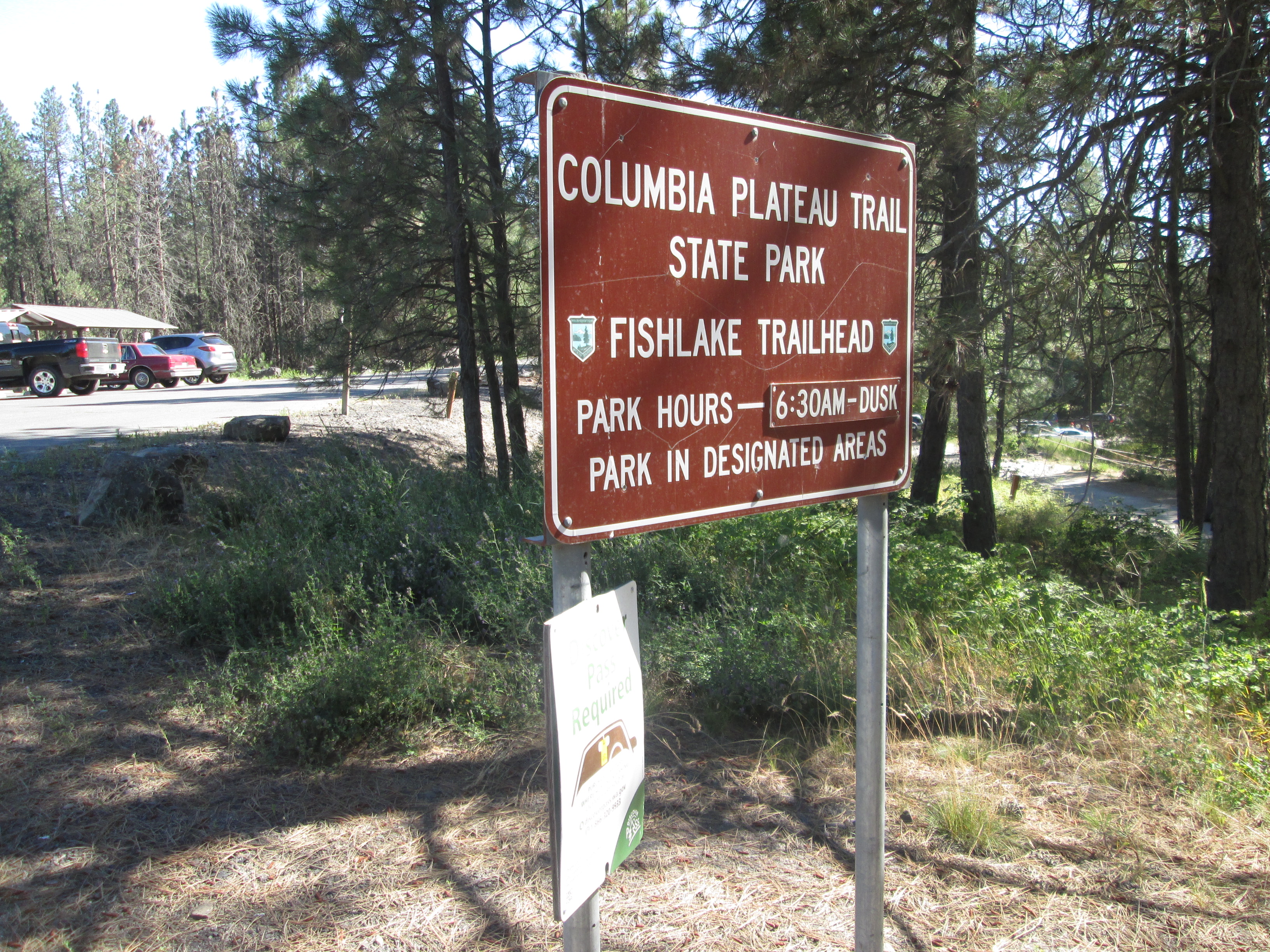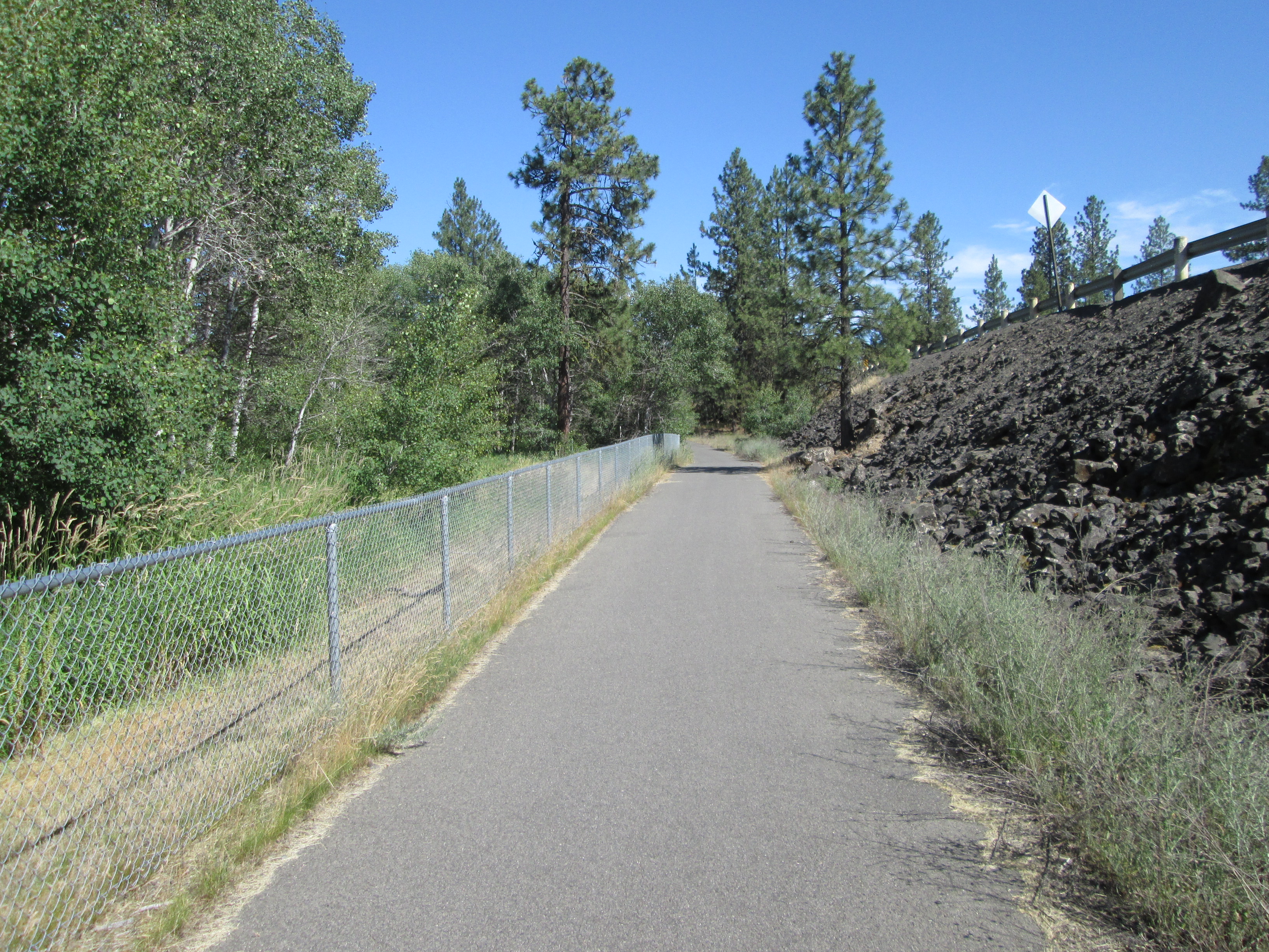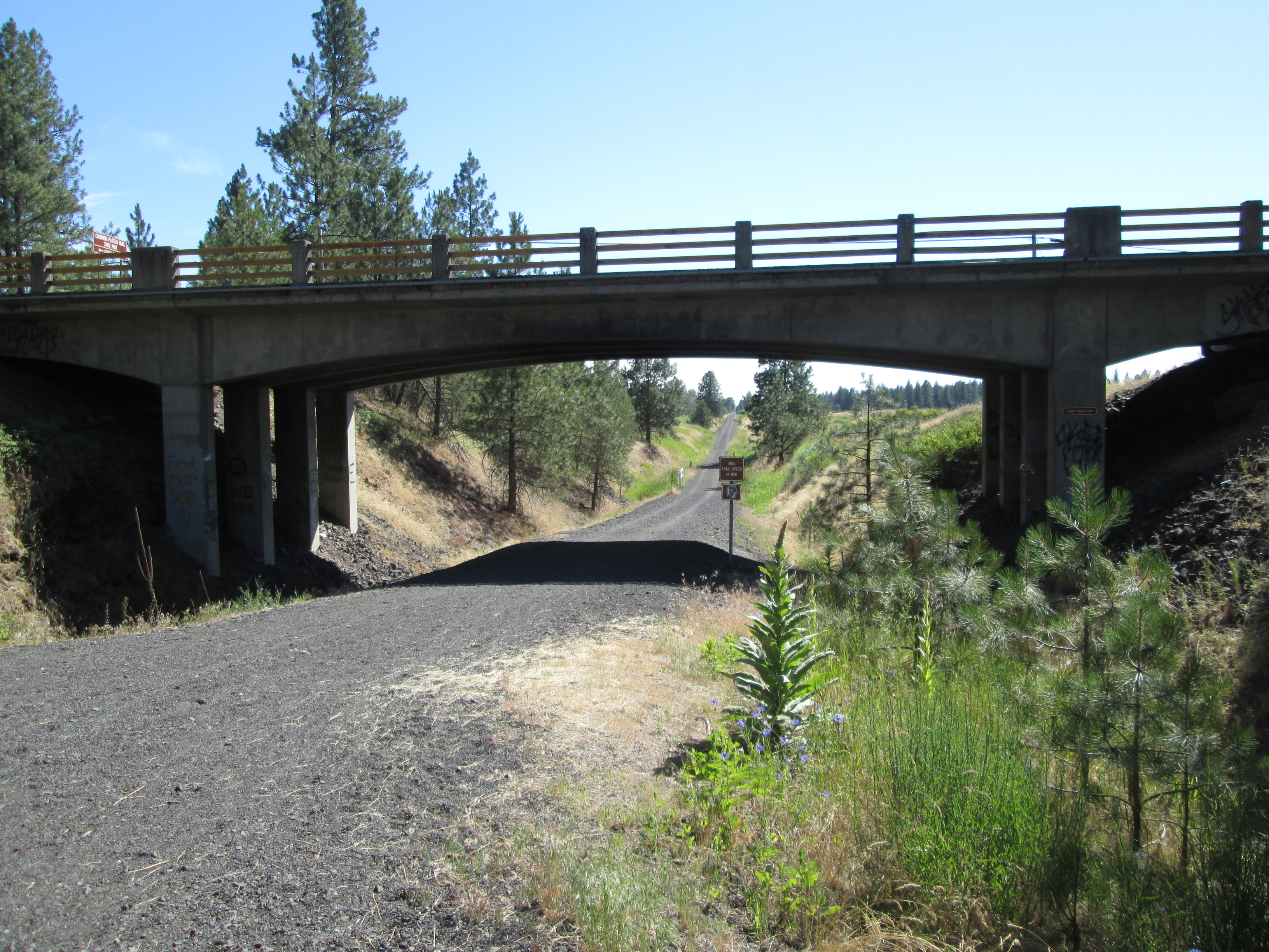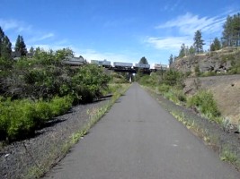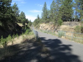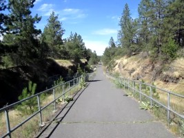 The Columbia Plateau Trail terminates at the Fish Lake trailhead, but with an unpleasant two-mile trek up to Cheney-Spokane road, Spokane Parks' Fish Lake Trail on an abandoned section of UP right-of-way resumes north of Queen Lucas Lake at Scribner Road.
