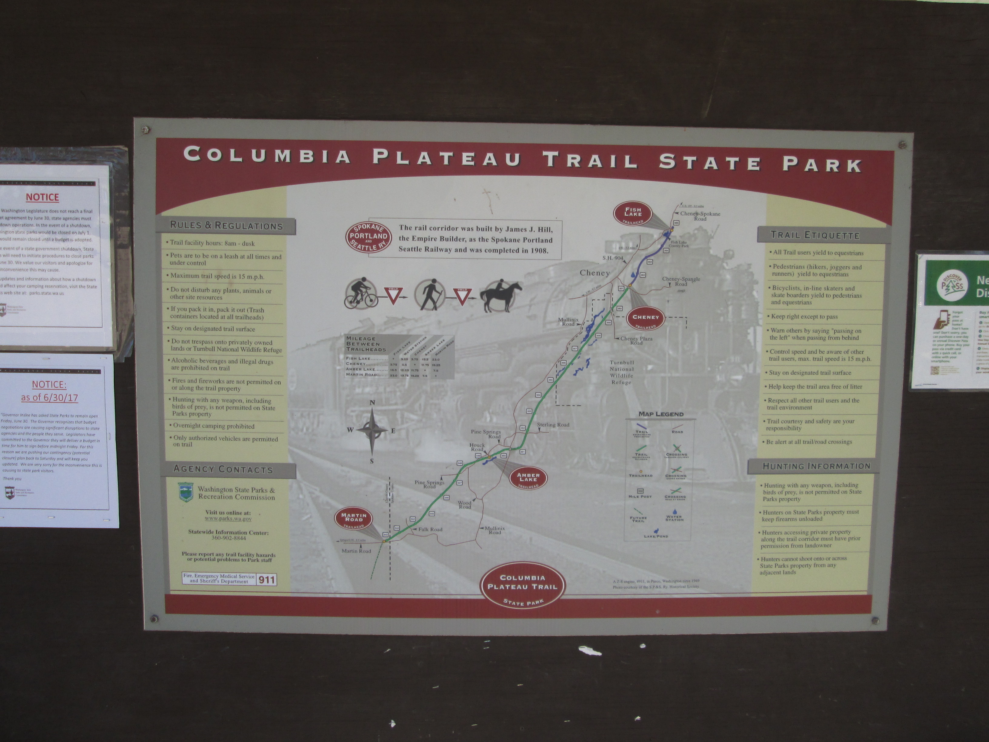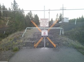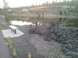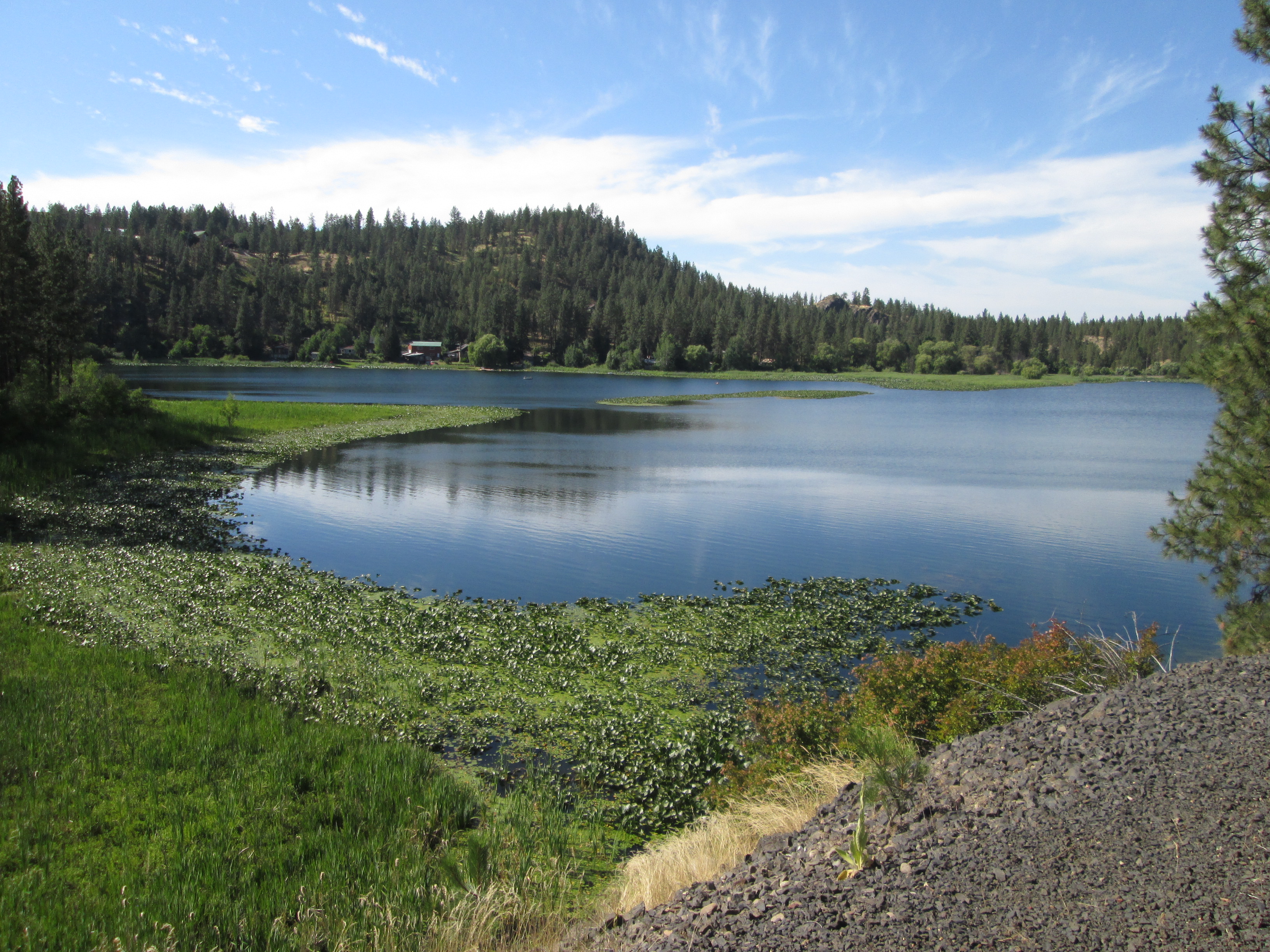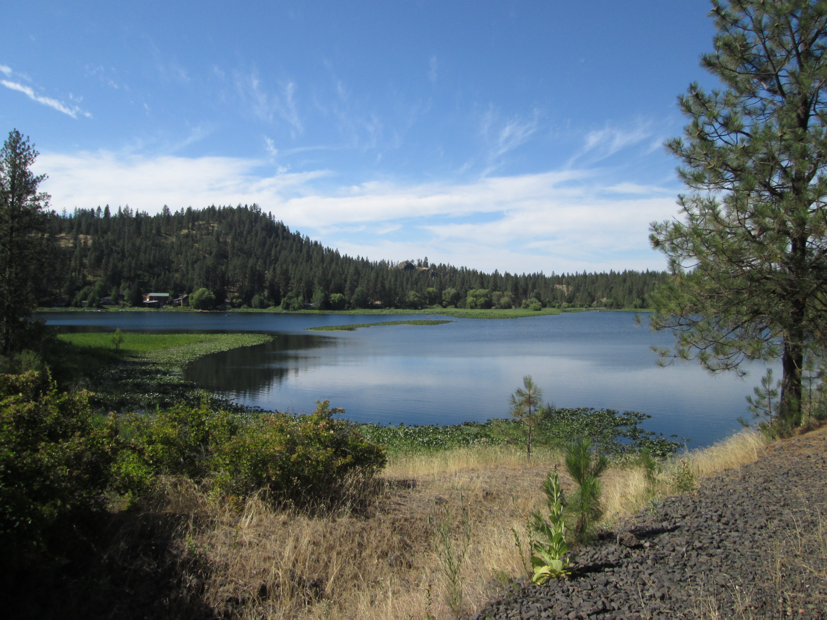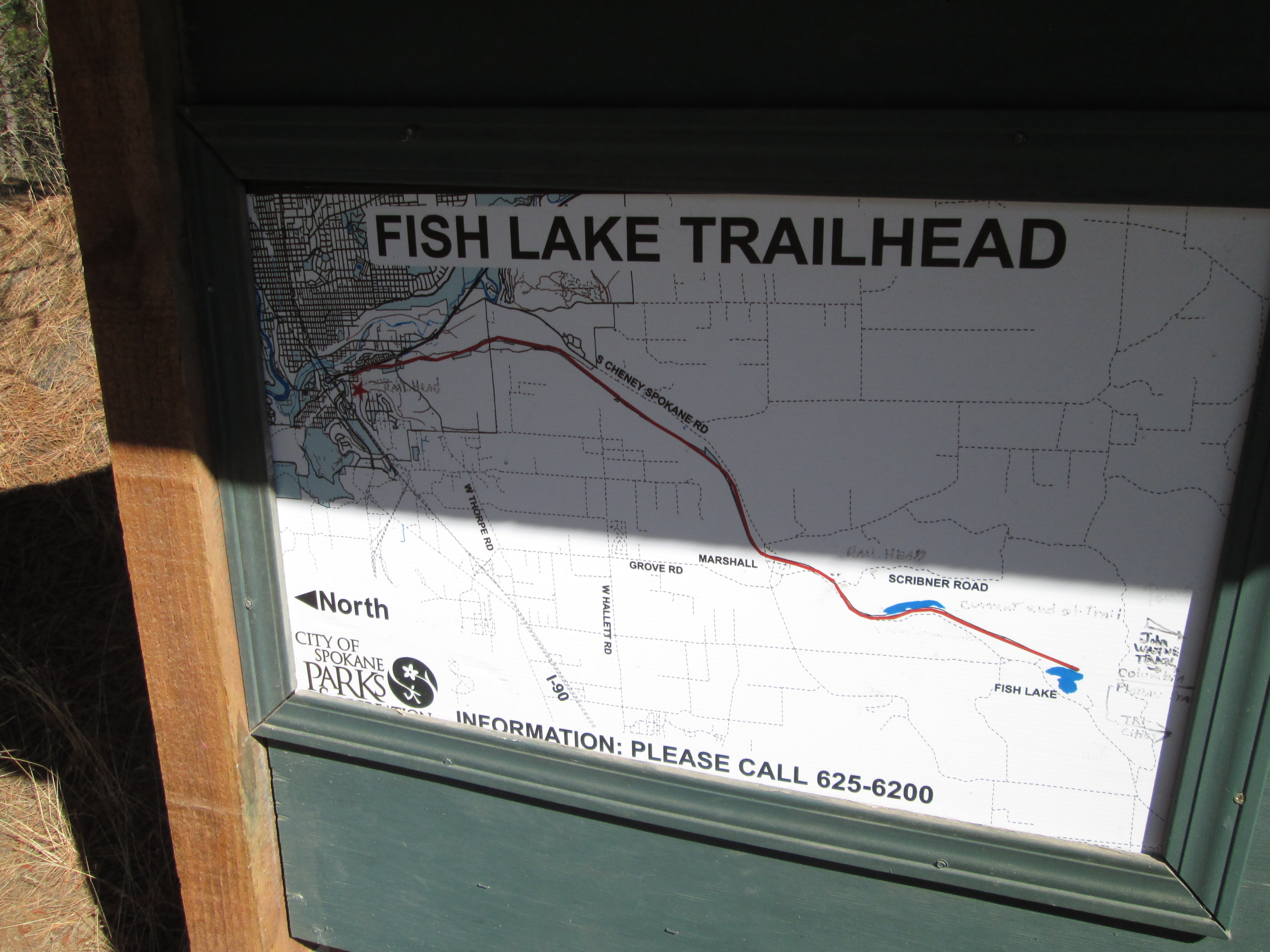 The Columbia Plateau Trail terminates at the Fish Lake trailhead, but with an unpleasant two-mile trek up to Cheney-Spokane road, Spokane Parks' Fish Lake Trail on an abandoned section of UP right-of-way resumes north of Queen Lucas Lake at Scribner Road.