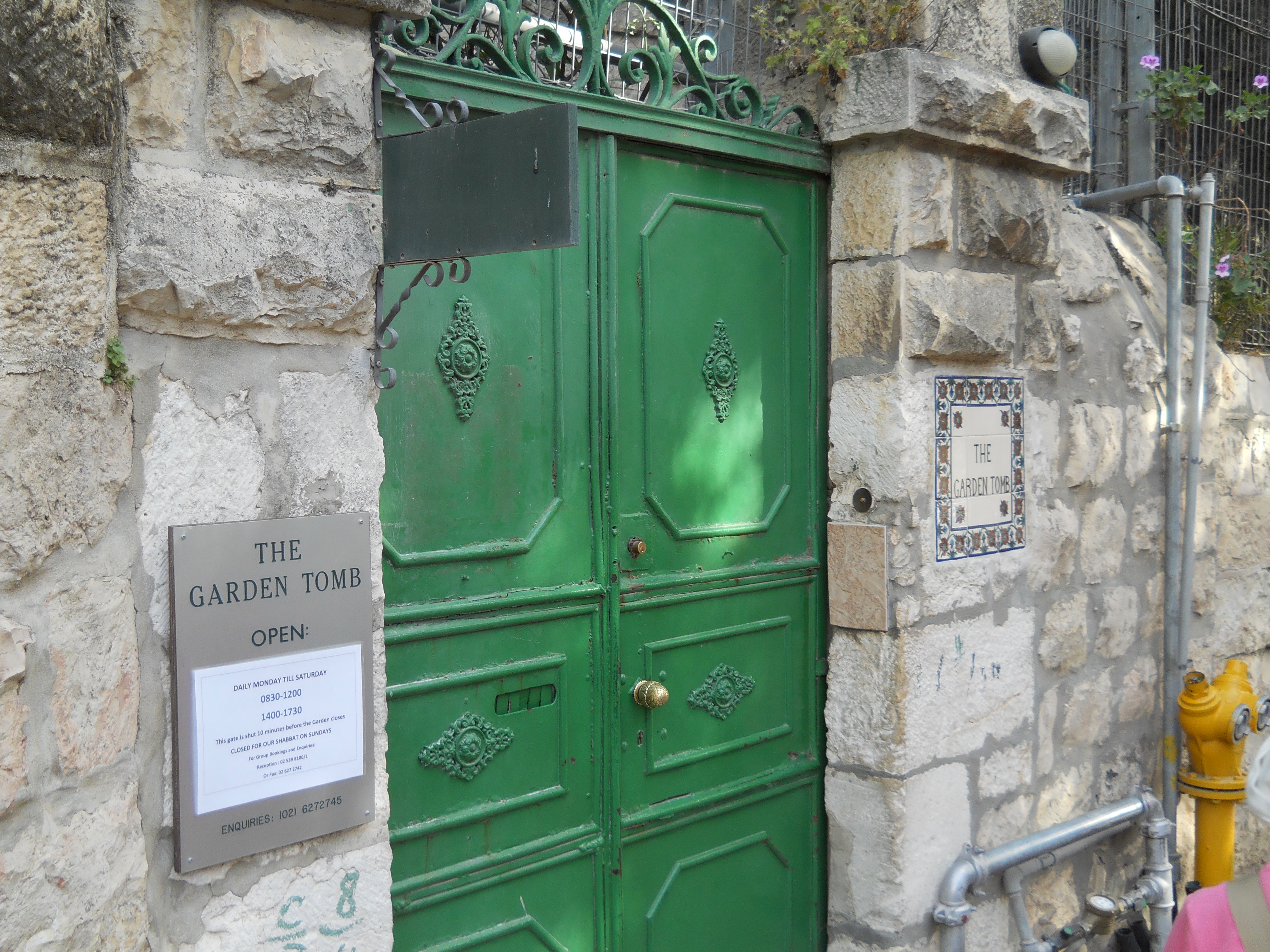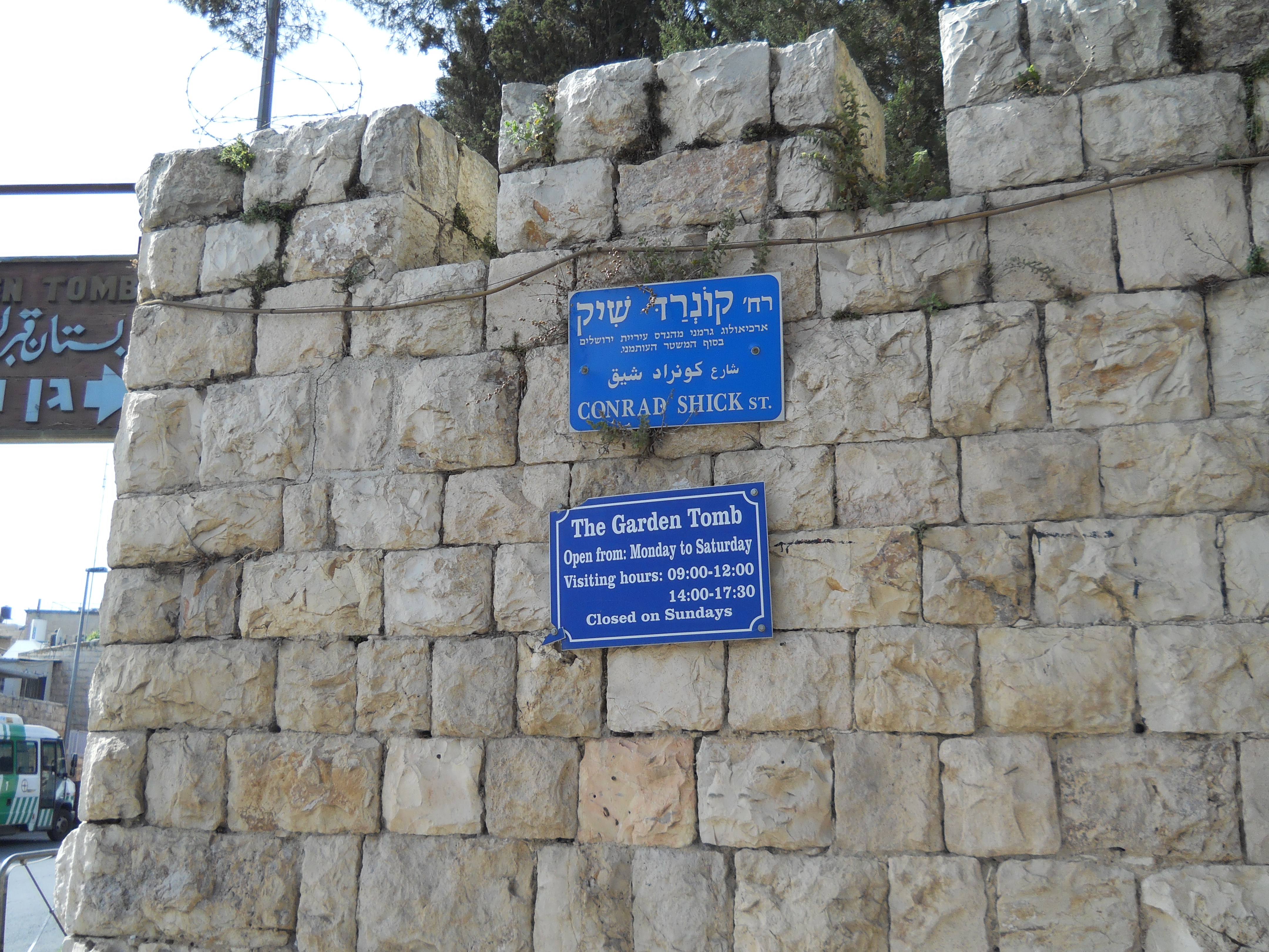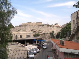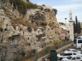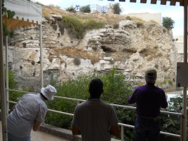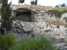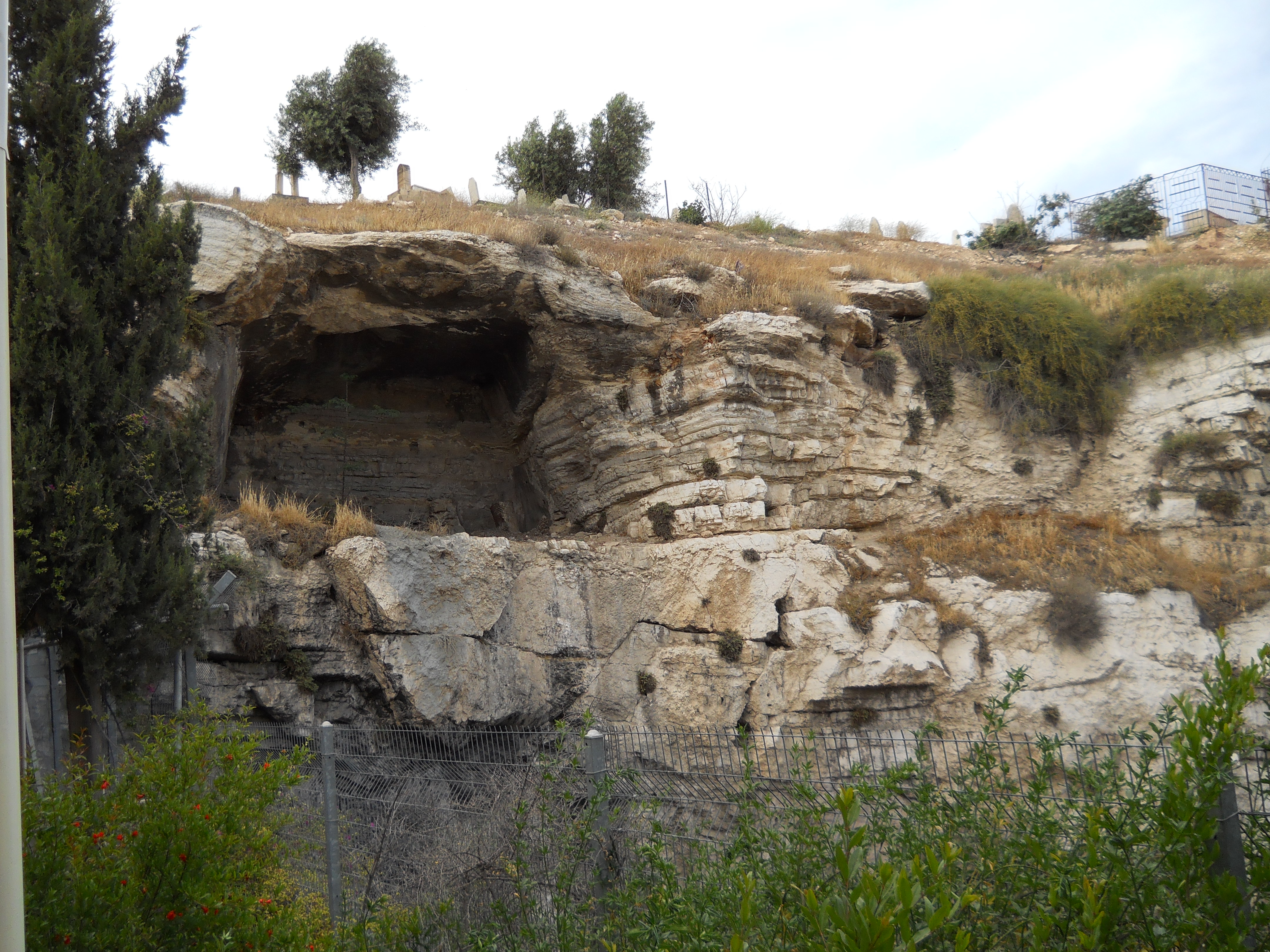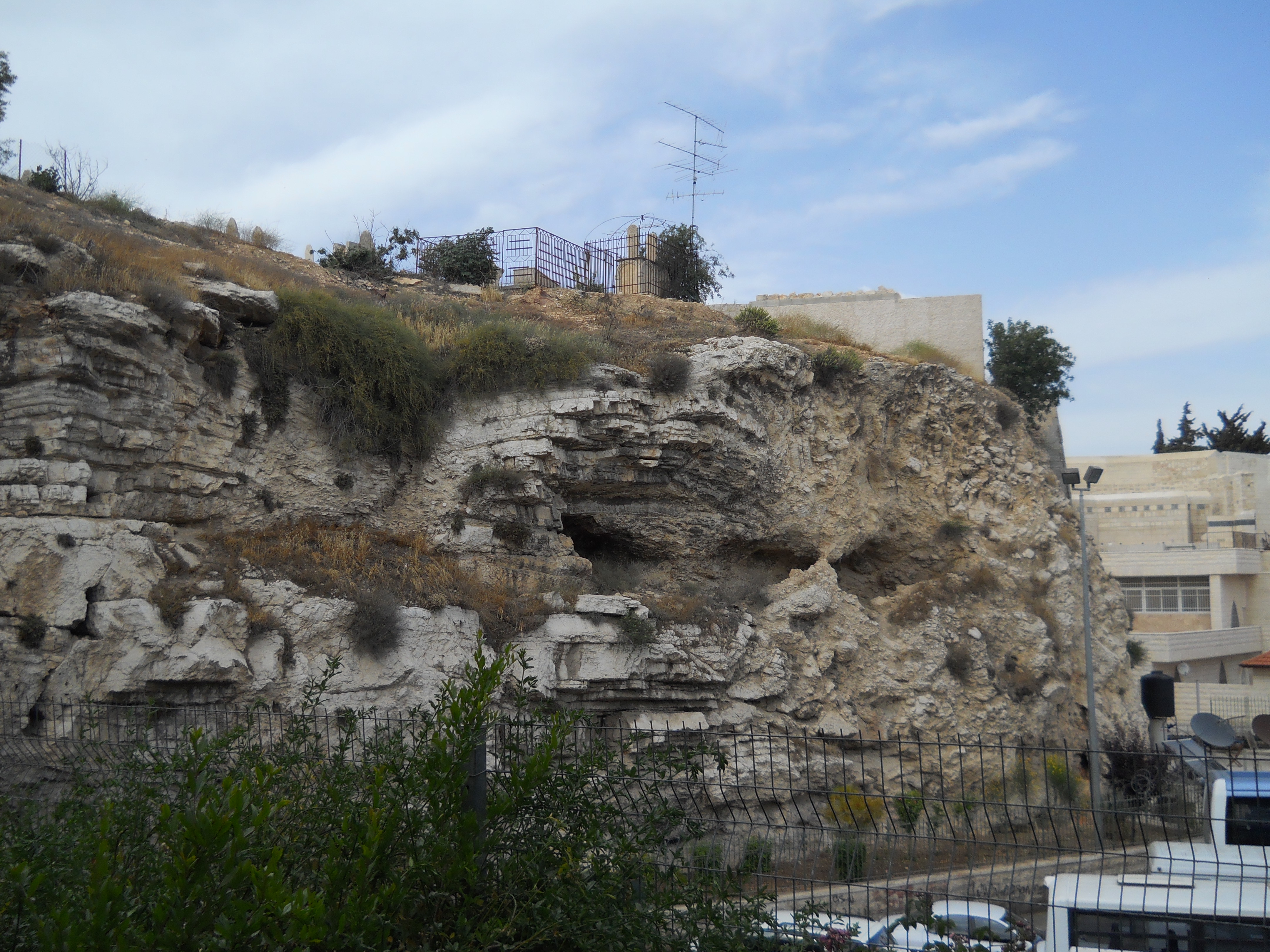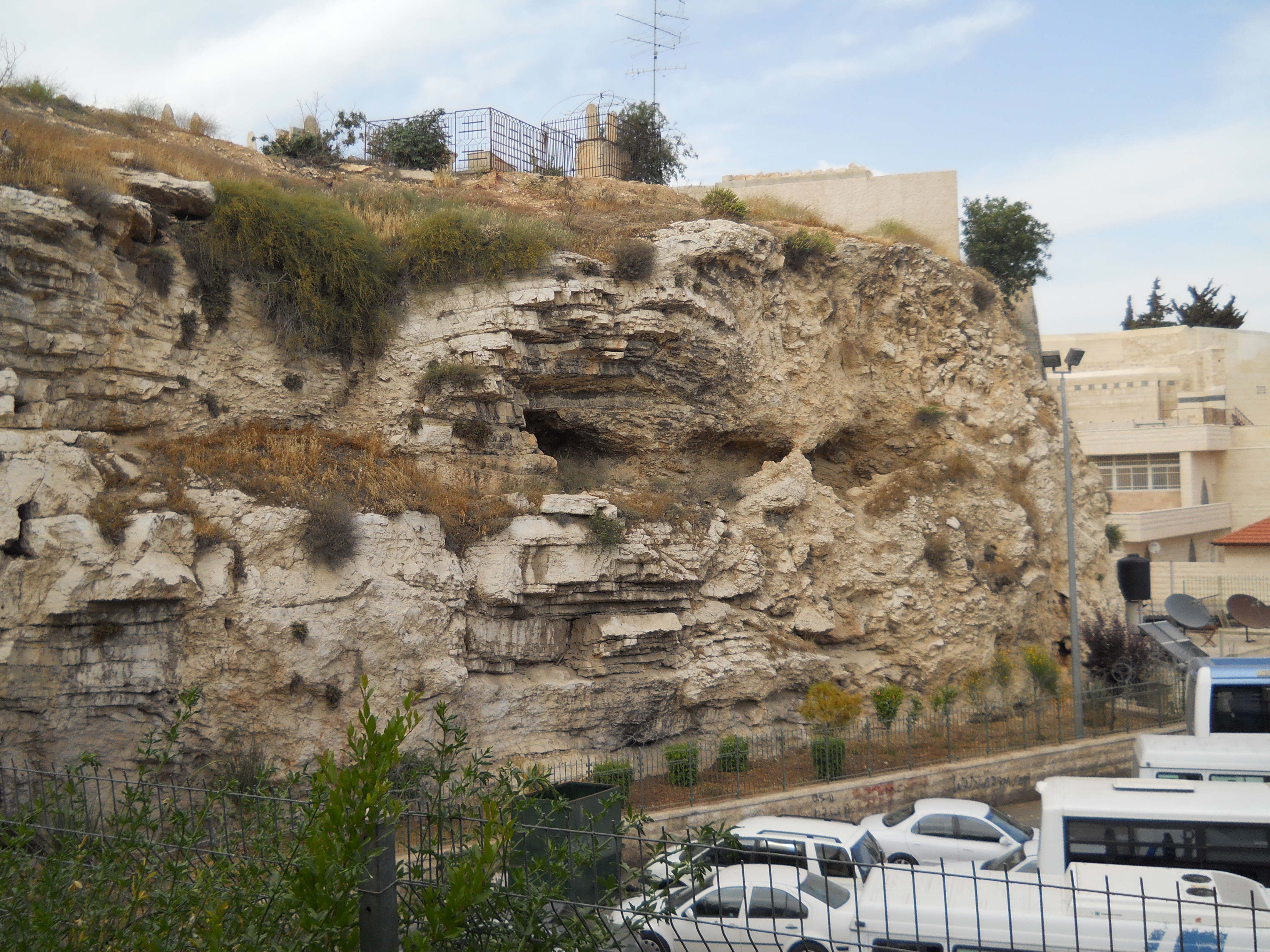 On a visit to Jerusalem in 1883, British general Charles Gordon (1833-1885) looked down from window outside the Old City and was struck by the skull-like features of a cliff near the Damascus Gate. He became convinced that this, rather than the Church of the Holy Sepulcher was the "place of the skull" or Golgotha mentioned in the Christian Bible as the location where Jesus was crucified (Matthew 27:33). Rather than the three crosses on a remote hill commonly depicted in artistic conceptions, such a Roman public execution would have been carried out in a highly-trafficked area like the one below the cliff, which was occupied by a busy Arab bus terminal at the time of our visit. Additionally, an adjacent site included an ancient rock-cut tomb (Matthew 27:59) and later excavations revealed a cistern and wine press that would be typical features of an ancient garden.