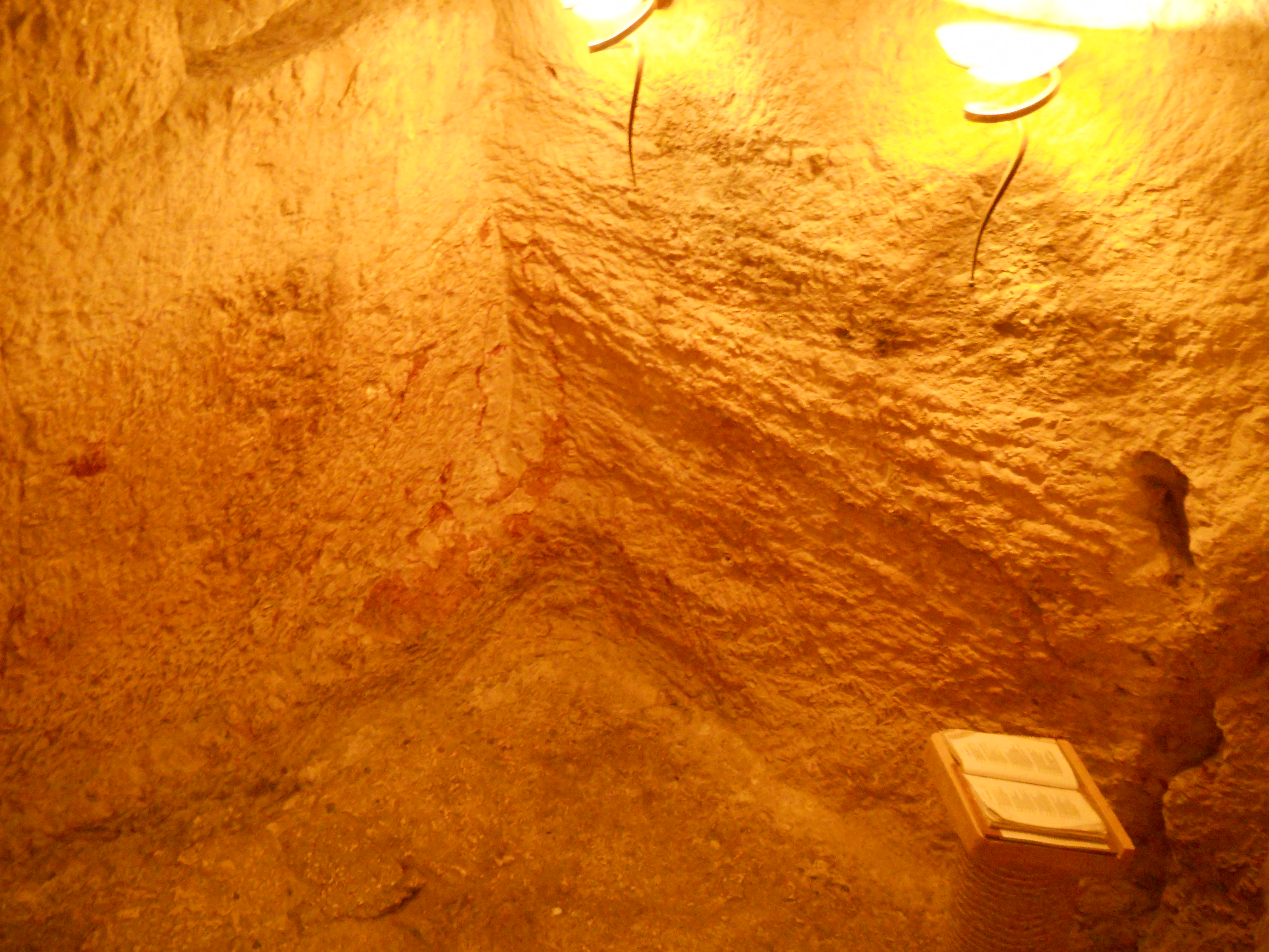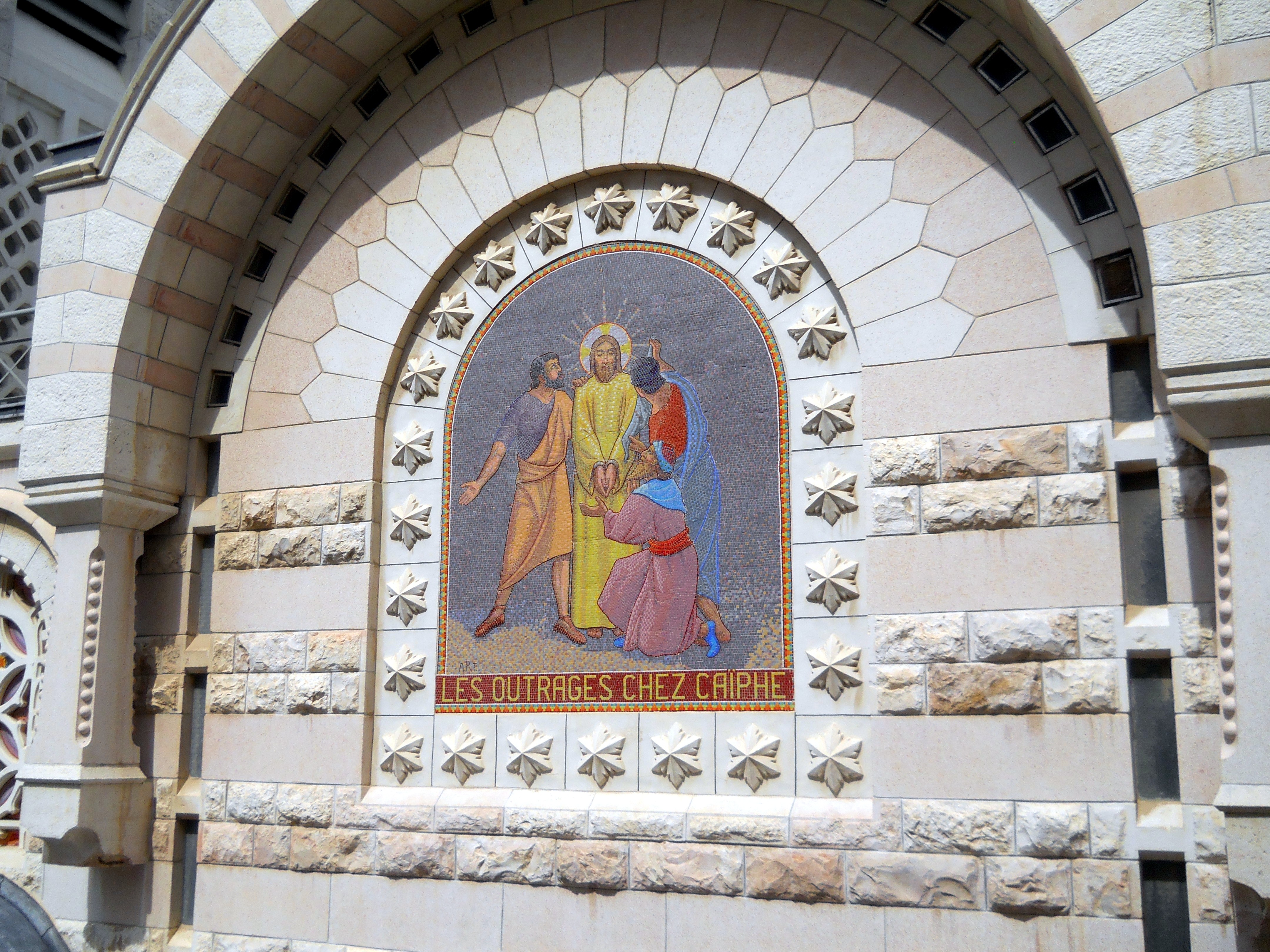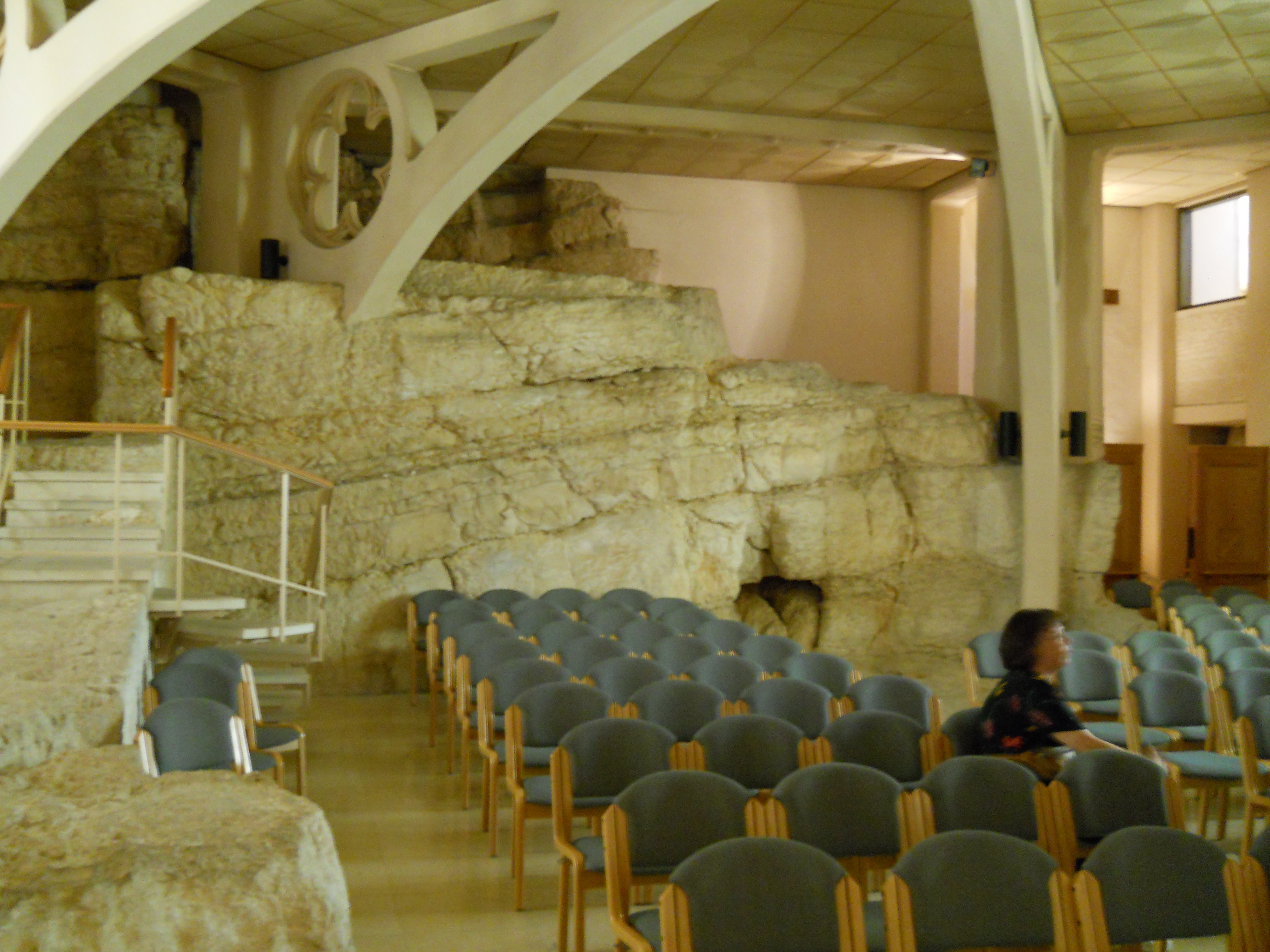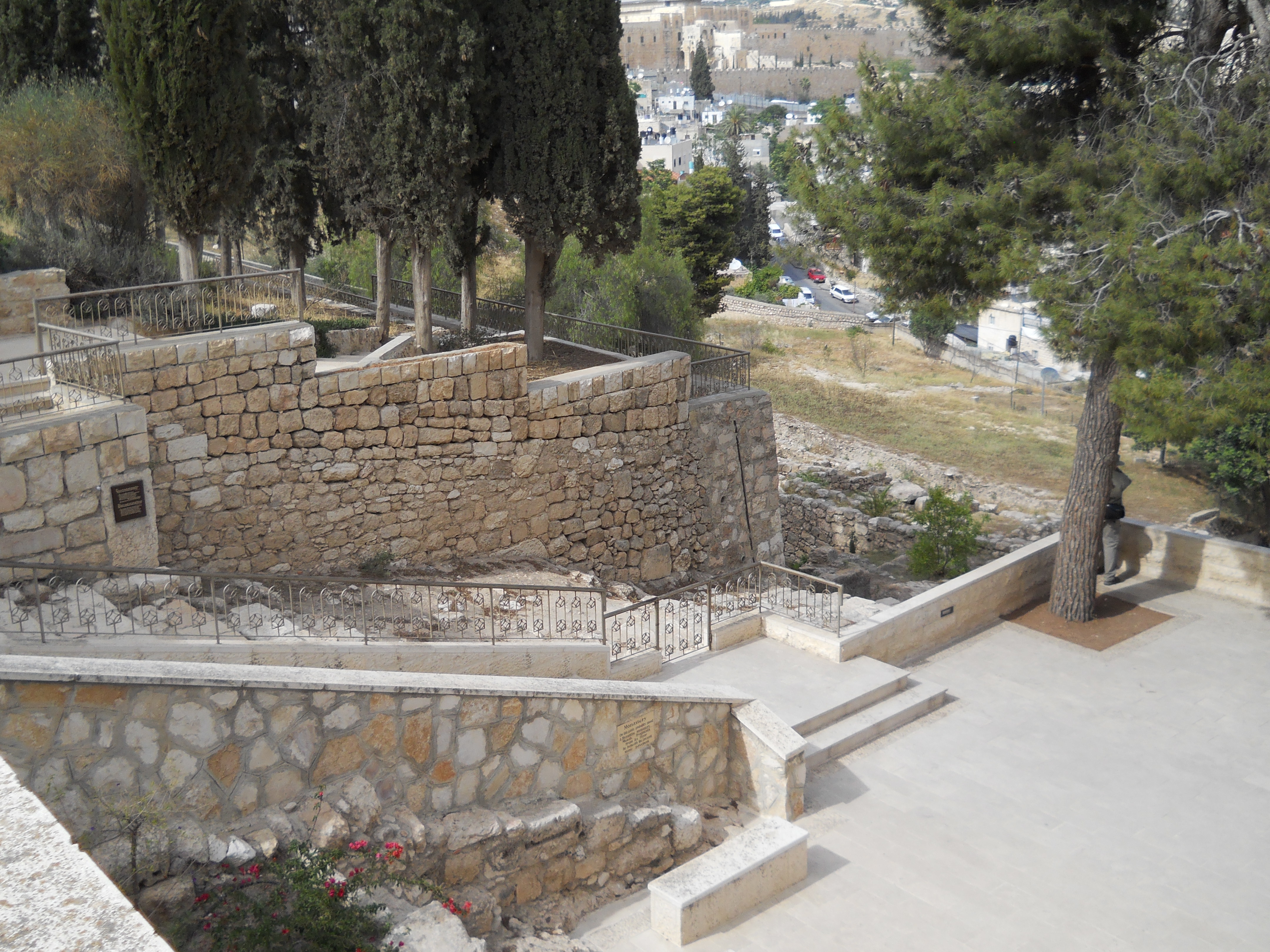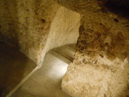 The lower levels of the church incorporate caves from the Byzantine days and a group of earlier crypts that may have been where Jesus was held during his arrest. The area north of the church features ruins of the Byzantine chapel and a staircase down to the Kidron Valley is traditionally cited as the path followed by Jesus down to Gethsemane (Matthew 26, Mark 14).