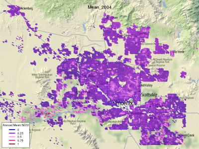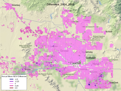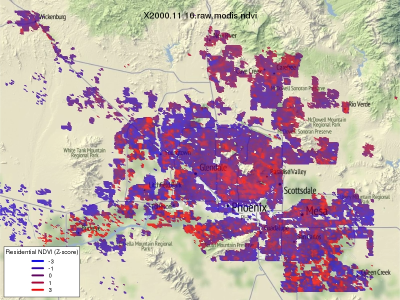 MODIS NDVI displayed as a normalized Z-score and masked to display only area with residential parcels