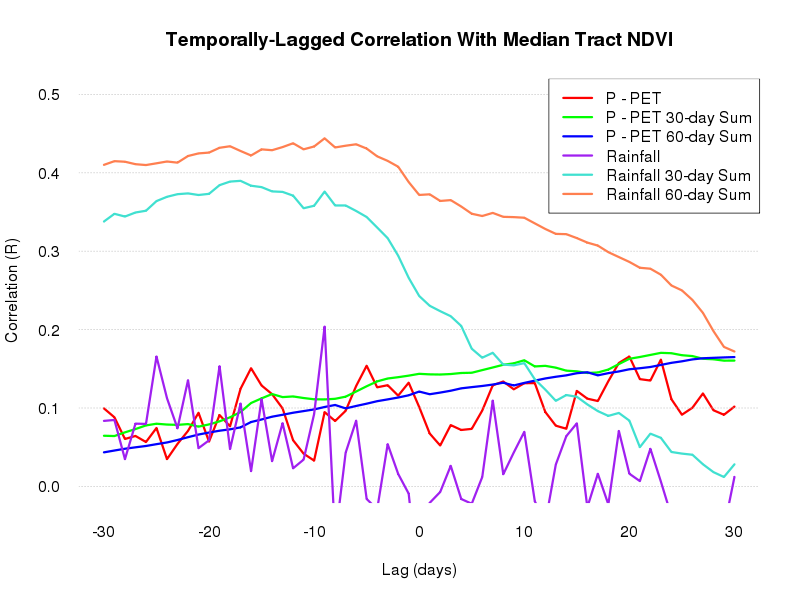 A temporally-lagged running sum of rainfall has the highest correlation with tract NDVI.