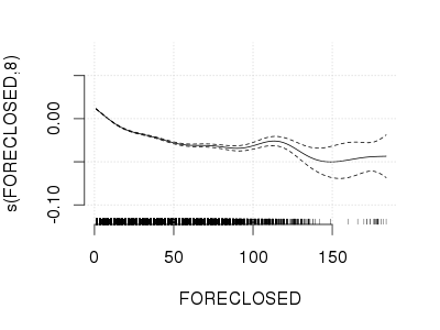 s(SQMLAWN) + s(MEDCONSTYR) + s(FORECLOSED) + s(RAINFALL60) +