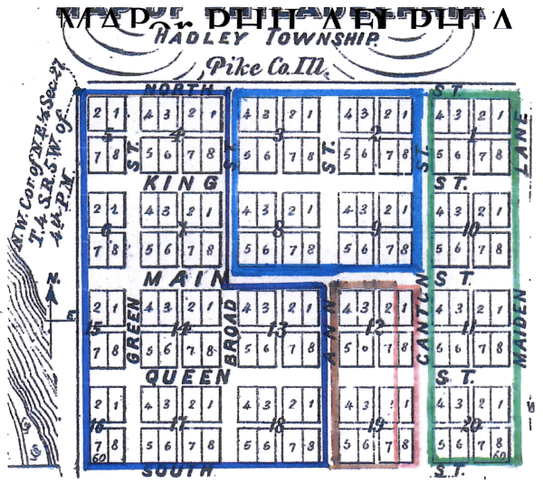 The original town plat consisted of 144 60' x 120' lots arranged in 20 blocks. Each block contained four groups of two lots separated by 15' alleyways, making each block 255' x 255' except for four half-blocks of four lots on the west edge of the town. The town had five east-west streets and five north-south streets. The streets were 60' wide except for Broad Street, which was 80' wide.