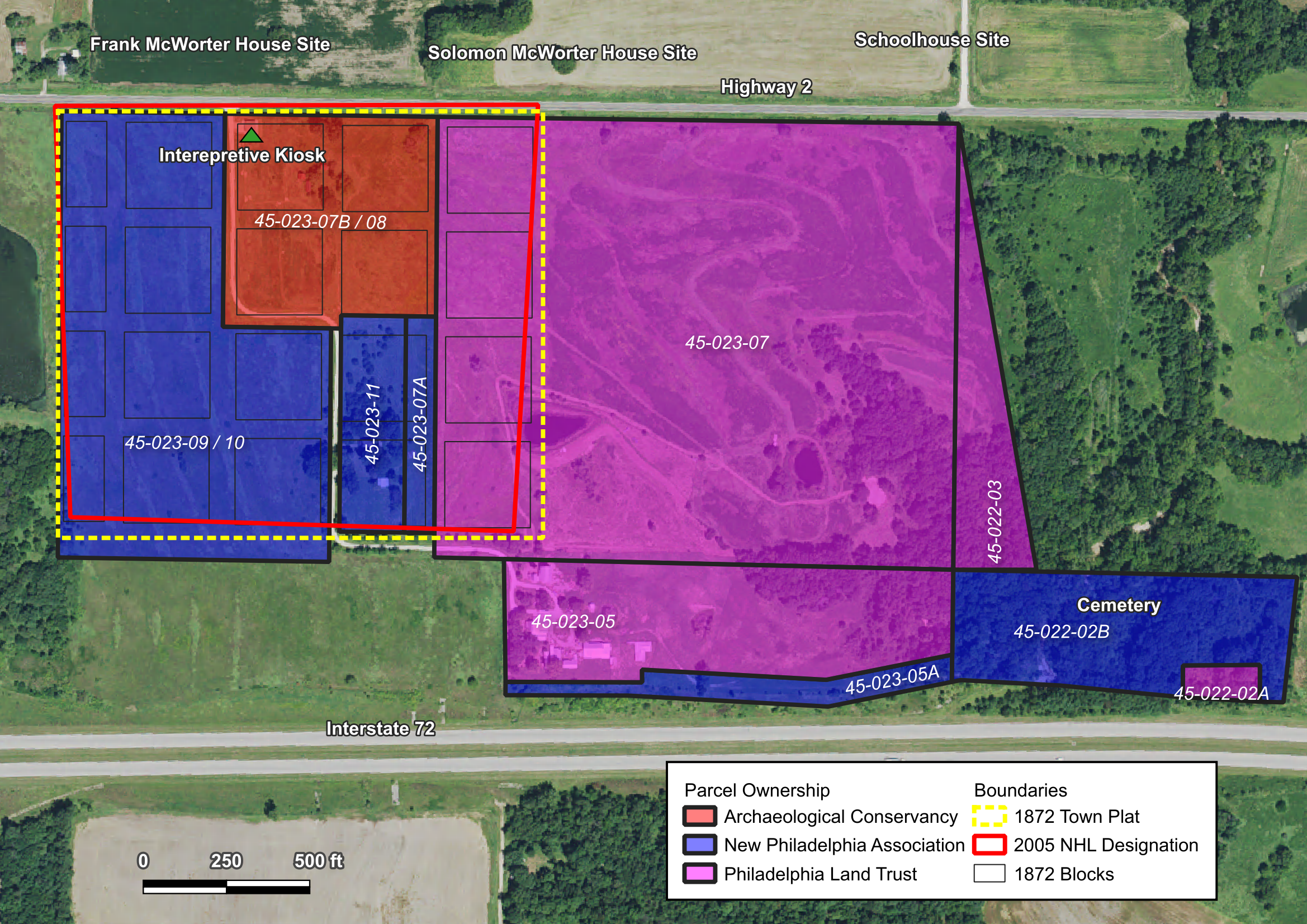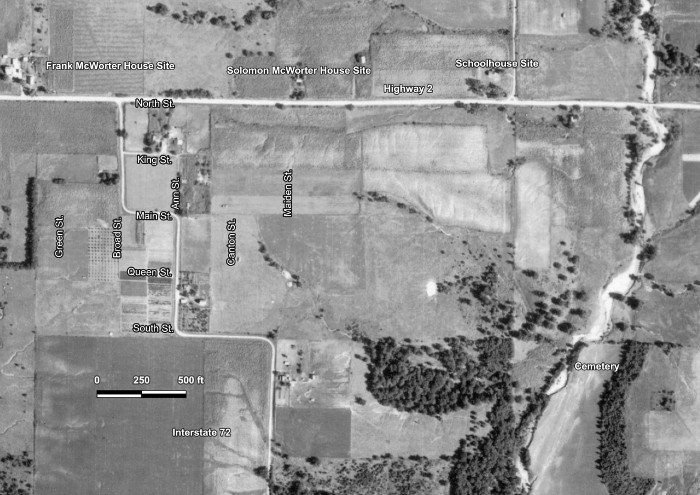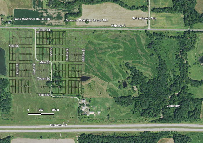 Below is a map showing parcel numbers and ownership. Also included are the boundaries of the town from the georeferenced 1872 plat as well as the town boundary included in the 2005 National Historic Landmark nomination as UTM coordinates.
