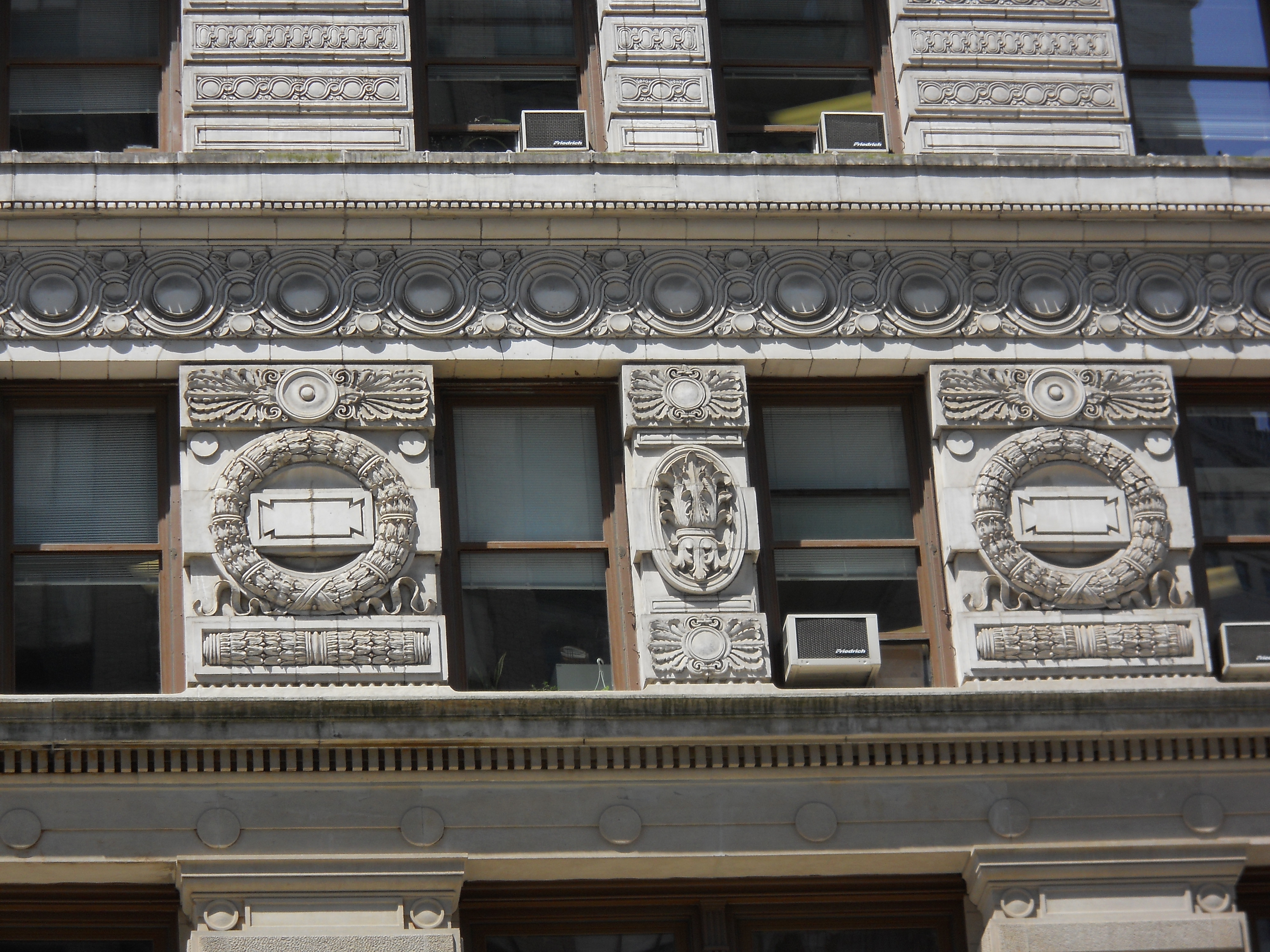 The Flatiron Building was completed in 1902 from a design by Chicago architect Daniel Burnham. The 22-story, 285-foot skyscraper was one of the early buildings to employ a steel frame upon which the exterior walls were hung, a practice developed by George A. Fuller (1851-1900) that is now universal in construction of tall buildings. Burnham's Beaux-Arts limestone and terra-cotta facade is arranged like a classical Greek column into three distinct sections.
