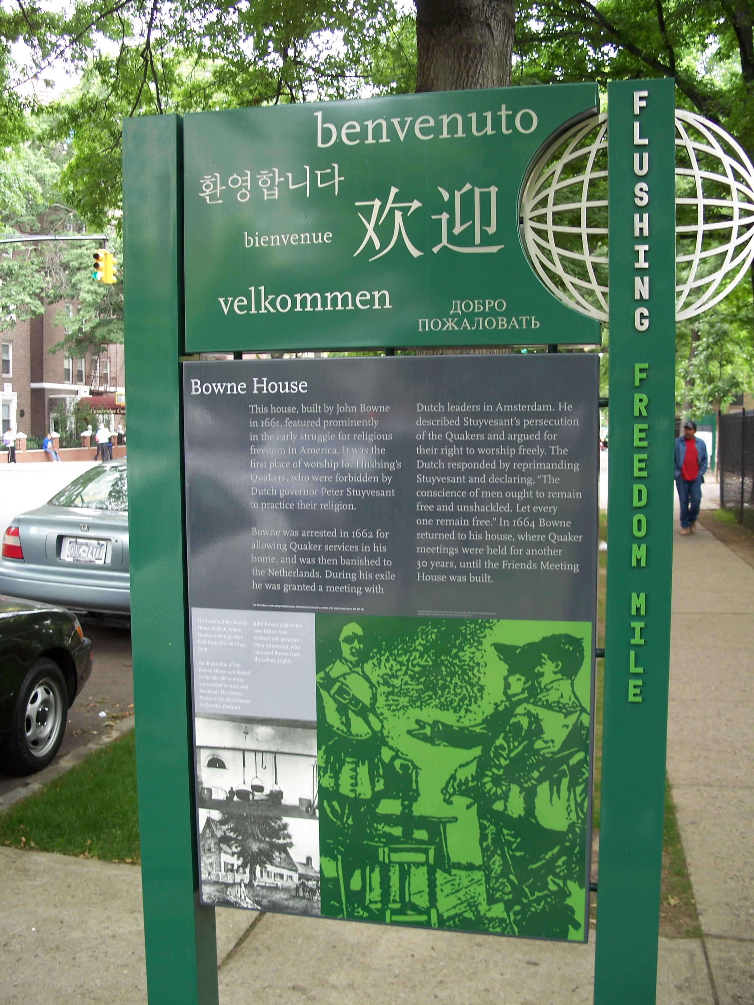 Bowne was arrested in 1662 for allowing Quaker services in his home and was then banished to the Netherlands. During his exile he was granted a meeting with Dutch leaders in Amsterdam. He described Stuyvesant's persecution of the Quakers and argued for their right to worship freely. The Dutch responded by reprimanding Stuyvesant and declaring, "The conscience of men ought to remain free and unshackled. Let every one remain free." In 1664, Bowne returned to this house, where Quaker meeting were held for another 30 years, until the Friends Meeting House (just around the corner) was built.