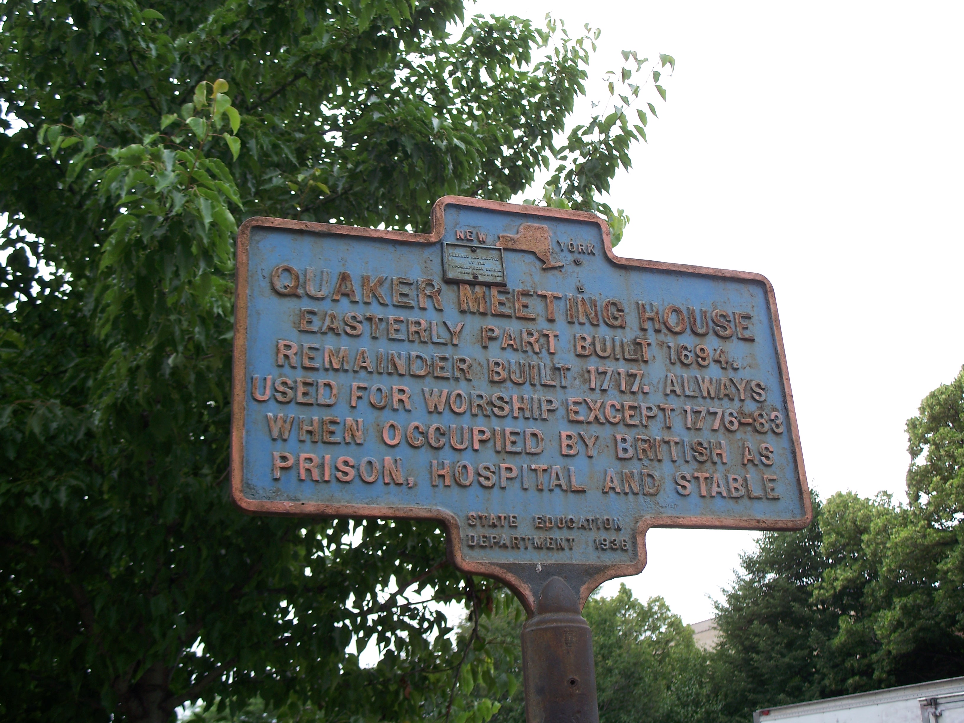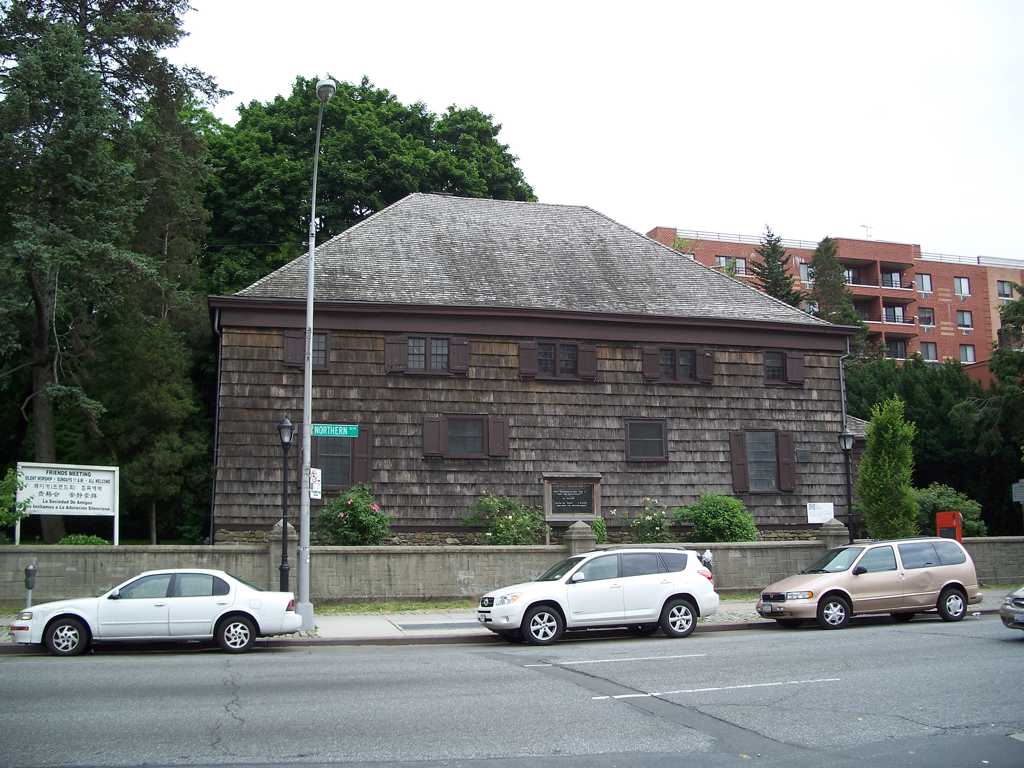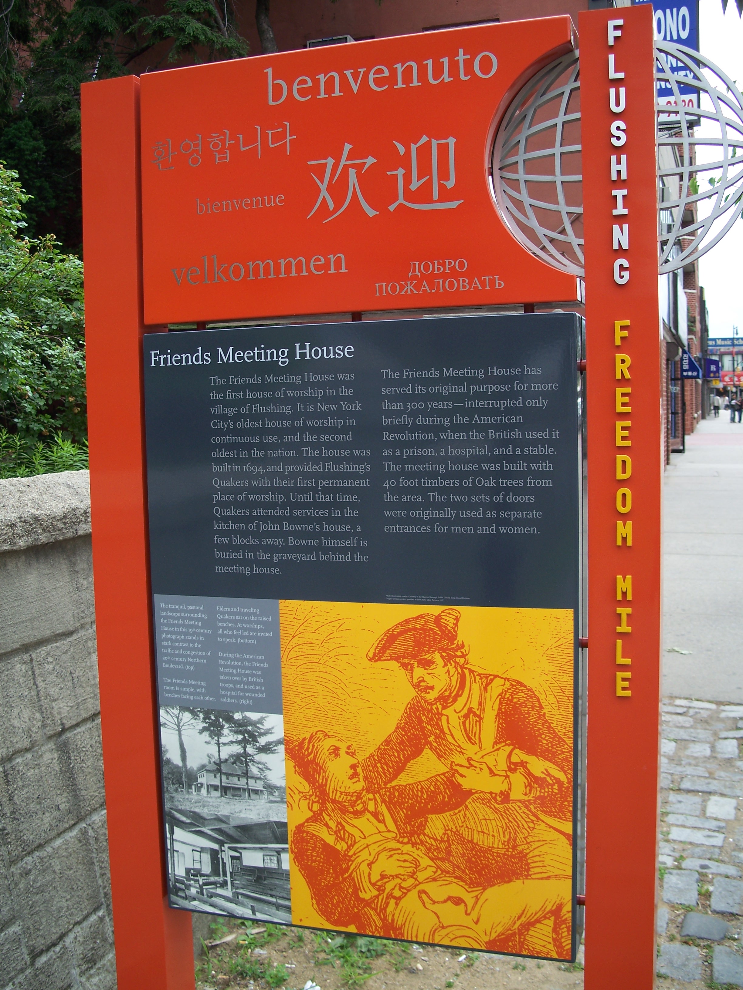 This church was built in 1694 and is the city's oldest house of worship in continuous use and the second oldest in the nation. The meeting house was built with 40-foot timbers of Oak trees from the area and features two sets of doors that were originally used as separate entrances for men and women. Until the construction of this building, the Quakers met in the kitchen of John Bowne (around the corner) and Bowne is buried in a graveyard behind the meeting house. The only interruption to its original purpose was during the American Revolution, when the British used it as a prison, hospital and stable.