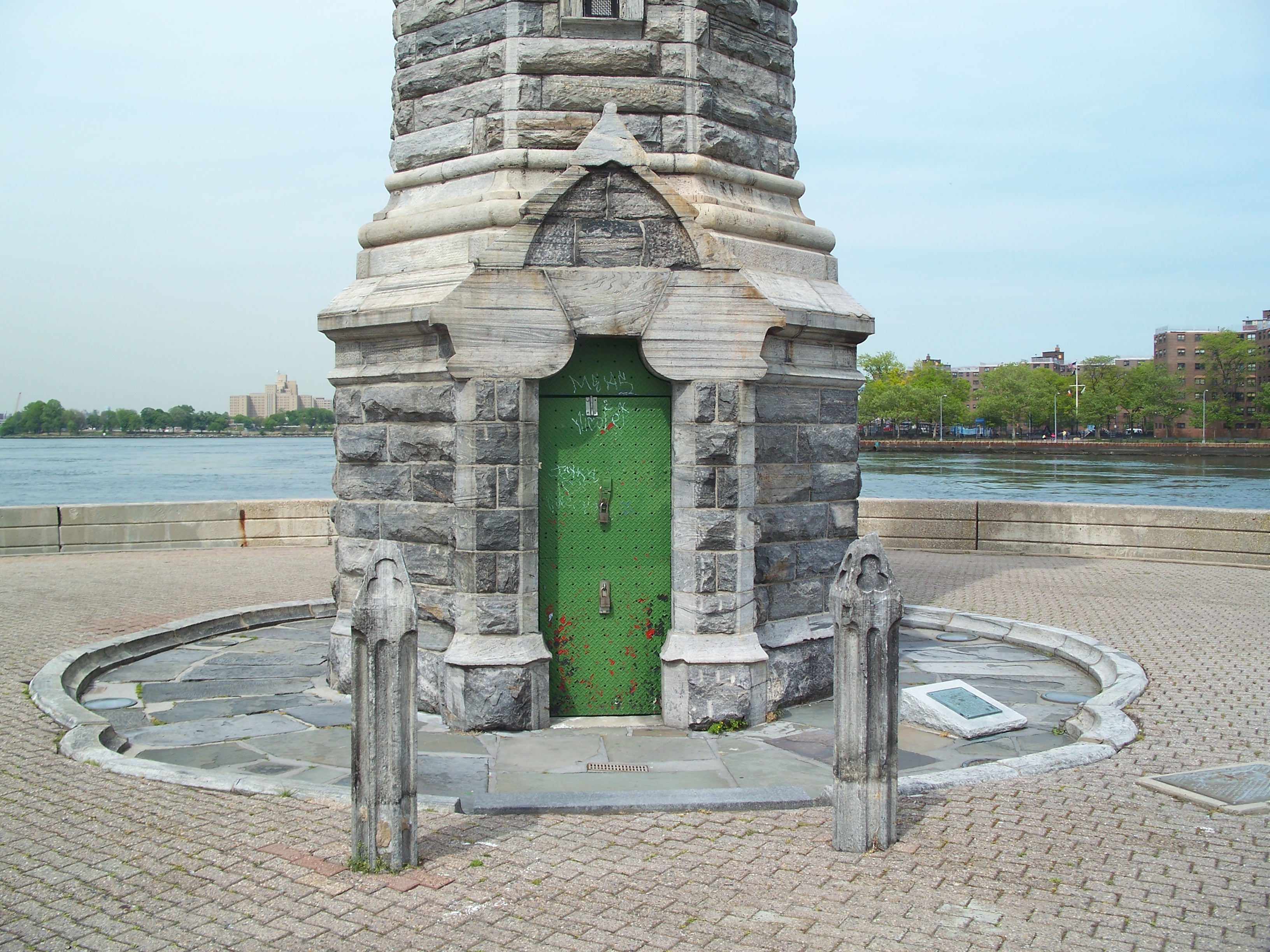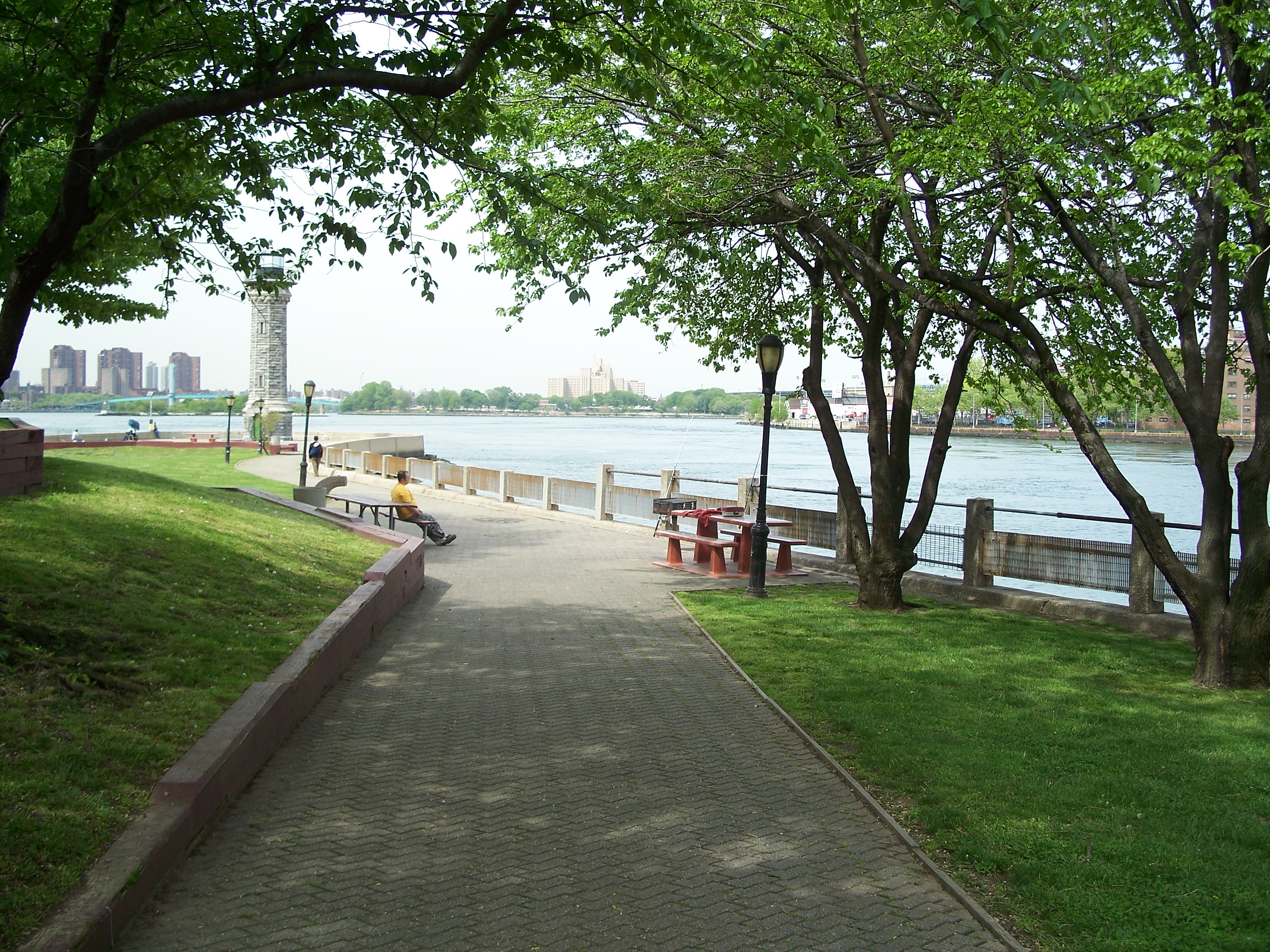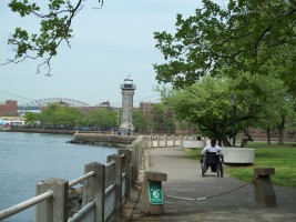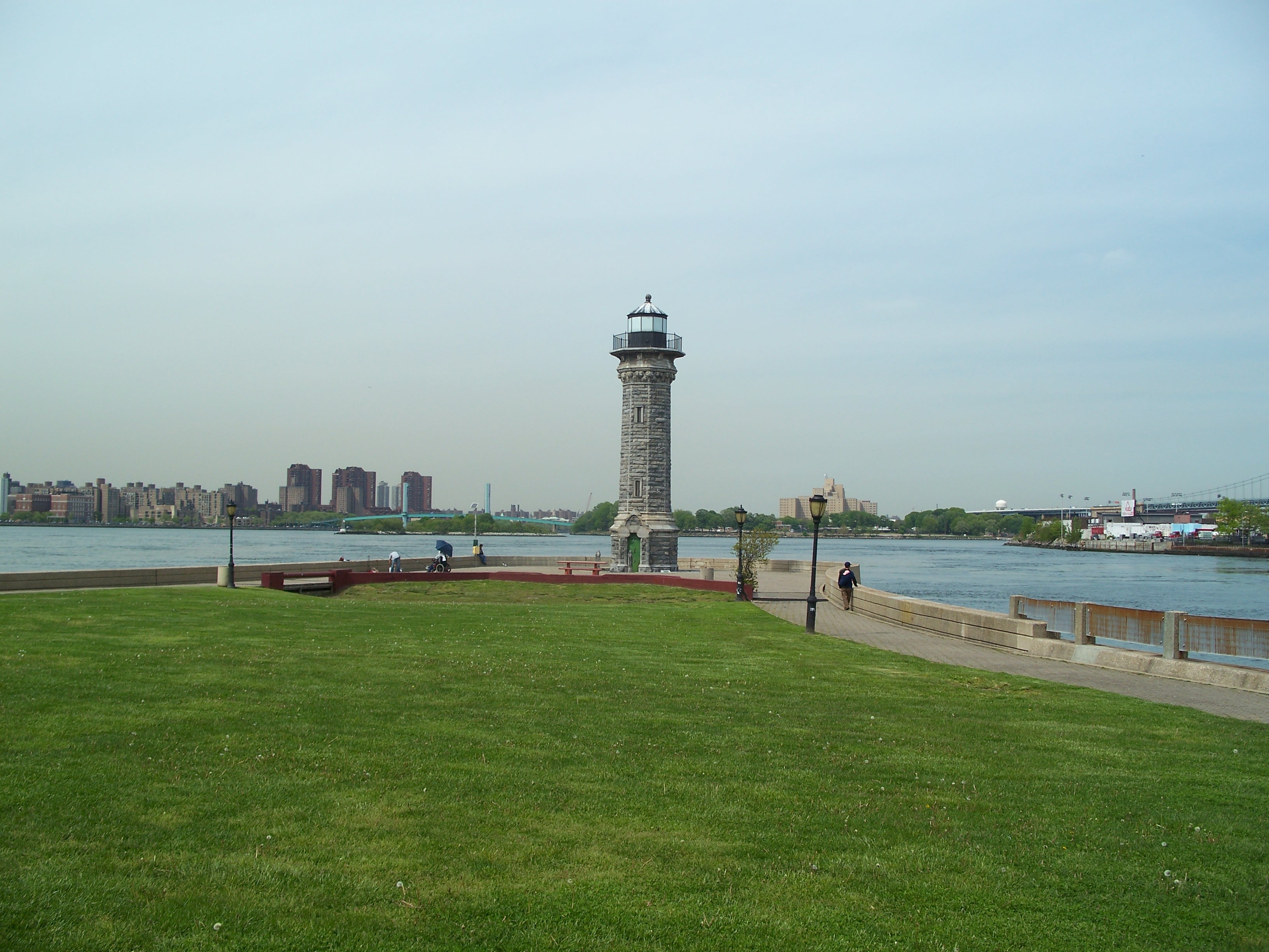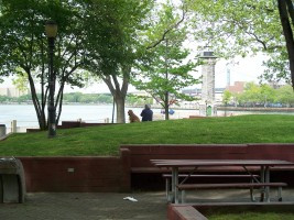 Lighthouse Parks sits on the north tip of Roosevelt Island, just north of Bird S. Coler Hospital and is named after a 50-foot-tall, gray gneiss, Gothic-style lighthouse that was built on the tip of the island in 1872. It was not an official Coast Guard lighthouse, but was commissioned by the city to steer river traffic navigating the trechers waters of Hell Gate away from the island. The lighthouse was designed by James Renwick, Jr., who is also responsible for the Smallpox Hospital on the south end of the island and St. Patrick's Cathedral in Manhattan. The Lighthouse was decommissioned in the 1940s, designated a city landmark in 1975, and partially restored in 1976, with an anonymous grant permitting completion of the restoration in 1998. (reference)