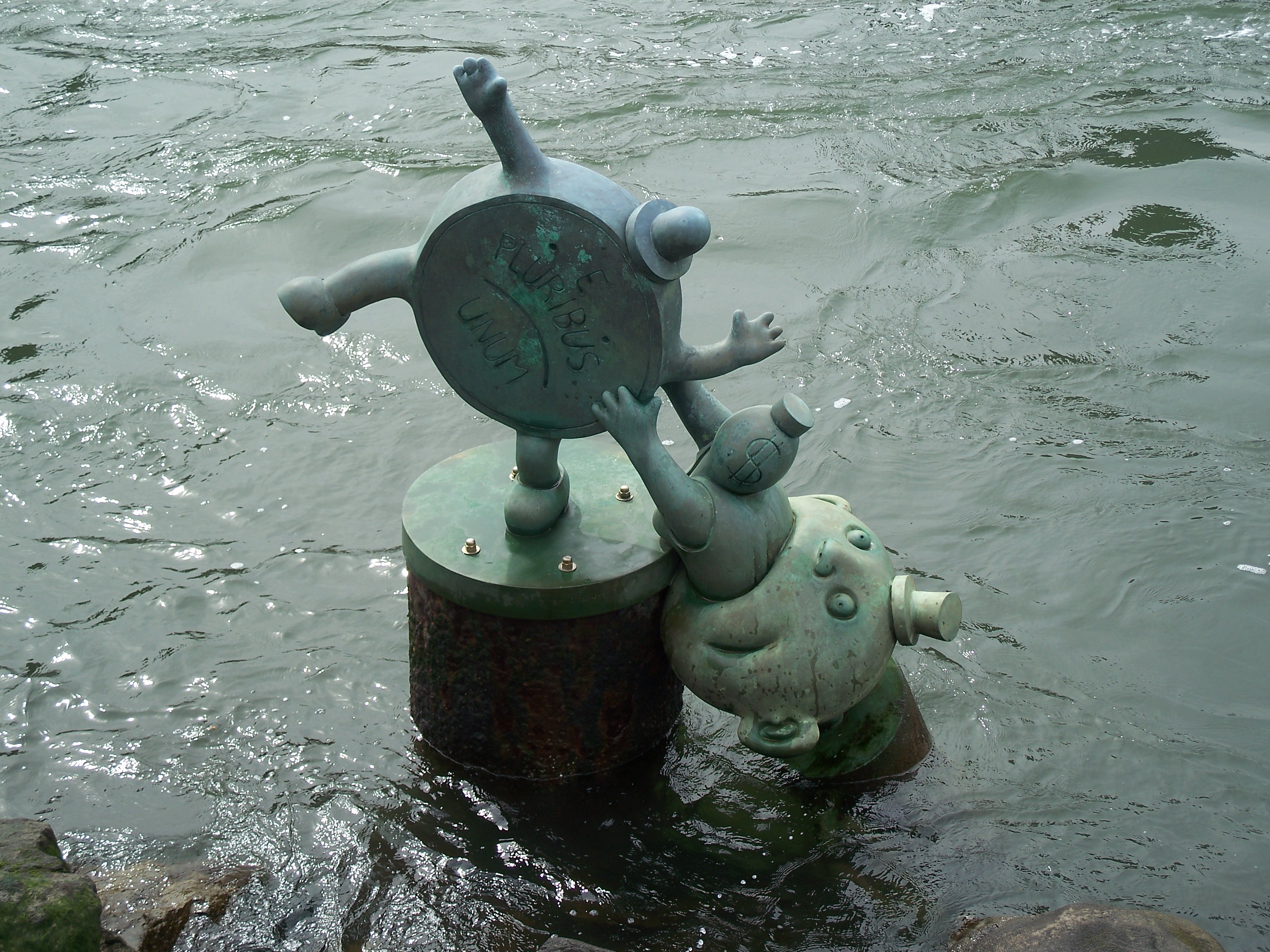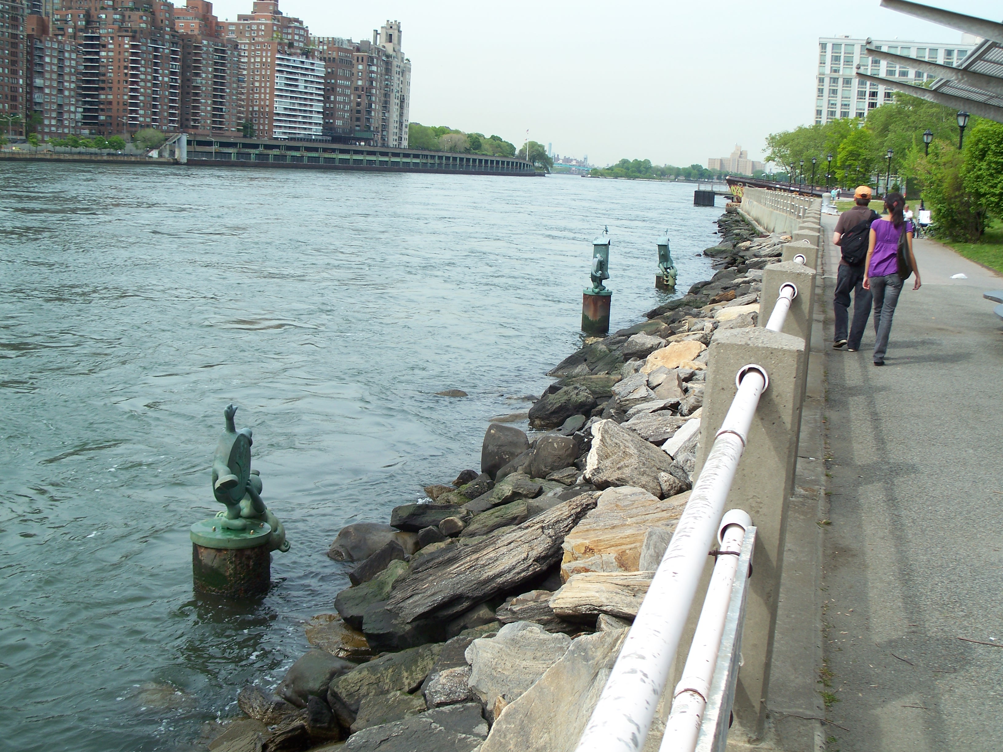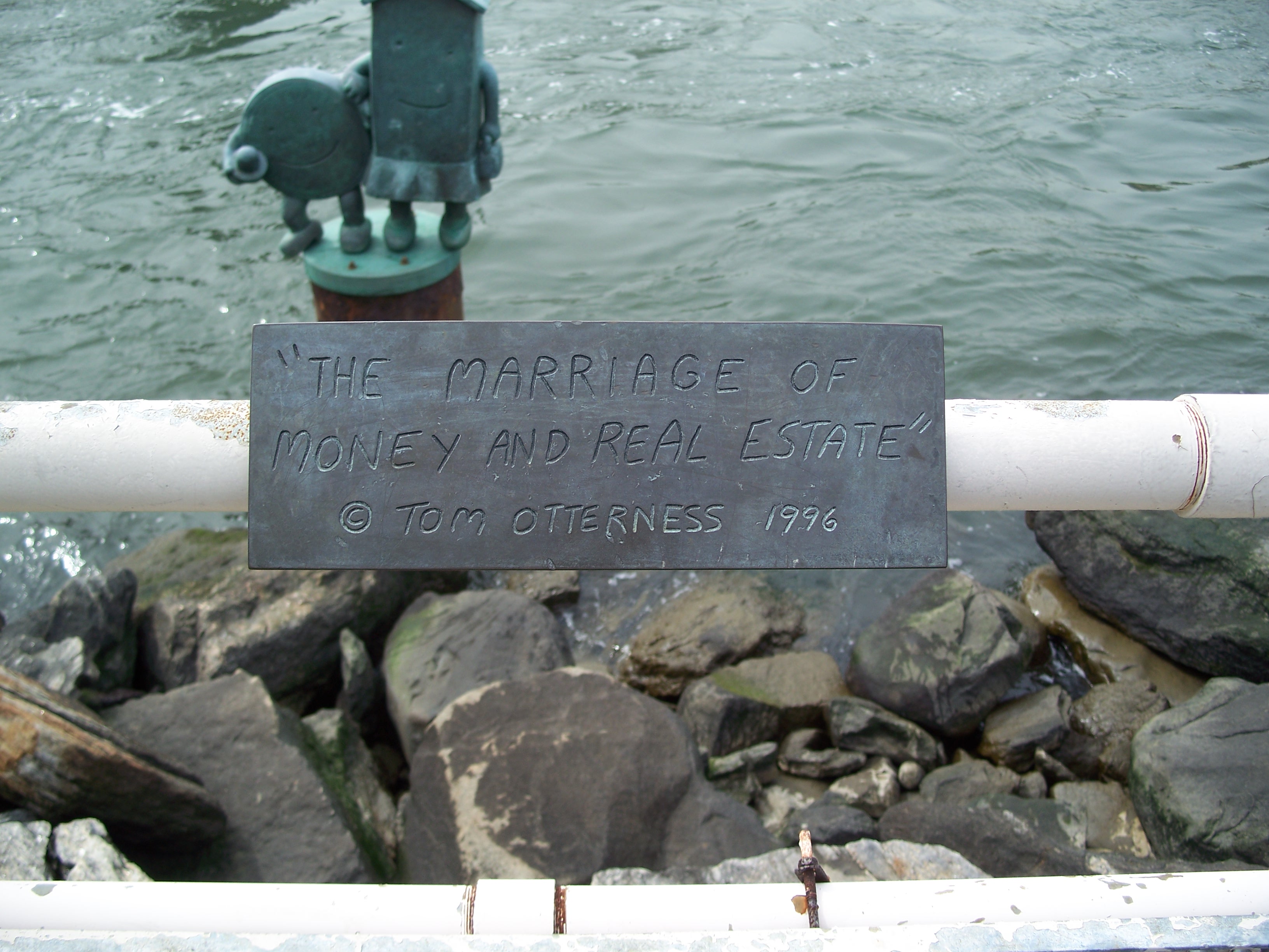 Tom Otterness (b. 1952) is a well-known sculptor of public art in NYC, distinguished by a cartoonish and cheerful style often consisting of pudgy blobs and depicting the struggles of the "little guy" in a wondrous and difficult city. The Marriage of Money and Real Estate on the northwest riverfront is especially clever with characters that appear to be being devoured by symbolic sea creatures depending on the level of the tide.