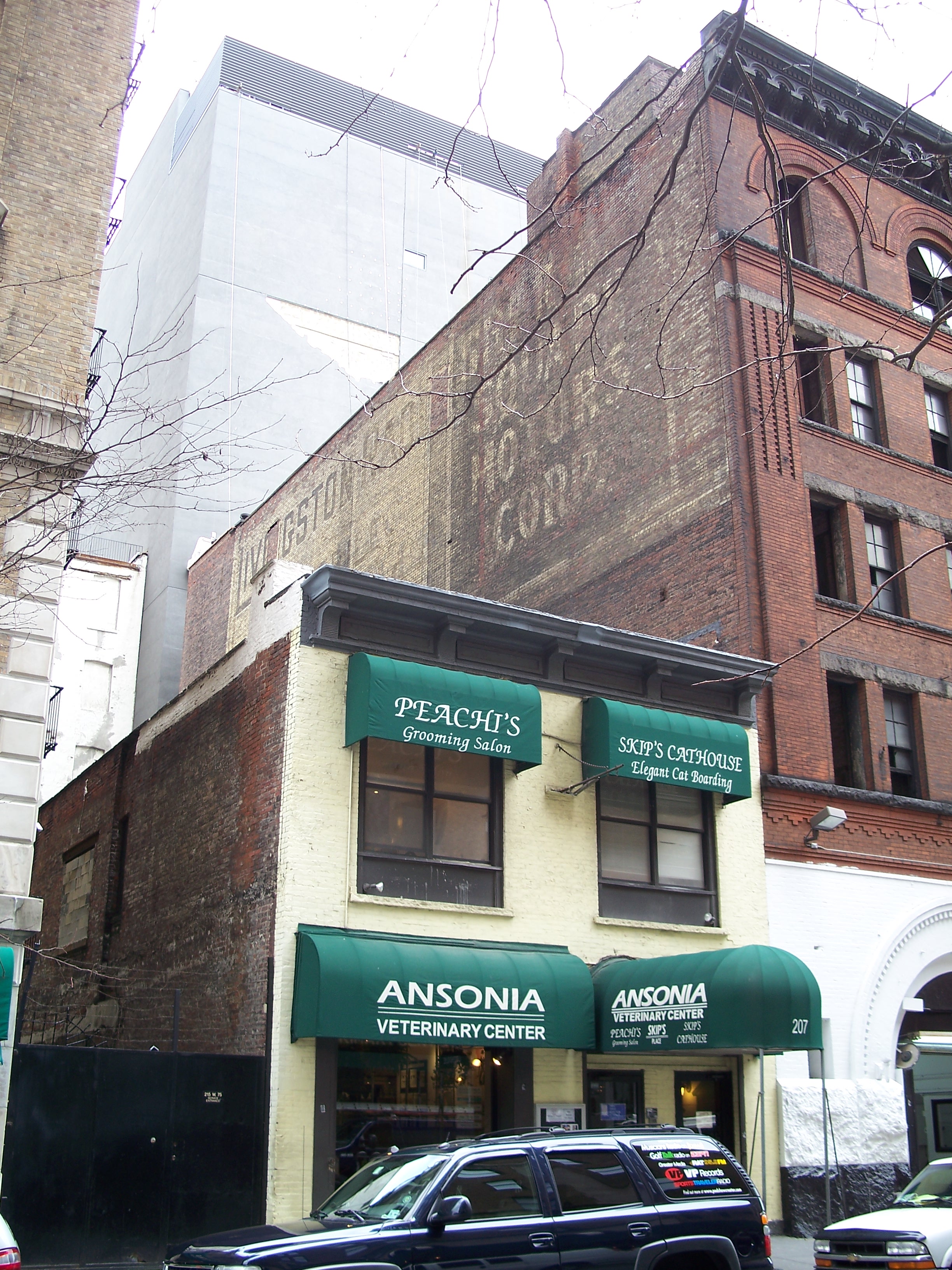 This attractive little row house just to the west of the NY Cab Company Building was listed in the 1907 City Directory as a stable business run by Sarah Abbott. It seems much too small to have housed many animals and may simply have been an office or veterinary facility for the stables next door. Indicative of the changes in the neighborhood at the end of the 20th century, it went from being offices for a veterinarian and a plumber to a high-end tanning salon.