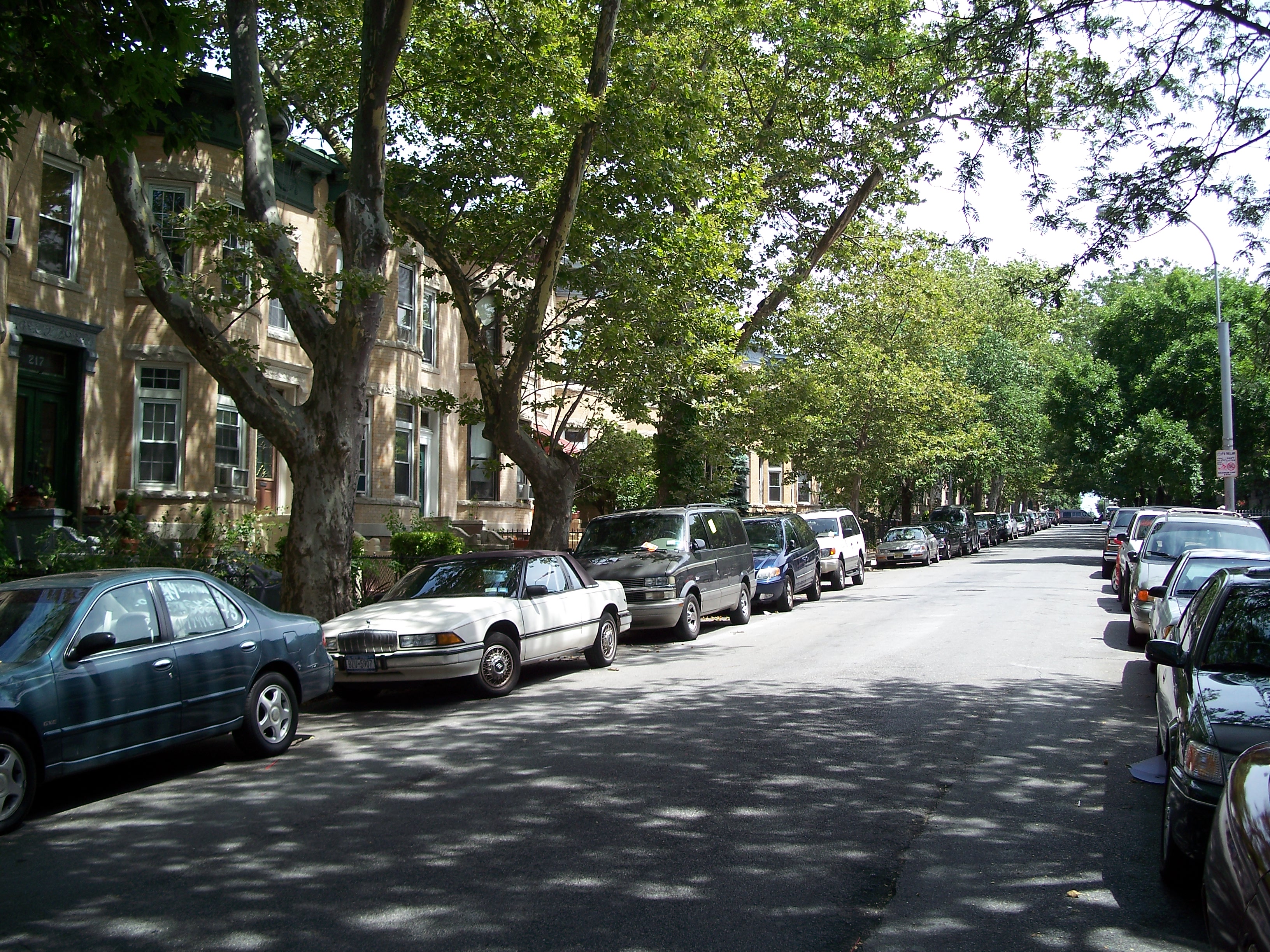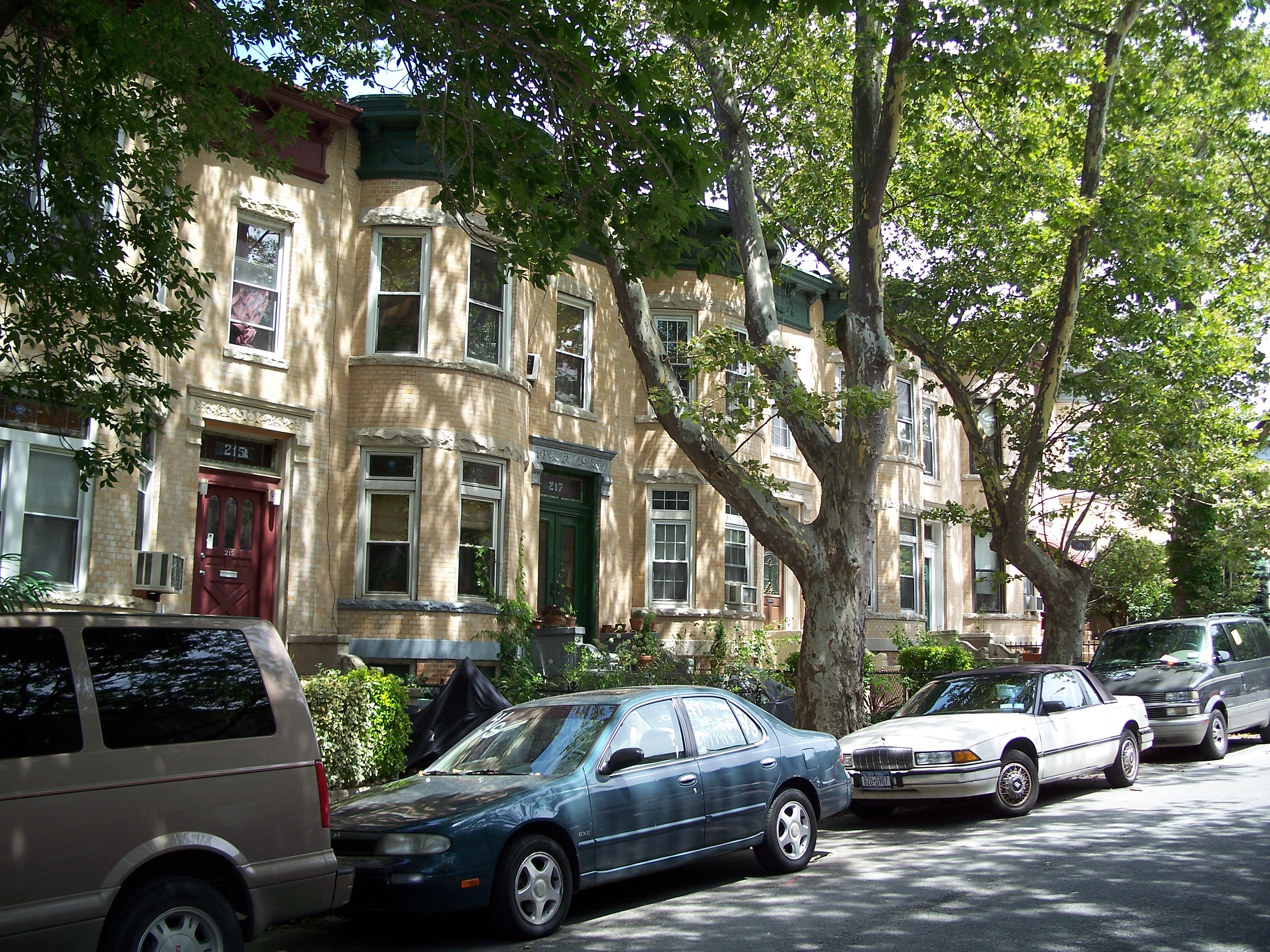 Tree-lined row houses on 61st Street just east of the Brooklyn Army Terminal