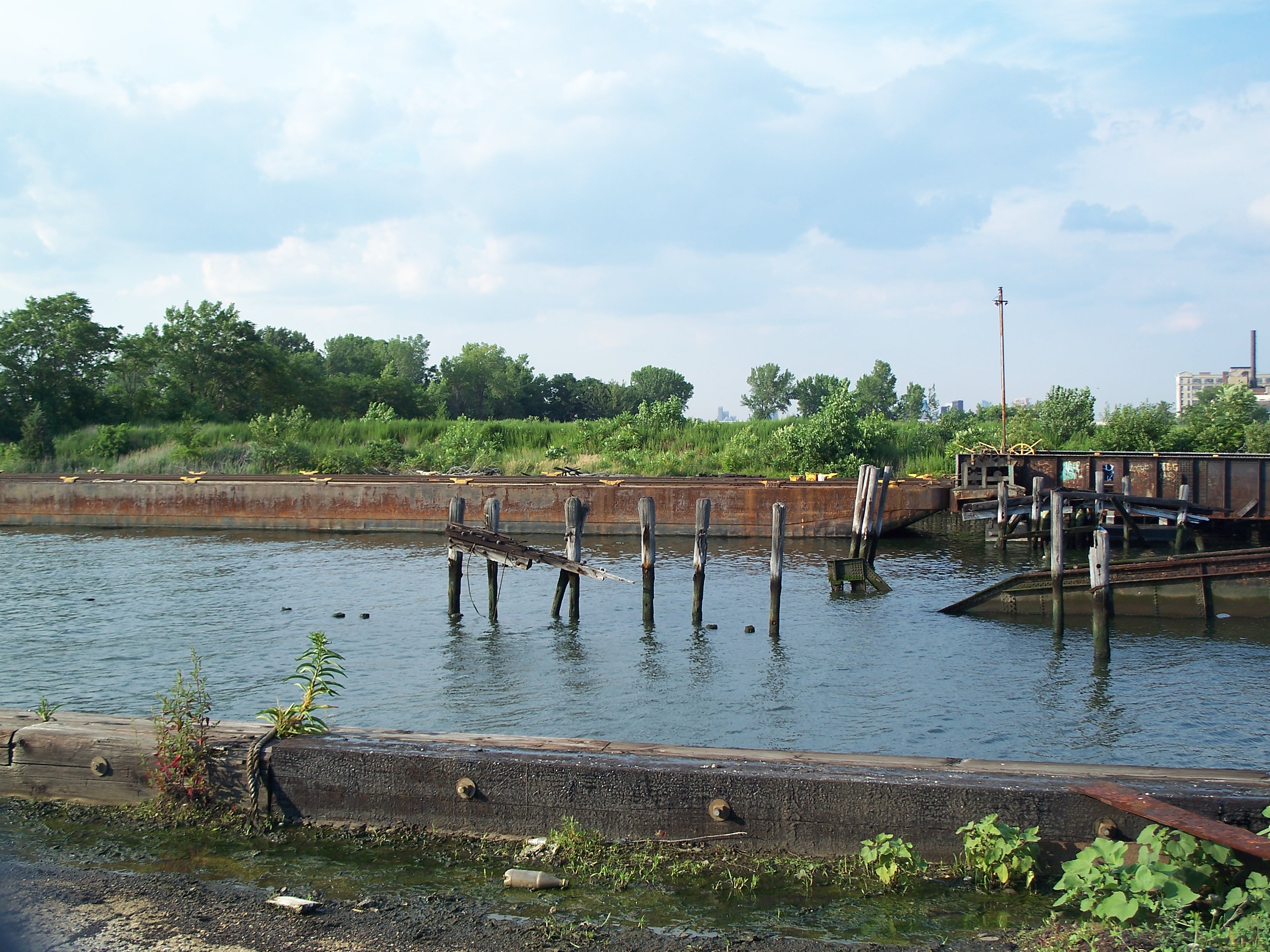 Car float docked at apron #2. Overgrown, abandoned Pier 1 in the background
