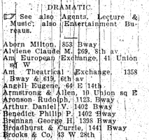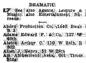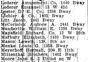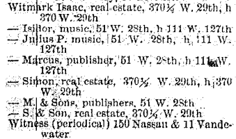 However, even as the Witmarks were moving uptown, other musical businesses were moving into the block. Although the 1902 NYC Business Directory does not have a separate category for "Music Publishers", there are a number of "Dramatic Agents" and "Music Printers" on the block: