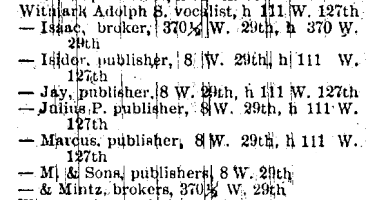 The row houses on the block themselves date from the 1850s through the 1870s. The beginning of music publishing on this block is commonly dated as 1893, when music publisher M. Witmark & Sons moved in to 49 West 28th Street. The 1894 NYC City Directory lists his business at 51 West 28th Street, but by 1898, Witmark had moved one block uptown to 8 West 29th Street. By 1905 Witmark had moved to 144 West 37th, where they seem to have remained for quite awhile. In 1925, the Arthur W. Tams Music Library and the Witmark Music Library merged to create Tams-Witmark, a organization that became very well known in amateur theatre circles as the licensing agency for many classic American musical theatre works. In 1929, Witmark was bought out by Warner Brothers following the death of Julius Witmark.