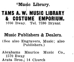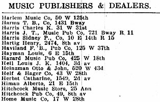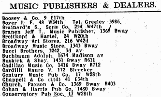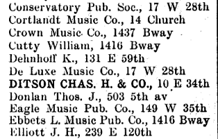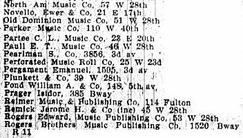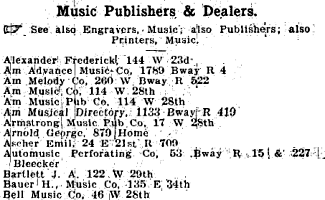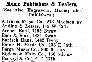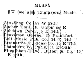 By 1905 there was a separate NYC Business Directory category for Music Publishers, perhaps indicating the increasing sophistication of the business. Of the 152 companies listed, 24 were on West 28th Street.