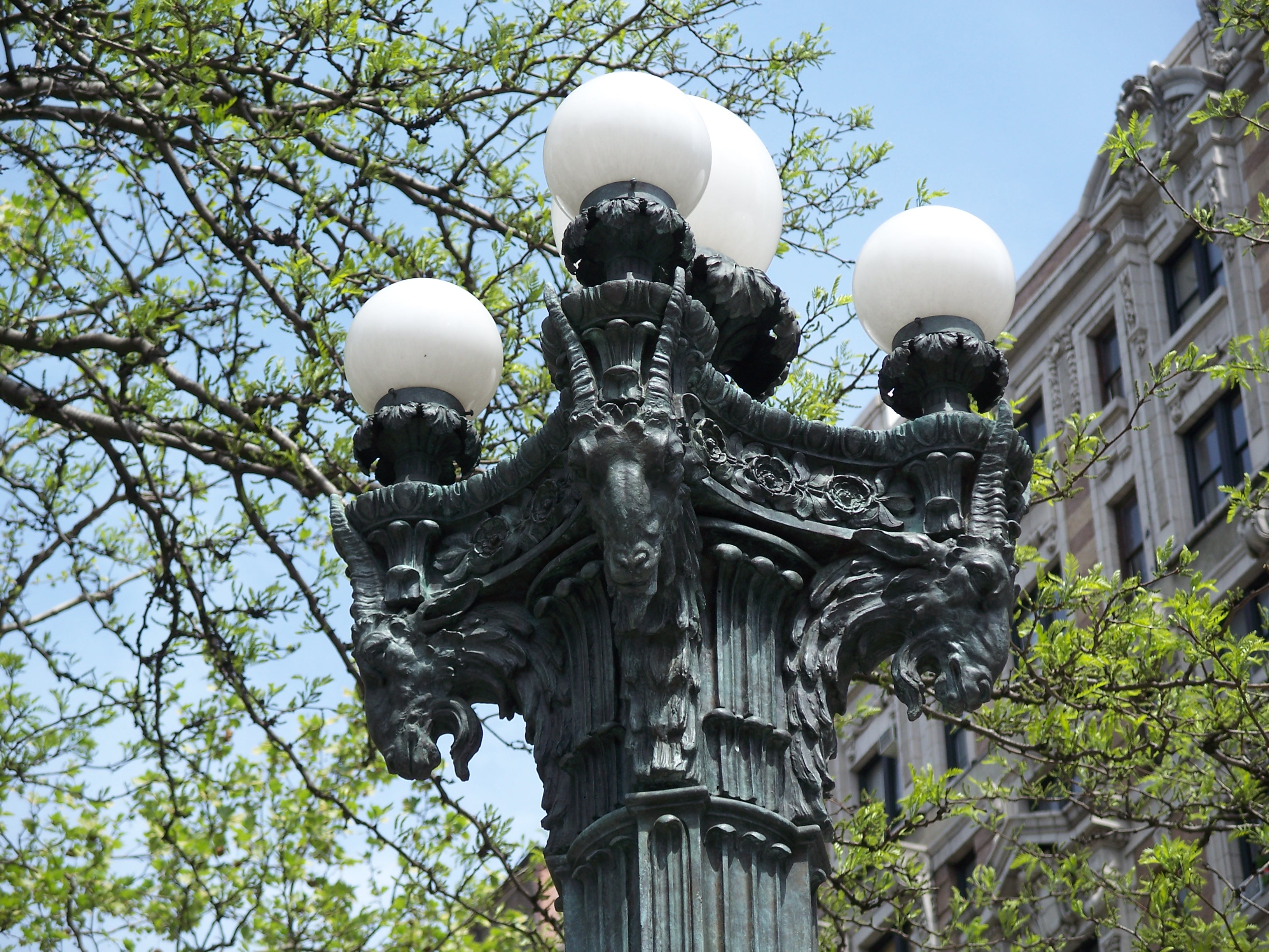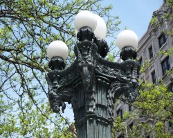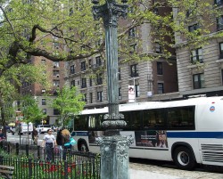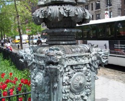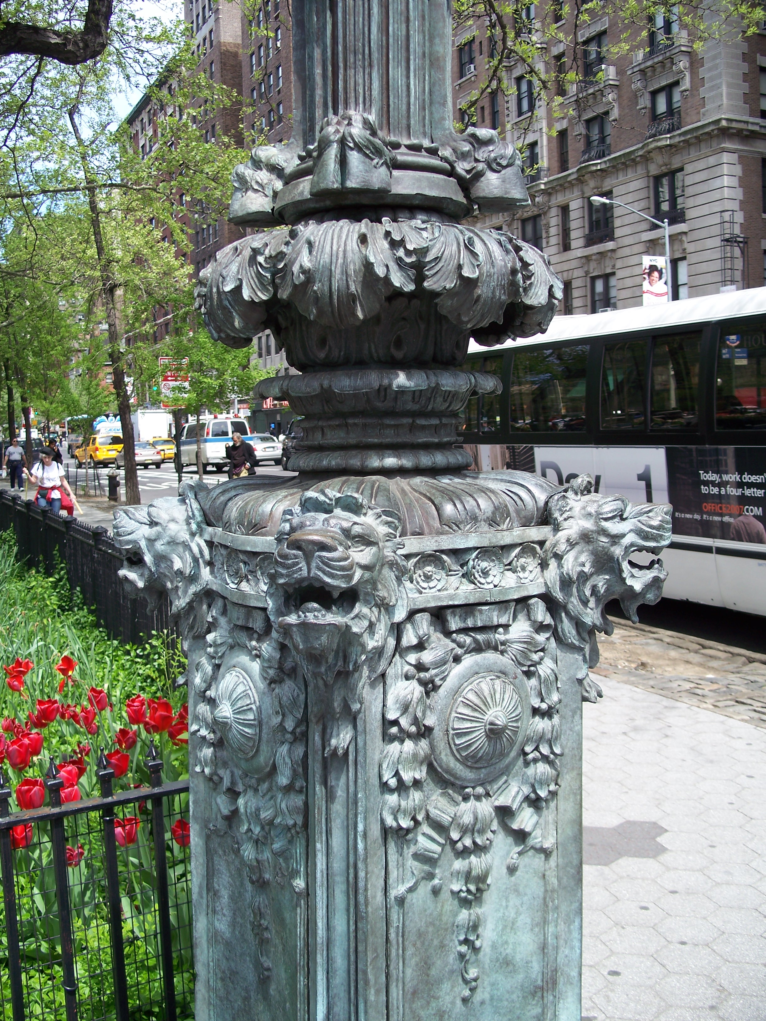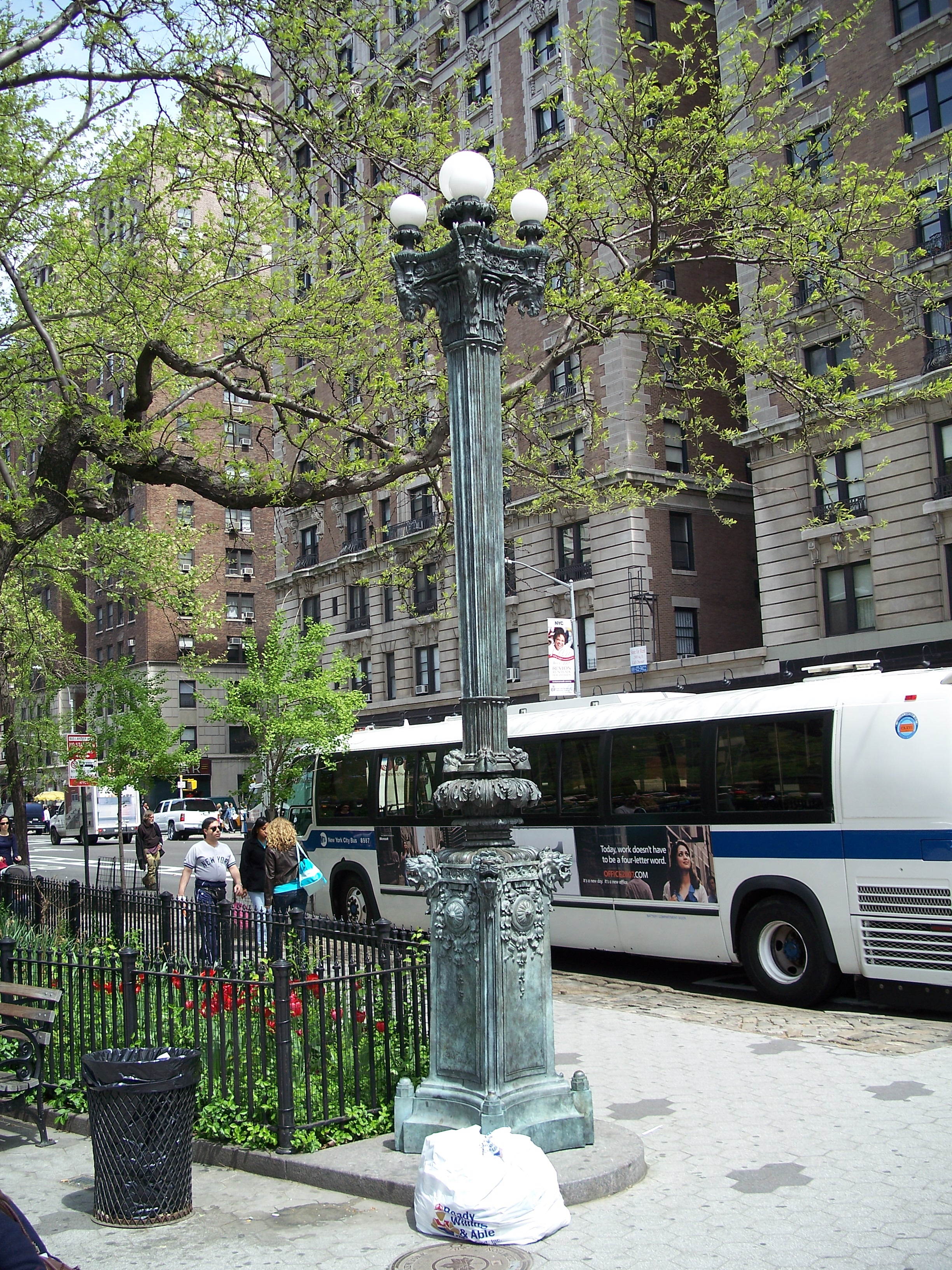 The lamppost near the corner of Amsterdam and 72nd St. is a luminaire, an ornate 5-lamp structure that was one of a pair built between 1913 and 1935 that originally flanked the staircase to the Fireman's Memorial on Riverside Drive at 100th Street. The poles were vandalized in the 1970s and the survivor was placed in storage. The lamp was restored and placed here in the fall of 2004. (reference)