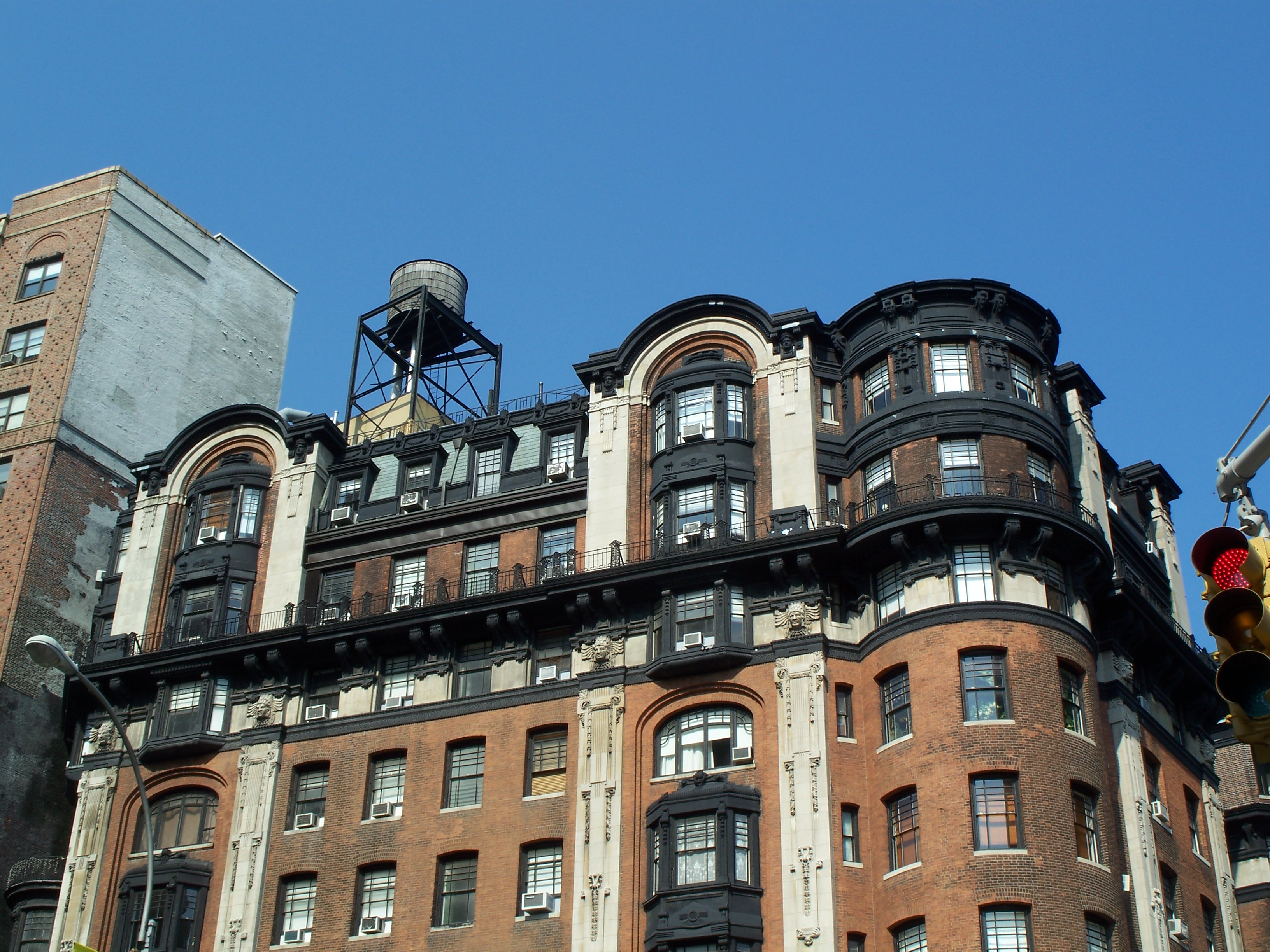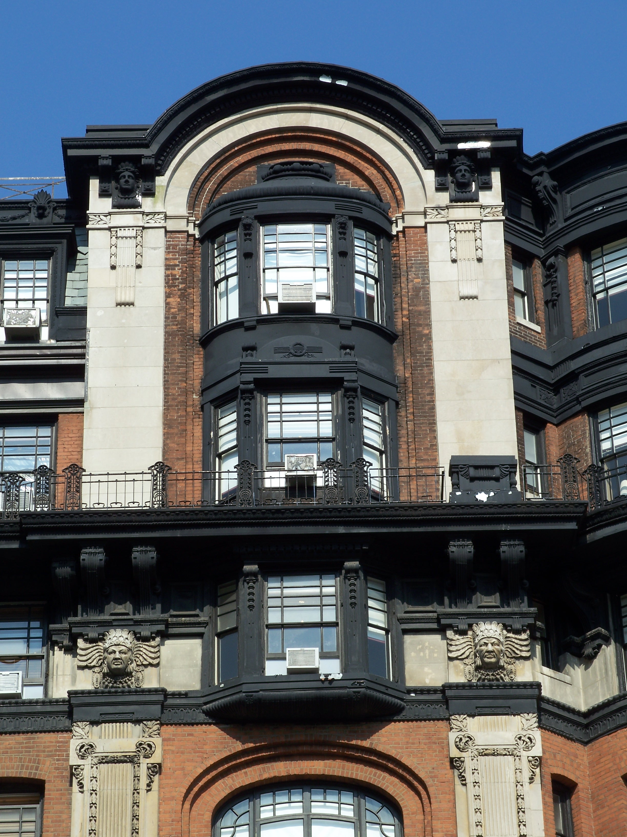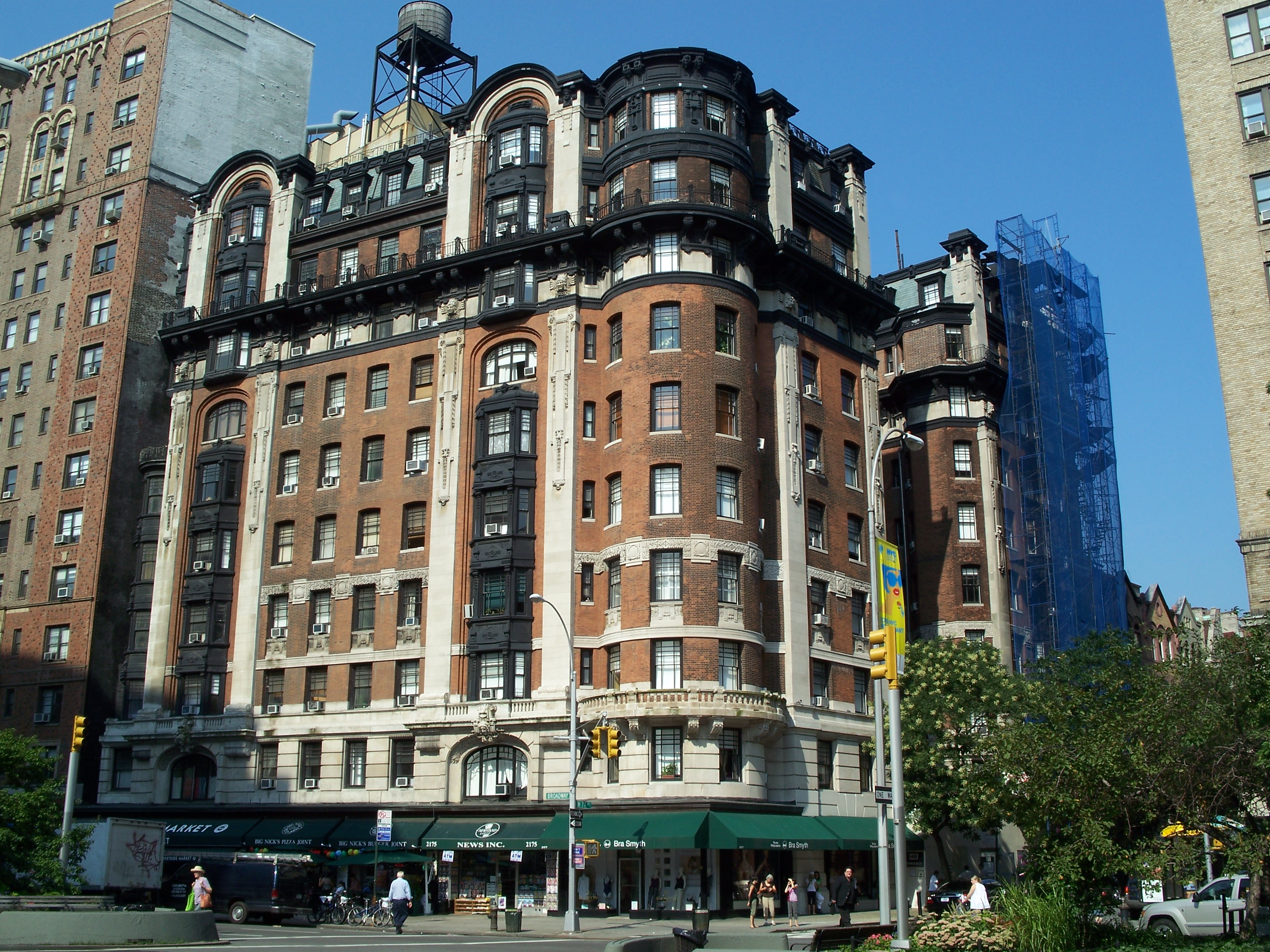 The Hotel Bellclaire is a 10-story, 240-room hotel that opened in 1903. The design by Emery Roth combines Art Nouveau and Secessionist style, with distinctive ornamental pilasters and bay windows. Like many such buildings on the Upper West Side, it went through a period of decline and service as a Single Room Occupancy hotel (SRO) before being returned to more conventional (and lucrative) tourist trade in the late 1990s. (reference)