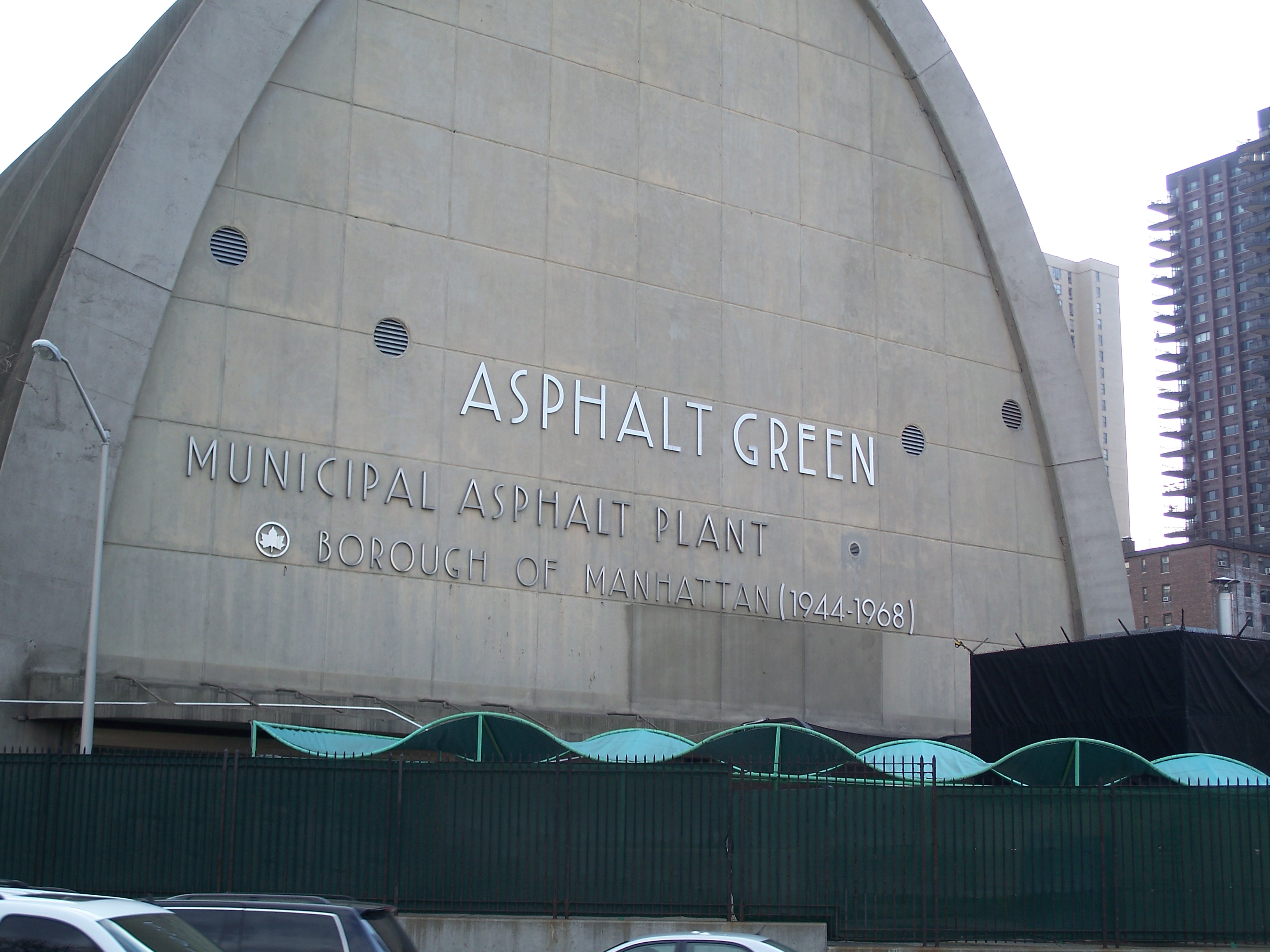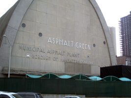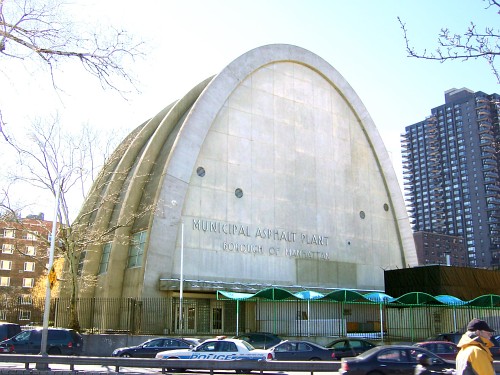 The Municipal Asphalt Plant is a post-modernist parabolic arc designed by Ely Jacques Kahn and Robert Allan Jacobs that opened in 1944. Kahn and Jacobs are also notable for the American Airlines terminal at Kennedy International Airport and their designs have cause tremendous conflict in the preservation community. In 1982, the building was repurposed and incorporated into a sports center which became the Asphalt Green Aquacenter in 1993. (reference)