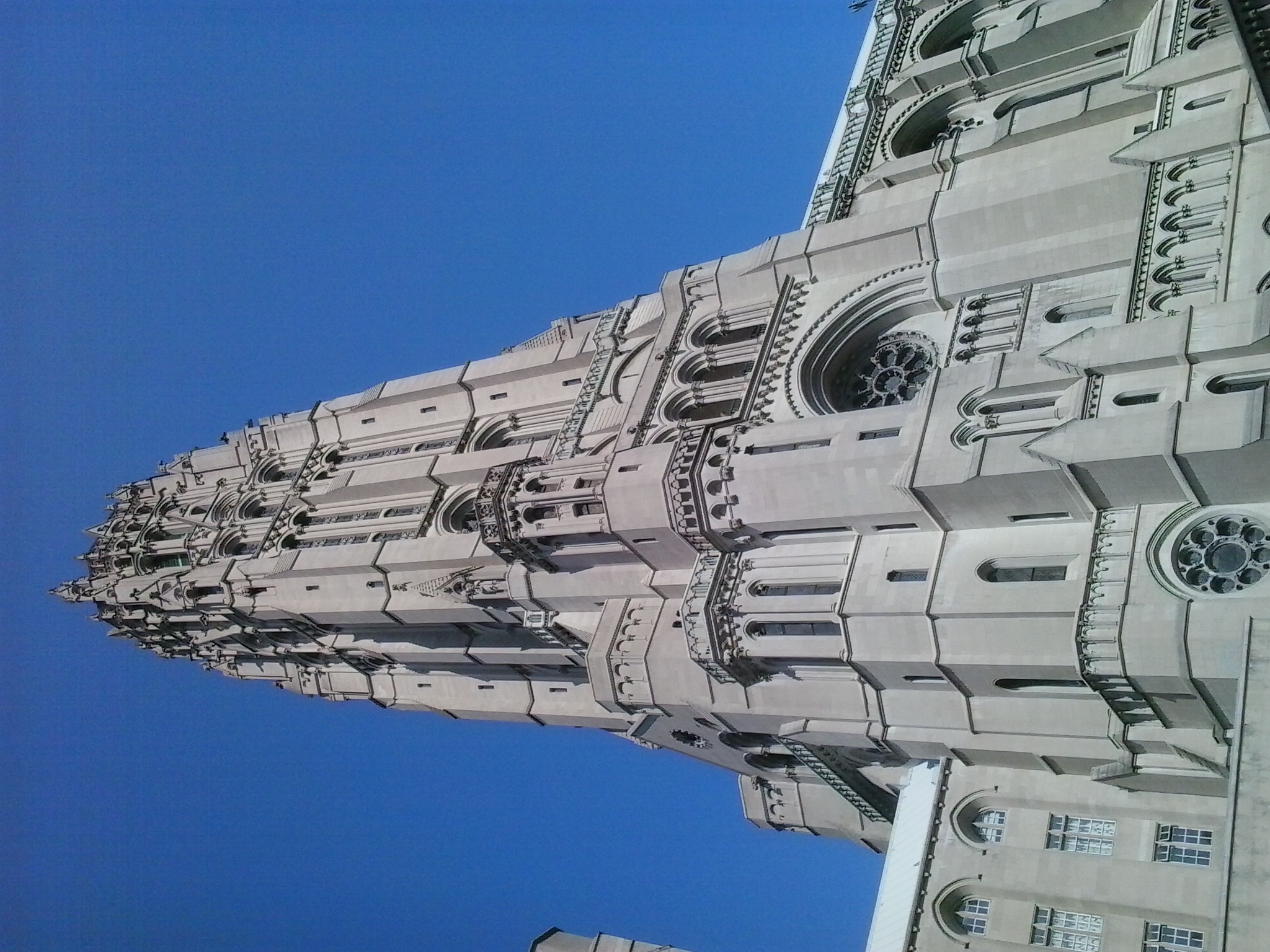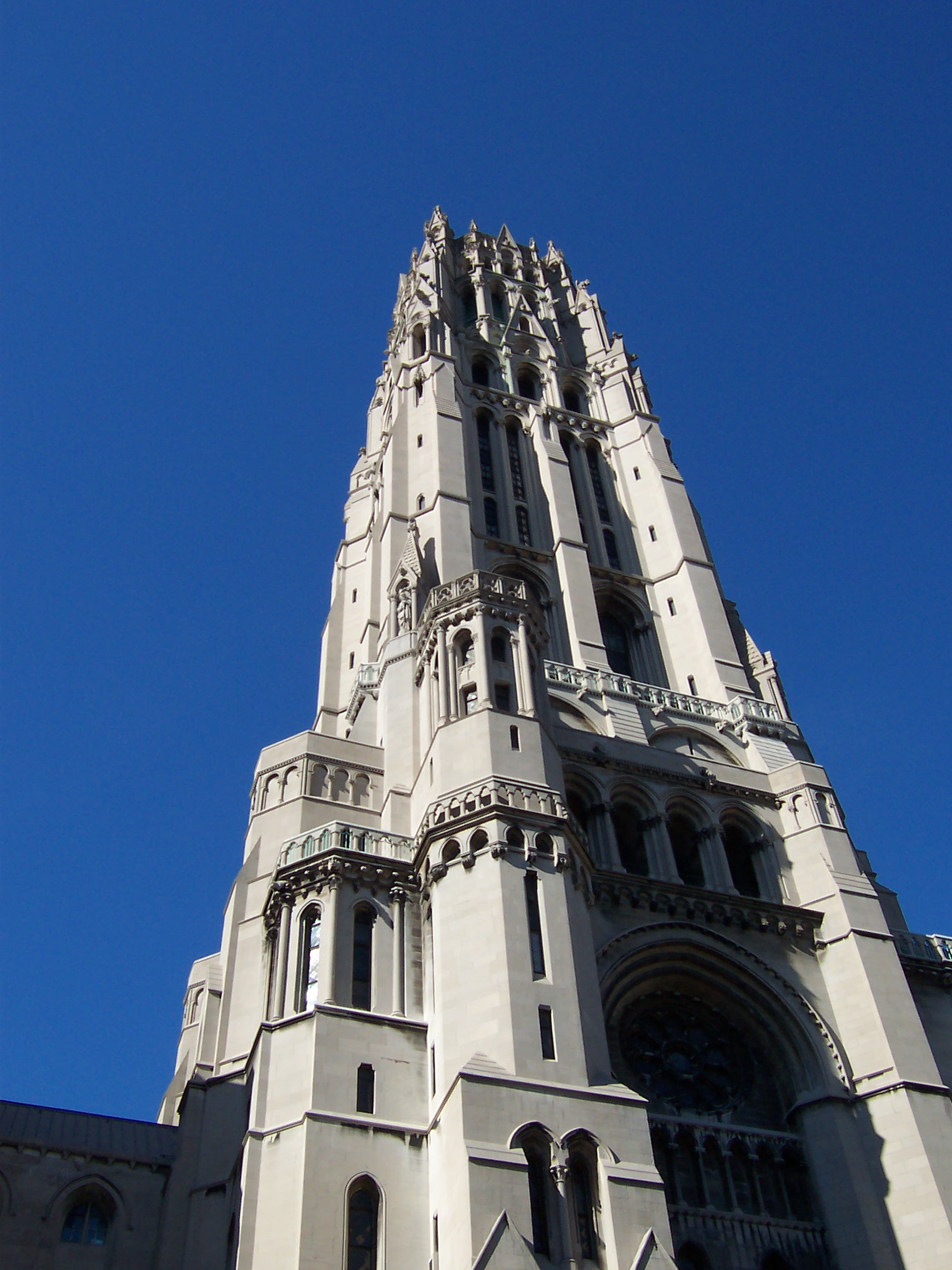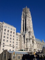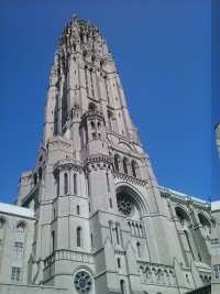 This church was built for modernist Baptist pastor Harry Emerson Fosdick by John D. Rockefeller, Jr. (1874-1960), a noted philanthropist and the only male heir of robber baron John D. Rockefeller, Sr. (1839-1937). Construction began in 1926 and the first service was held on October 5, 1930. The building was designed by Henry C. Pelton and Charles Collens (of the firm Allen, Pelton and Collens) based on the nave of the 13th Century Gothic Cathedral of Chartres, France. The church is perhaps most notable for its 392-foot bell tower. Despite its appearance as being constructed entirely of masonry, it is actually a steel-frame structure with decorative limestone buttressing.