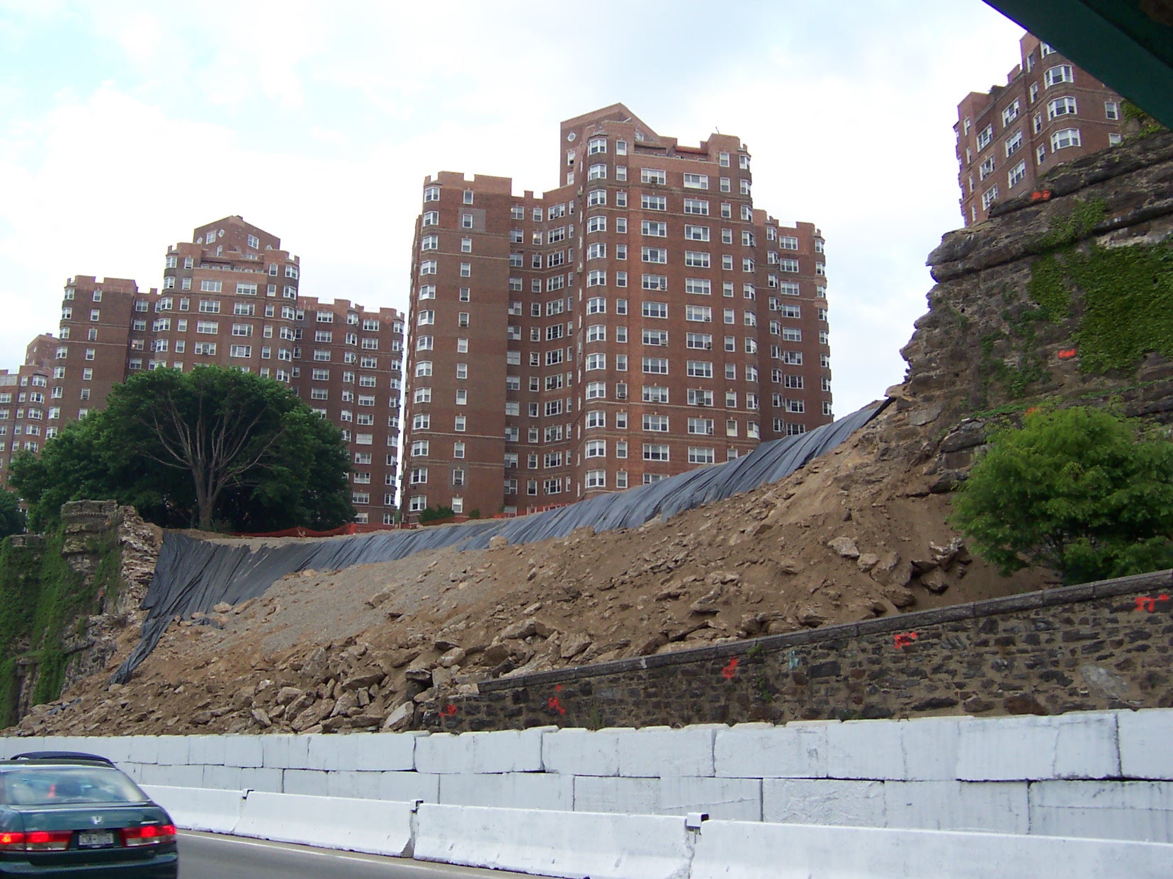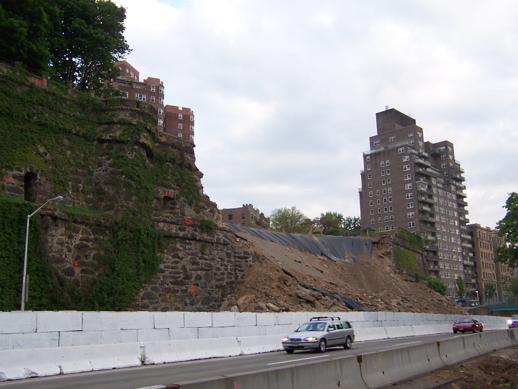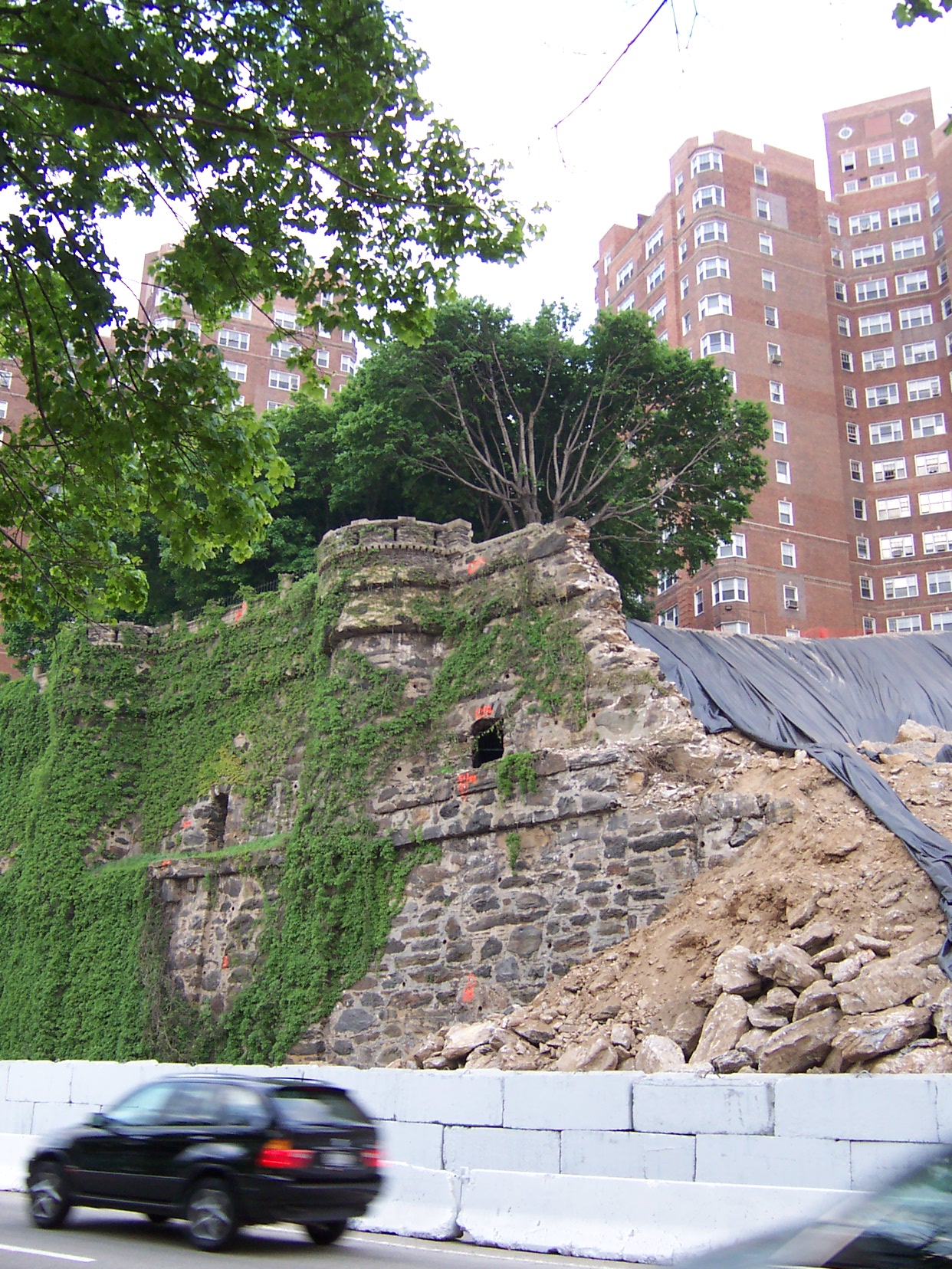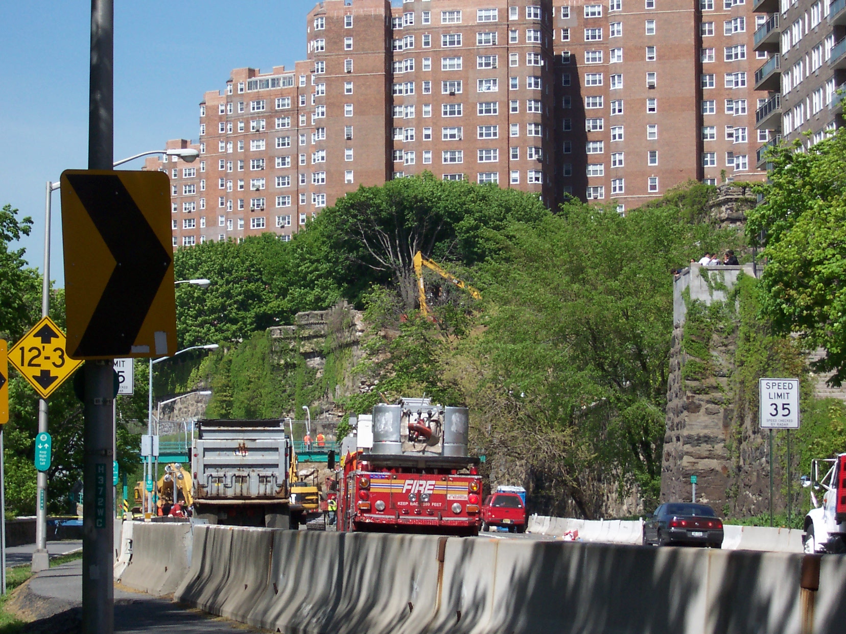 On the afternoon of May 12, 2005, a 90-foot-tall retaining wall just north of the GWB collapsed sending a torrent of rocks, dirt and trees across the Henry Hudson Parkway below. The wall was built around 1908 and supported a small private park between high-rise buildings on Cabrini Boulevard. Serendipitously, I had passed that wall a month earlier and, struck by it's age and fearsome height, took some photos of it. After the fall, I returned on Friday the 13th and the following Monday, after much of the spillage had been cleaned up and stabilized.