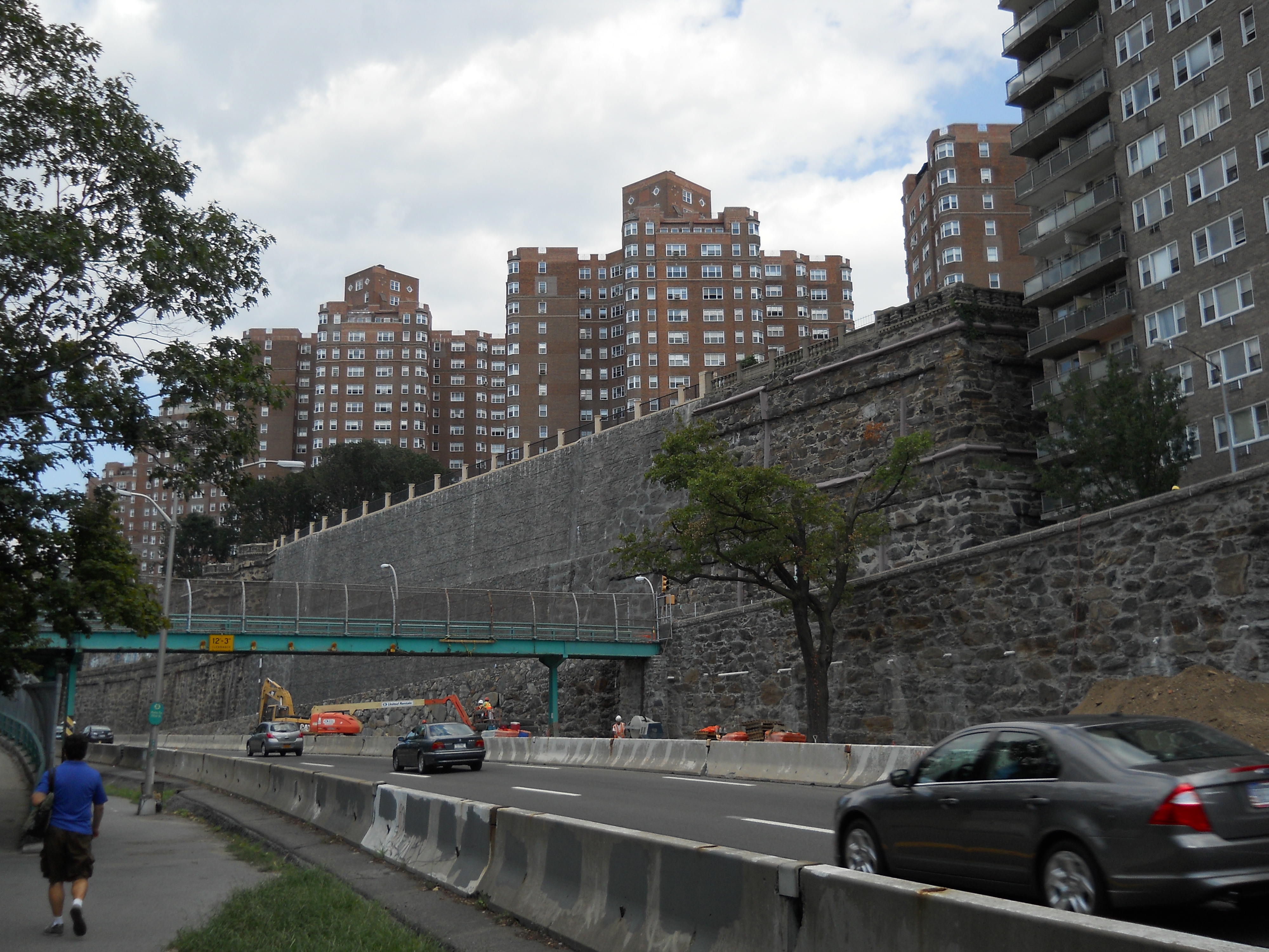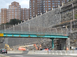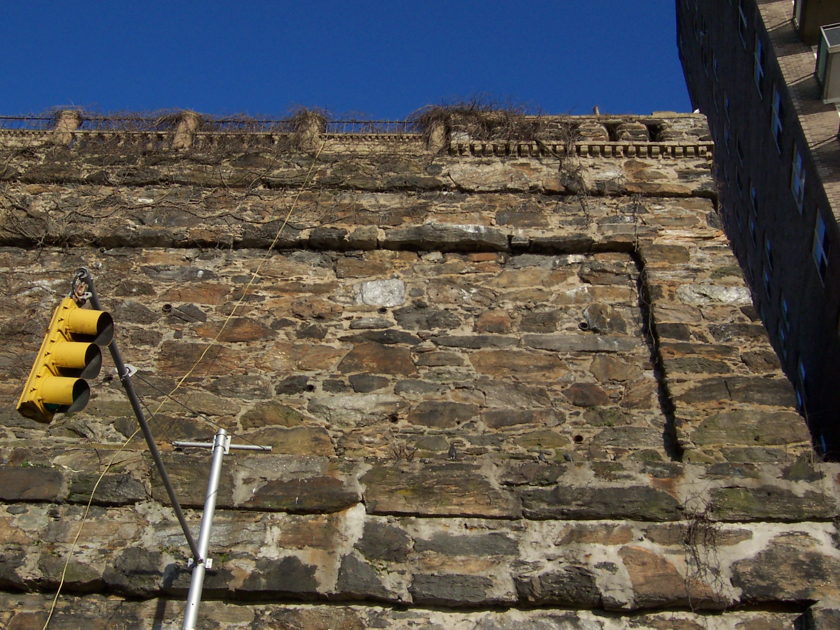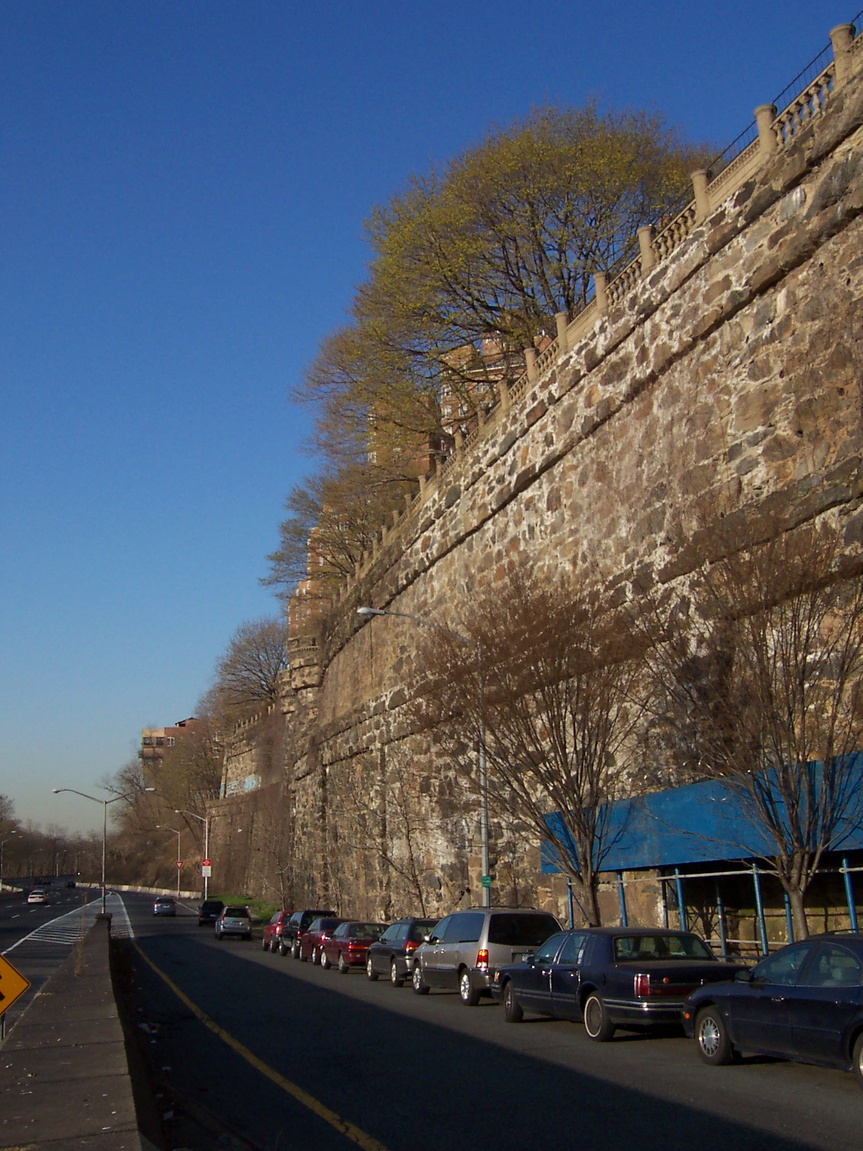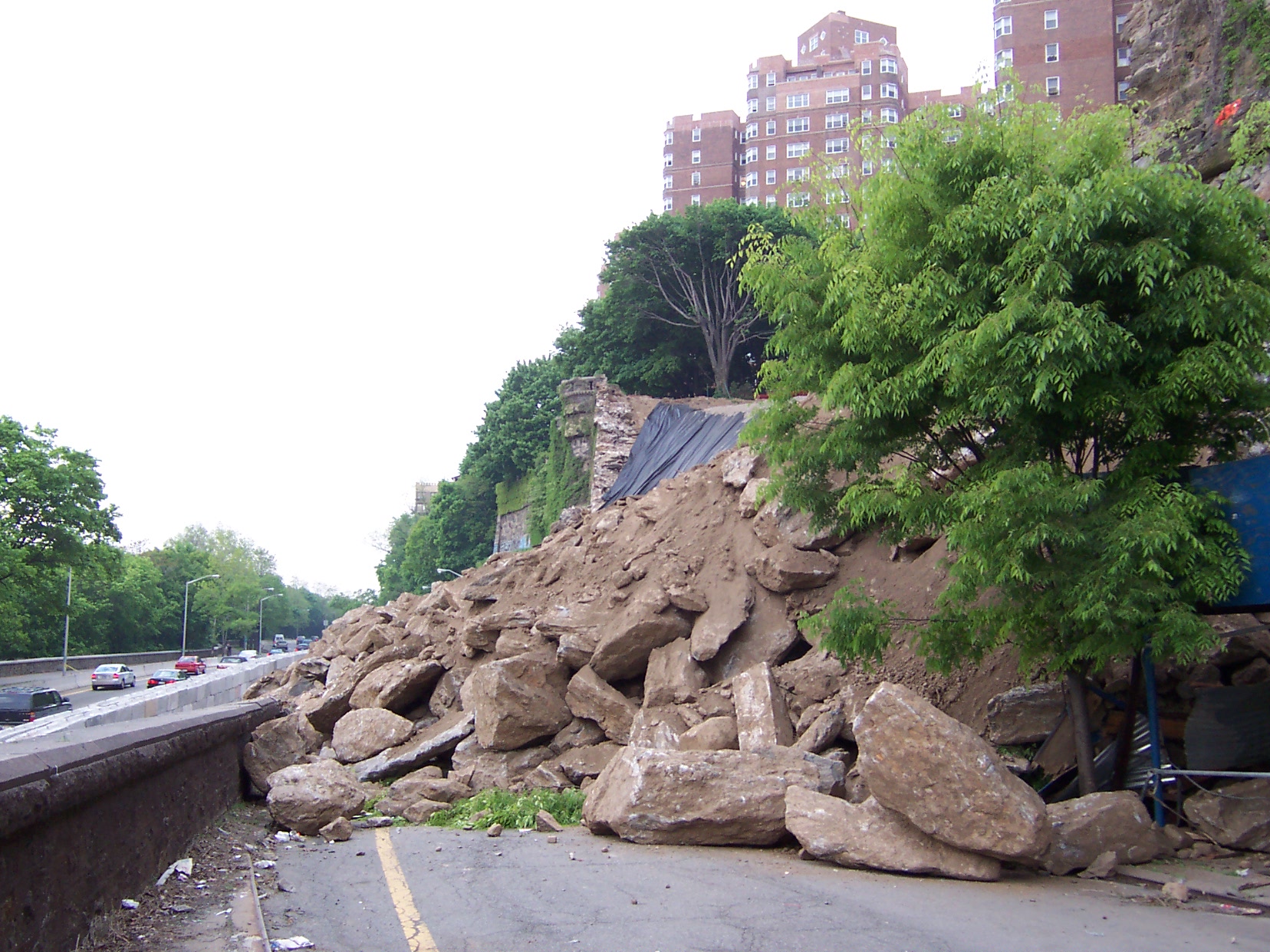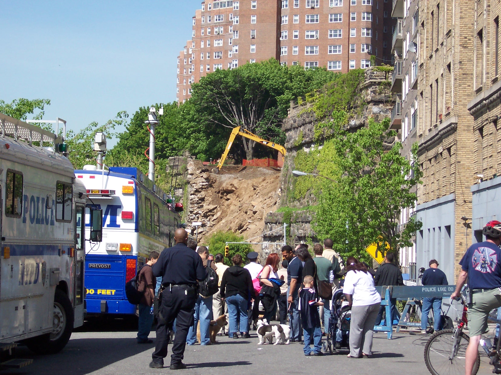 On the afternoon of May 12, 2005, a 90-foot-tall retaining wall just north of the GWB collapsed sending a torrent of rocks, dirt and trees across the Henry Hudson Parkway below. The wall was built around 1908 and supported a small private park between high-rise buildings on Cabrini Boulevard. Serendipitously, I had passed that wall a month earlier and, struck by it's age and fearsome height, took some photos of it. After the fall, I returned on Friday the 13th and the following Monday, after much of the spillage had been cleaned up and stabilized.