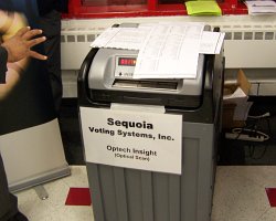 Sequoia is offering both a touch-screen (DRE) and paper-ballot / optical-scan (PBOS) system. Sequoia is a New York-based company that started in 1905 and is the provider for the current absentee voting tabulating equipment. They provided the original lever machines and are deeply embedded in the New York election process. In fact, the DRE is designed to be operated by poll-workers and voters with almost the same controls and procedures as the current lever machines. The DRE paper trail is a strip of paper along the right side of the touch-screen, so similar to the Avante machine that Avante is suing Sequoia. The alternative ballot scanner is operated in a manner almost identical to the Diebold and ES&S machines - in the words of the sales rep, "Optical scan is optical scan."
